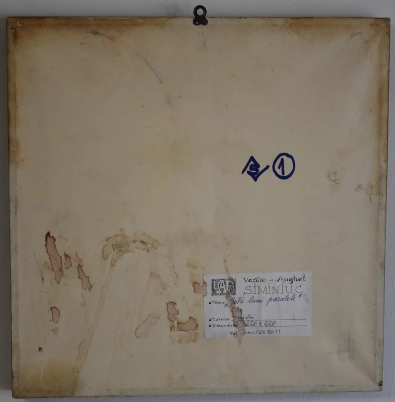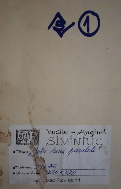 Lucrare contemporană în tehnică mixtă semnată de artistul sucevean Anghel Vasile Siminiuc, membru al Uniunii Artiștilor Plastici. Între lumi paralele este o compoziție simbolică și conceptuală, în care artistul explorează relația dintre planurile vizibile și cele invizibile, dintre real și imaginar.