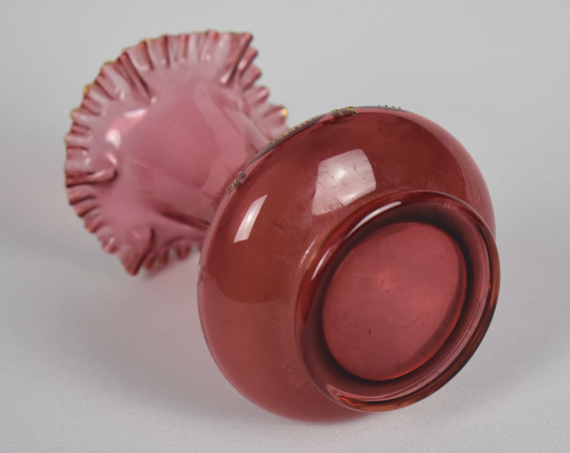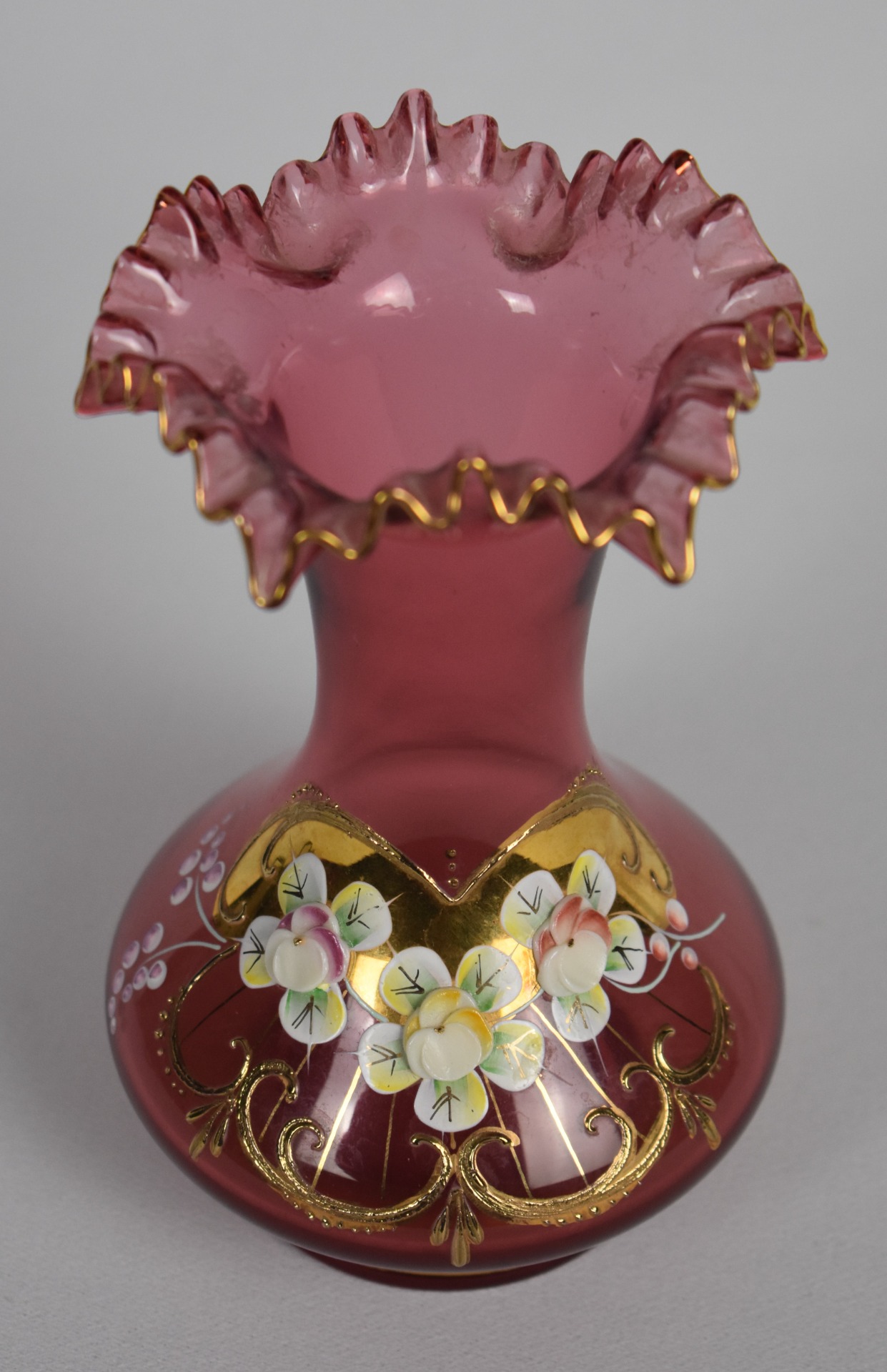 Culoarea rubinie, obținută prin tehnici tradiționale boeme (folosind oxizi de aur), oferă vazei profunzime cromatică și reflexii calde, iar combinația cu decorul aurit subliniază caracterul luxos și ornamental al obiectului.