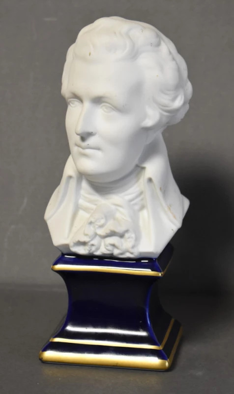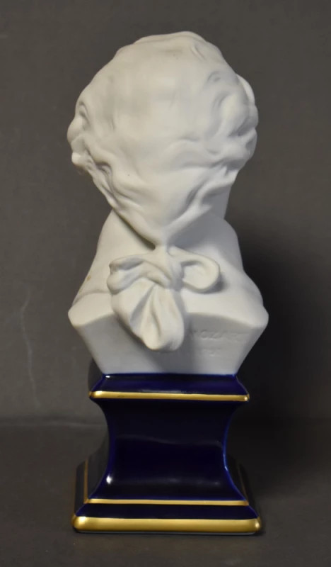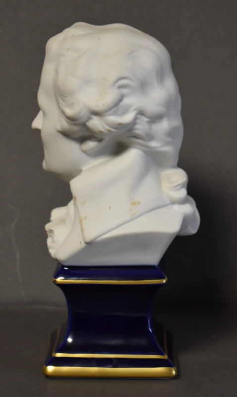 Rafinat bust reprezentându-l pe compozitorul Wolfgang Amadeus Mozart, realizat din porțelan fin Limoges, Franța, una dintre cele mai prestigioase manufacturi europene de porțelan artistic. Piesa surprinde cu sensibilitate trăsăturile delicate și expresia sobră ale marelui compozitor, în spiritul portretisticii clasice.