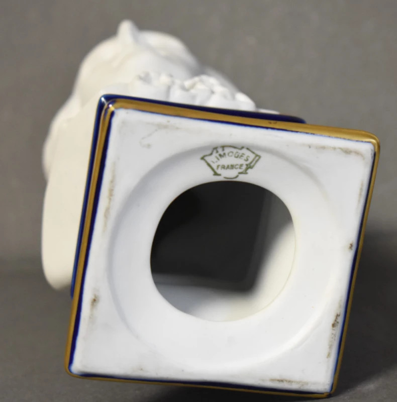 Bustul este finisat în porțelan alb mat, atent modelat, montat pe un soclu elegant emailat în albastru cobalt cu accente aurii, conferind obiectului un contrast cromatic nobil și echilibrat. Calitatea modelajului și a glazurii evidențiază măiestria manufacturii Limoges, recunoscută internațional pentru rafinament și durabilitate.