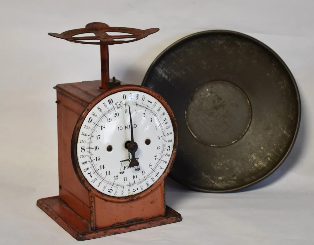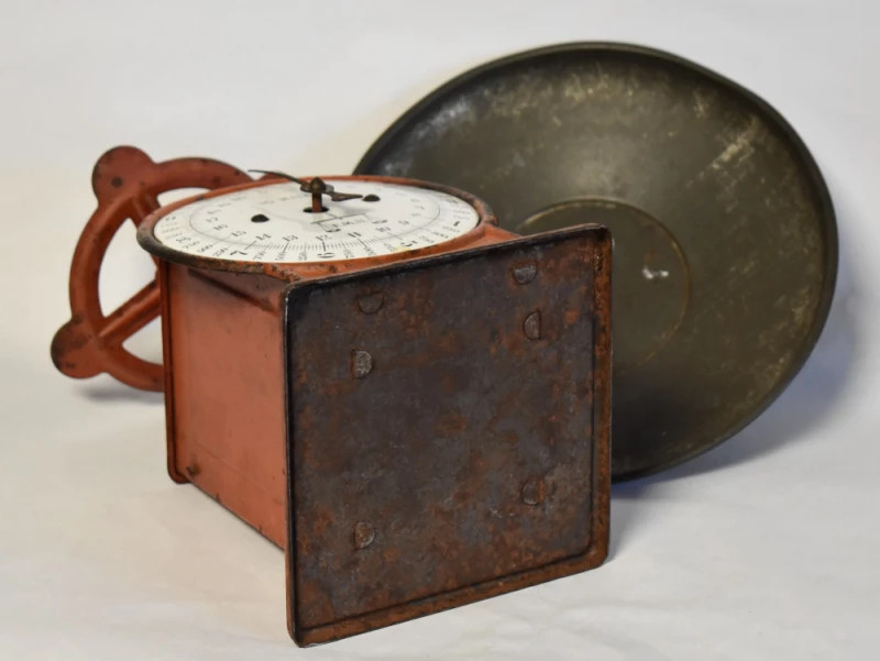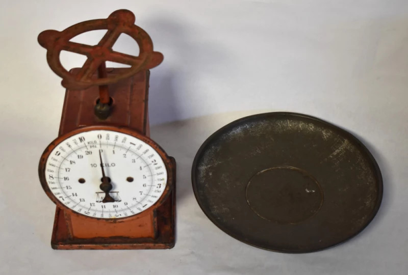 Cântar vechi de masă, cu capacitate de 10 kg, realizat în jurul anului 1900, de producătorul F.M.N., piesă utilitară autentică destinată uzului comercial și gospodăresc. Este prevăzut cu cadran emailat de mari dimensiuni, cu gradații clare și citire facilă, element esențial pentru cântărirea precisă în prăvălii, băcănii sau ateliere de epocă.