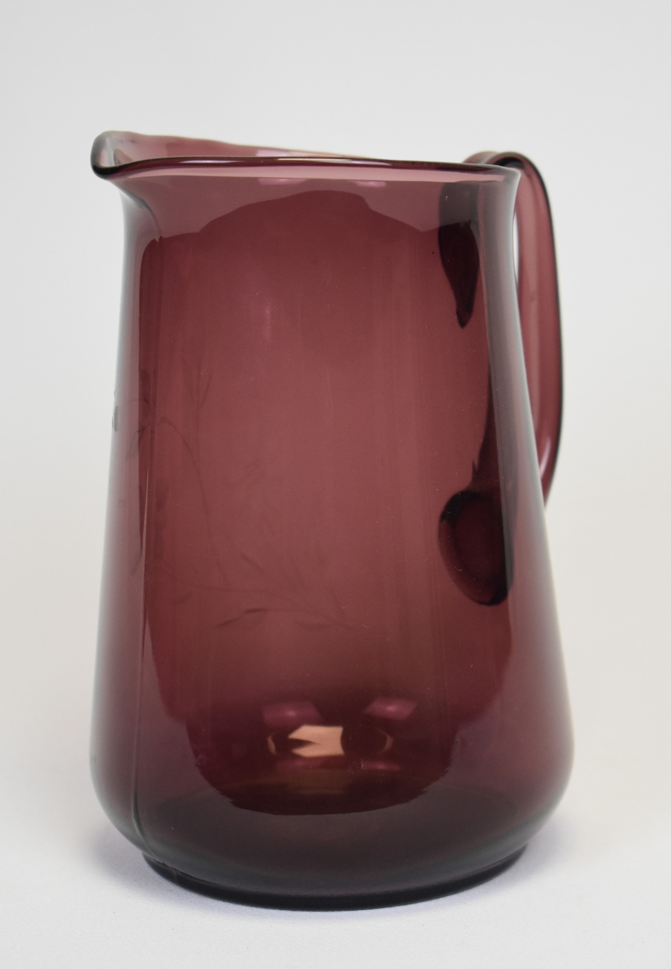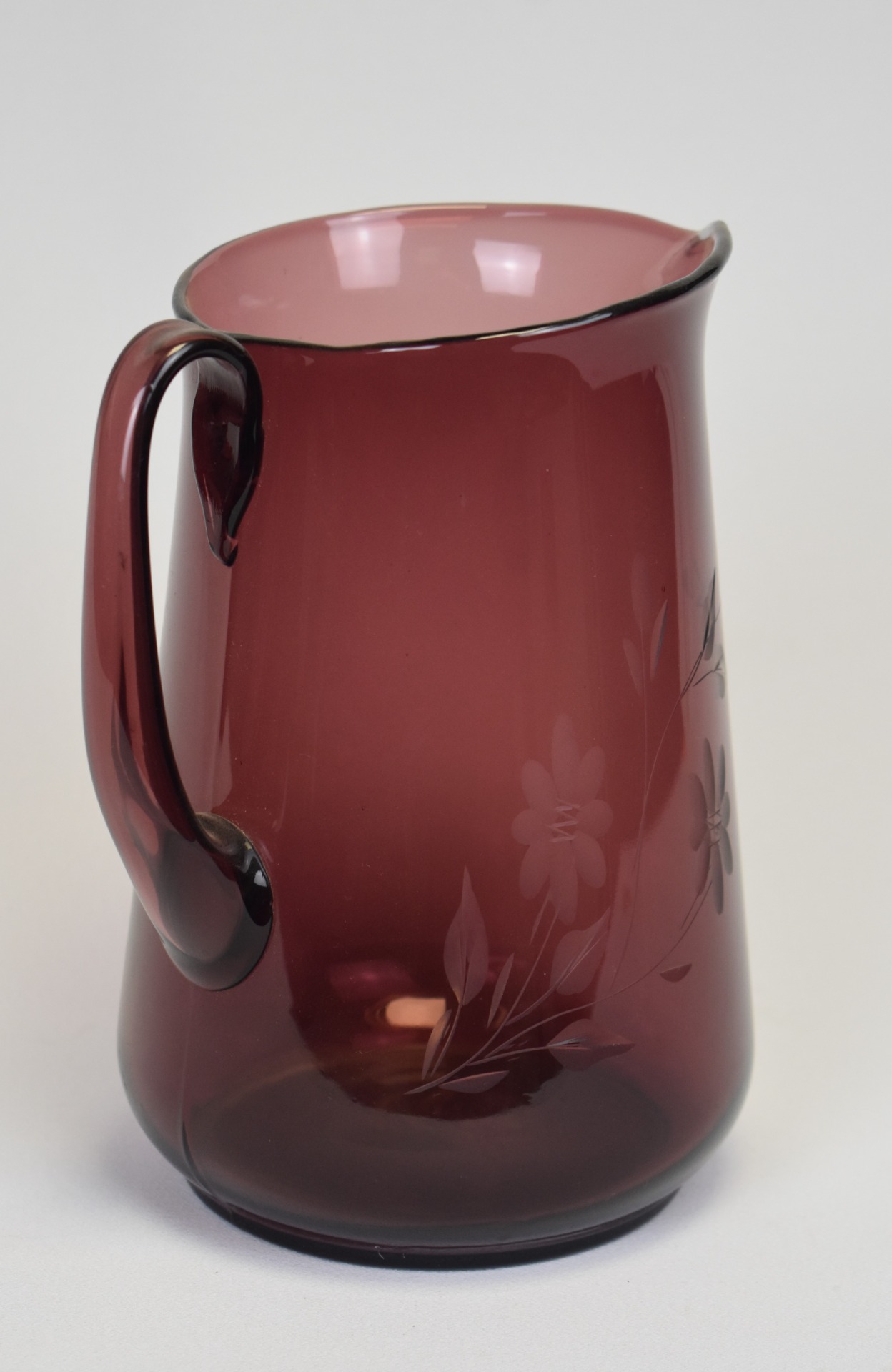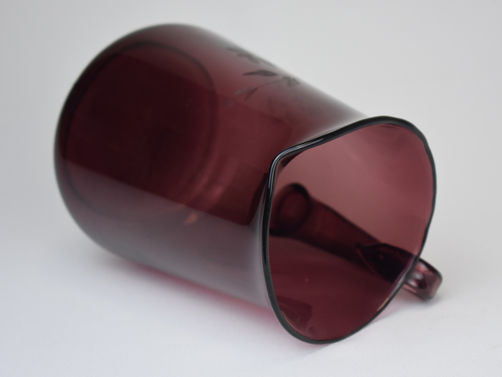 Această carafă elegantă din sticlă brun-rubinie, realizată în jurul anului 1940, surprinde rafinamentul discret al obiectelor de uz cotidian din prima jumătate a secolului XX. Forma sa suplă, cu profil ușor evazat, toartă arcuită și gură delicat conturată, este completată de un decor floral gravat manual, vizibil în lumină oblică – un detaliu subtil, rezervat privirii atente.
