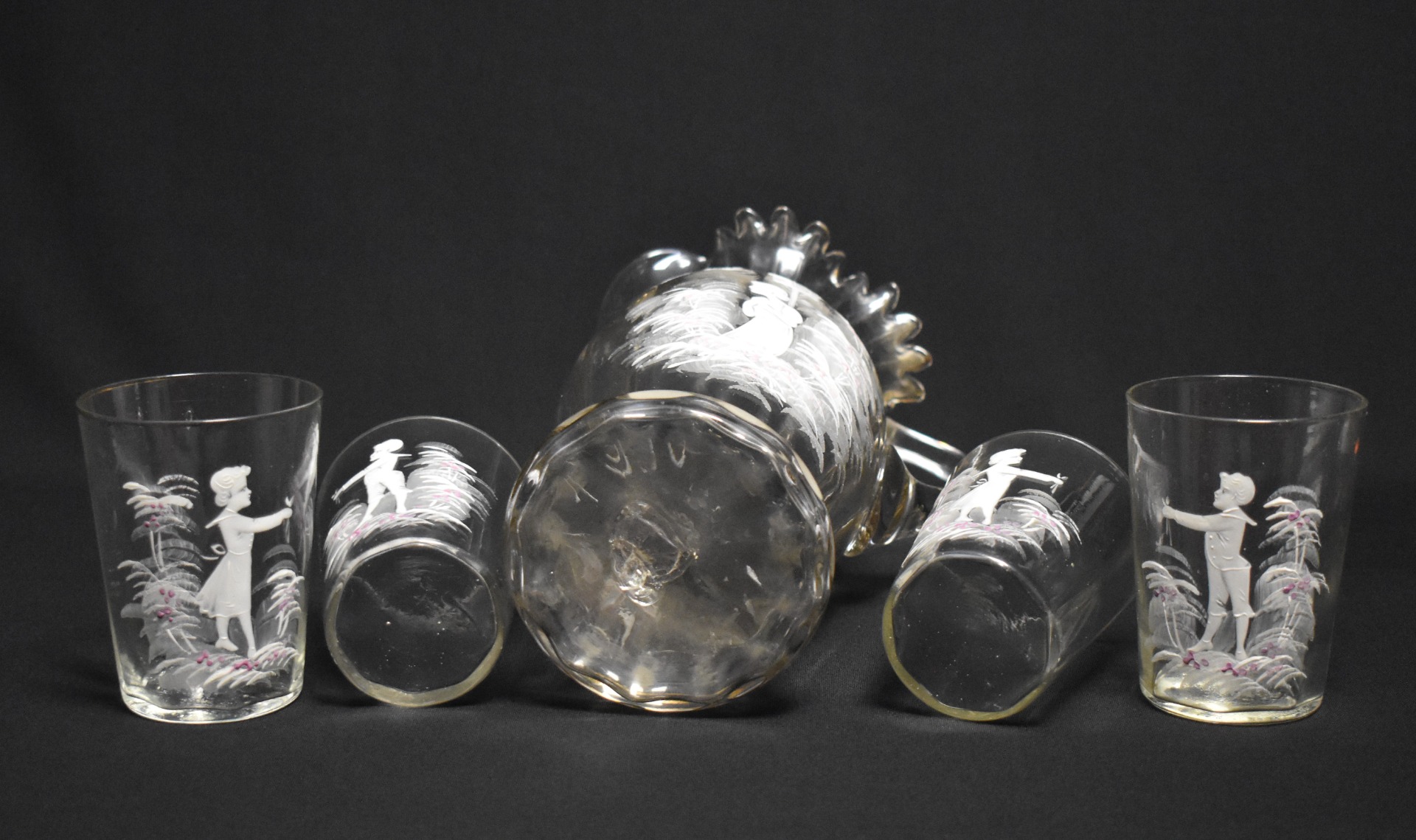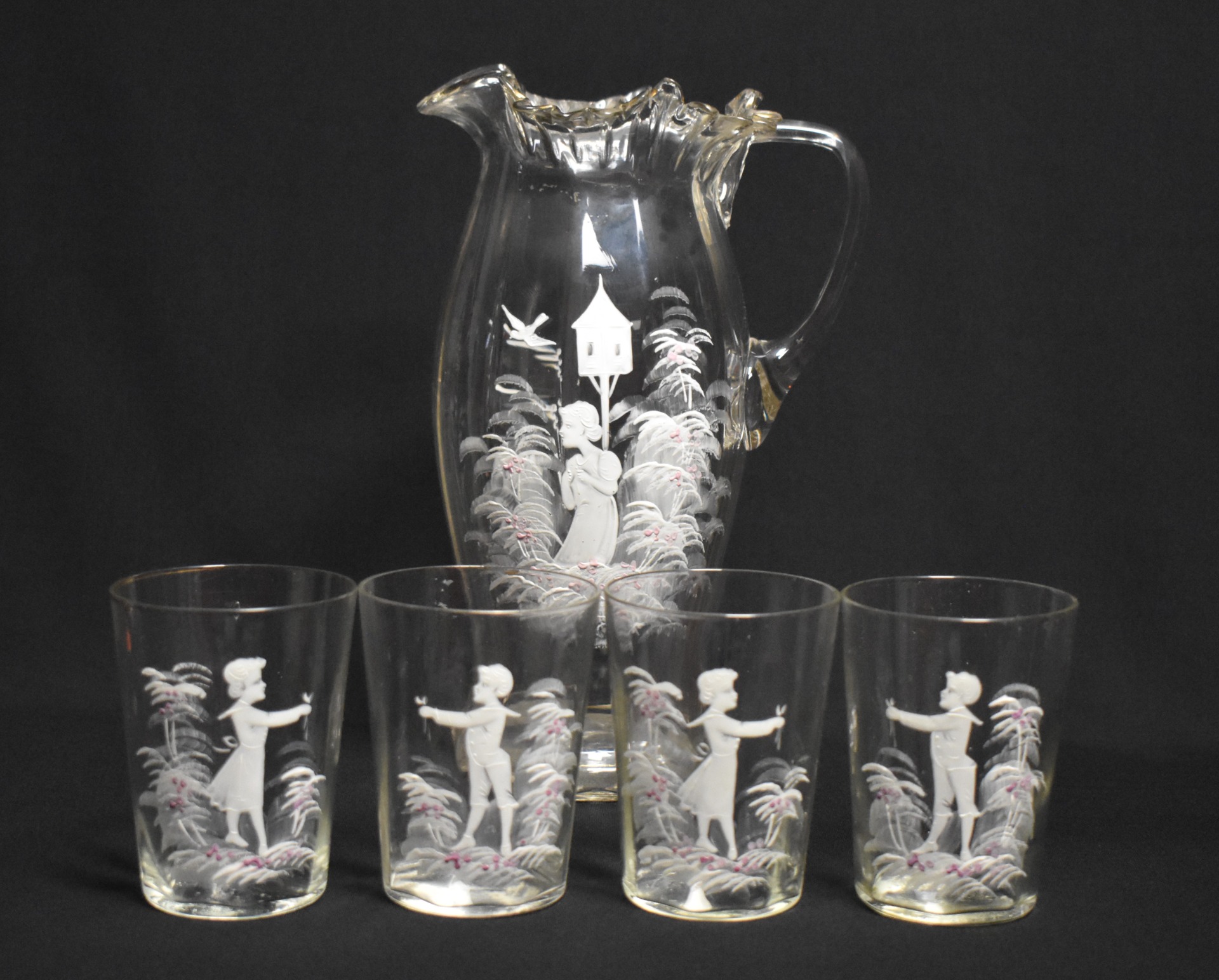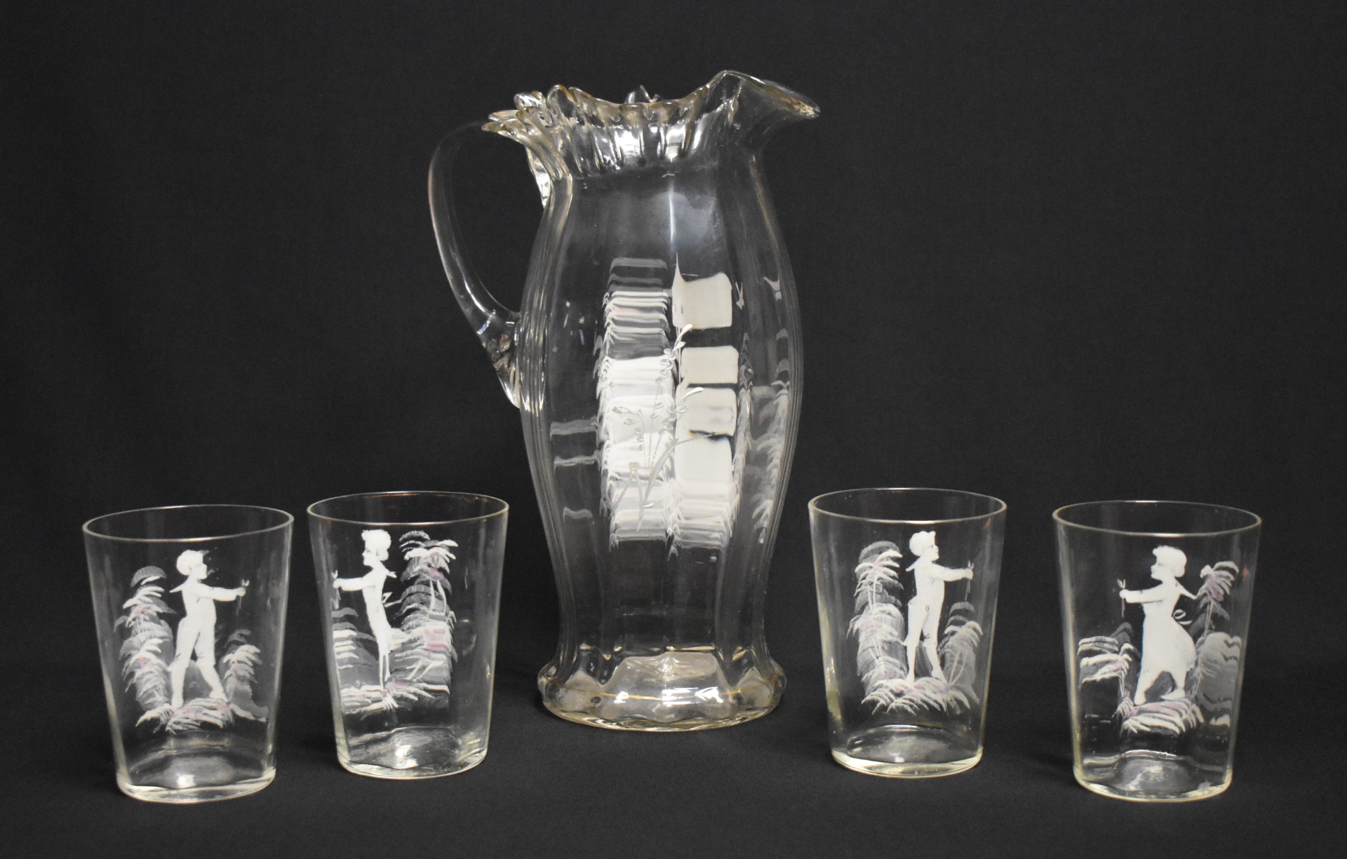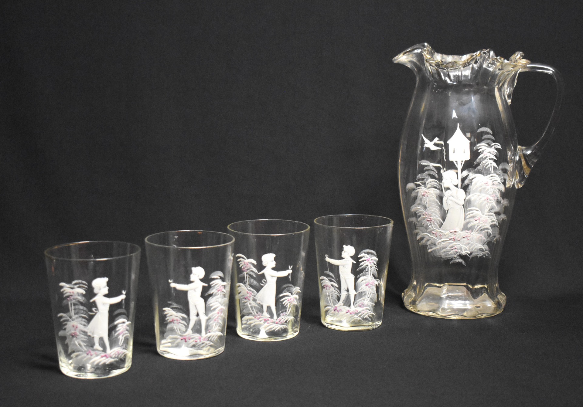 Set elegant din sticlă Boemia de la începutul secolului XX, realizat în cunoscuta tehnică Mary Gregory, caracterizată prin pictură emailată albă reprezentând siluete, personaje și motive vegetale stilizate. Carafa cu gura evazată și toartă grațioasă este însoțită de patru pahare asortate, toate decorate în manieră unitară.