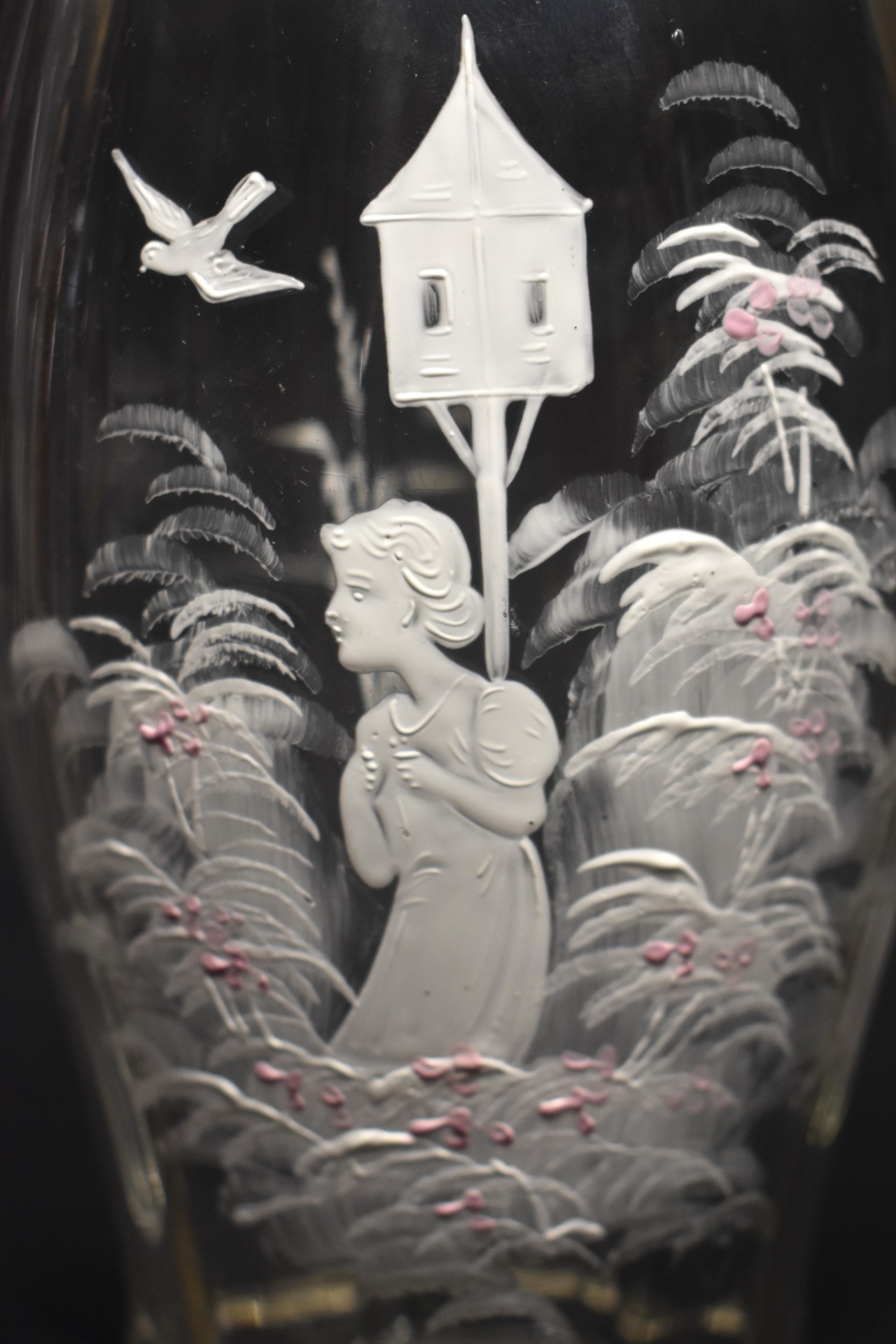 Transparența fină a sticlei și decorul pictat manual conferă piesei un farmec romantic și rafinat, tipic saloanelor europene de la circa 1900. Setul este ideal ca obiect de colecție sau ca piesă decorativă deosebită.