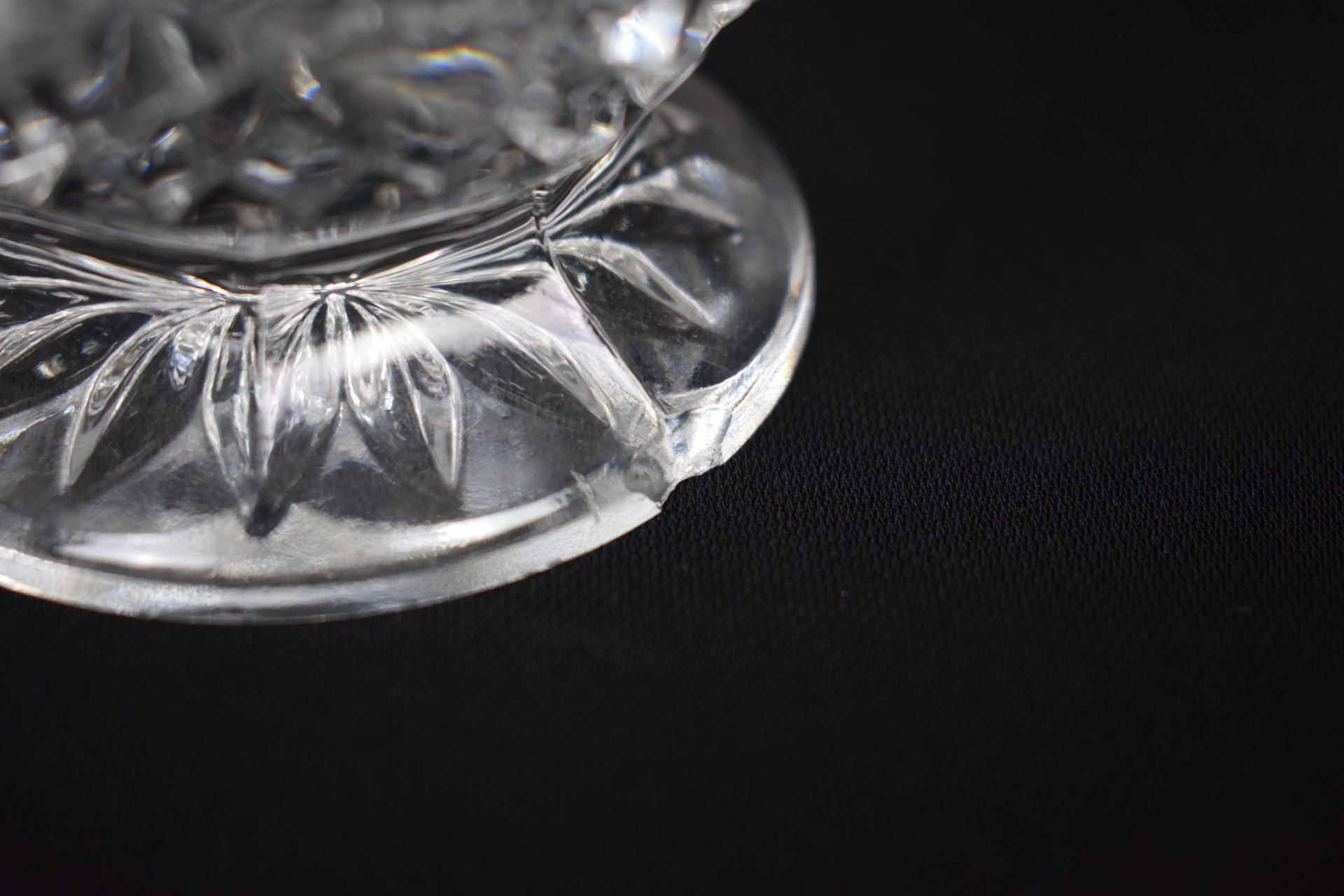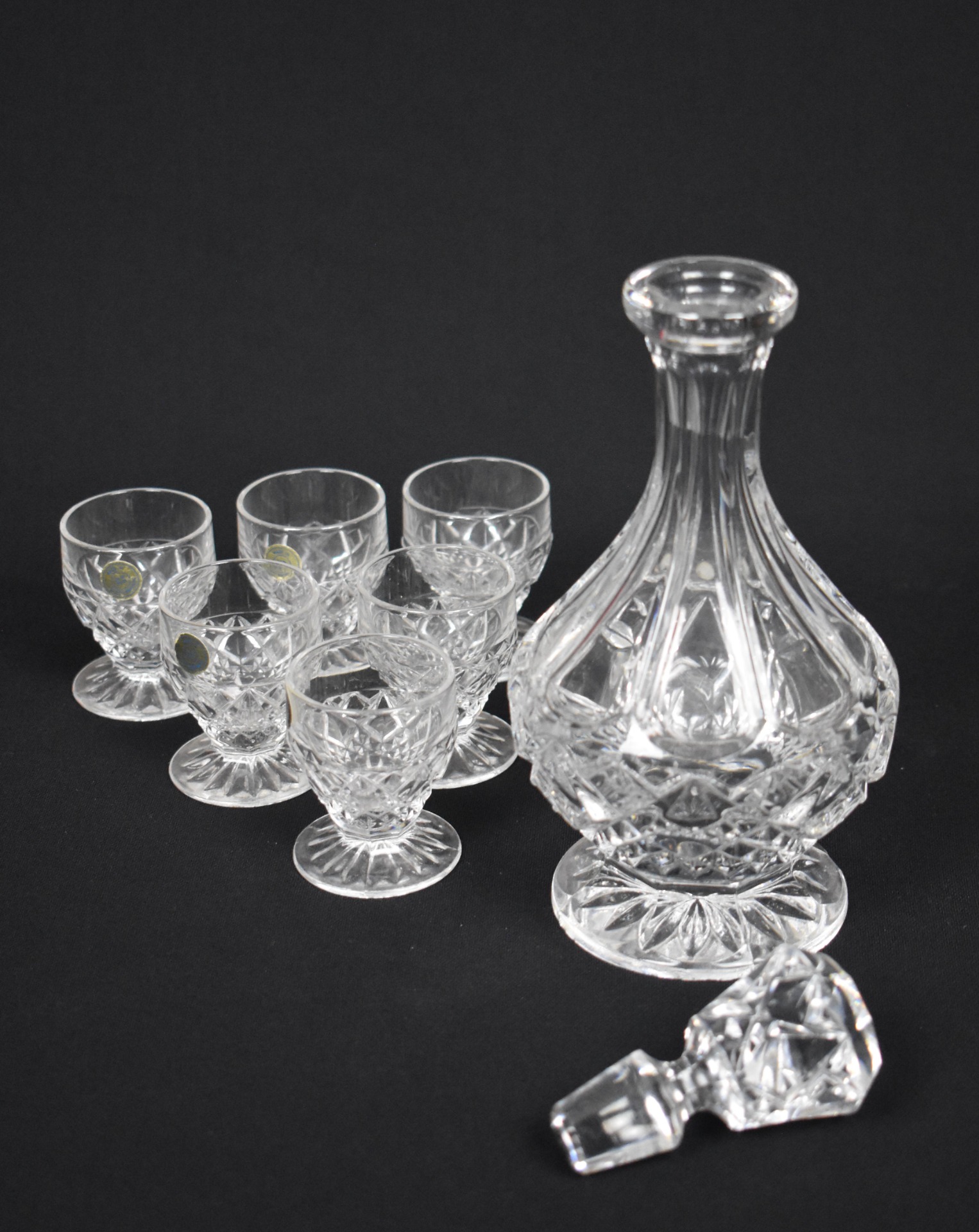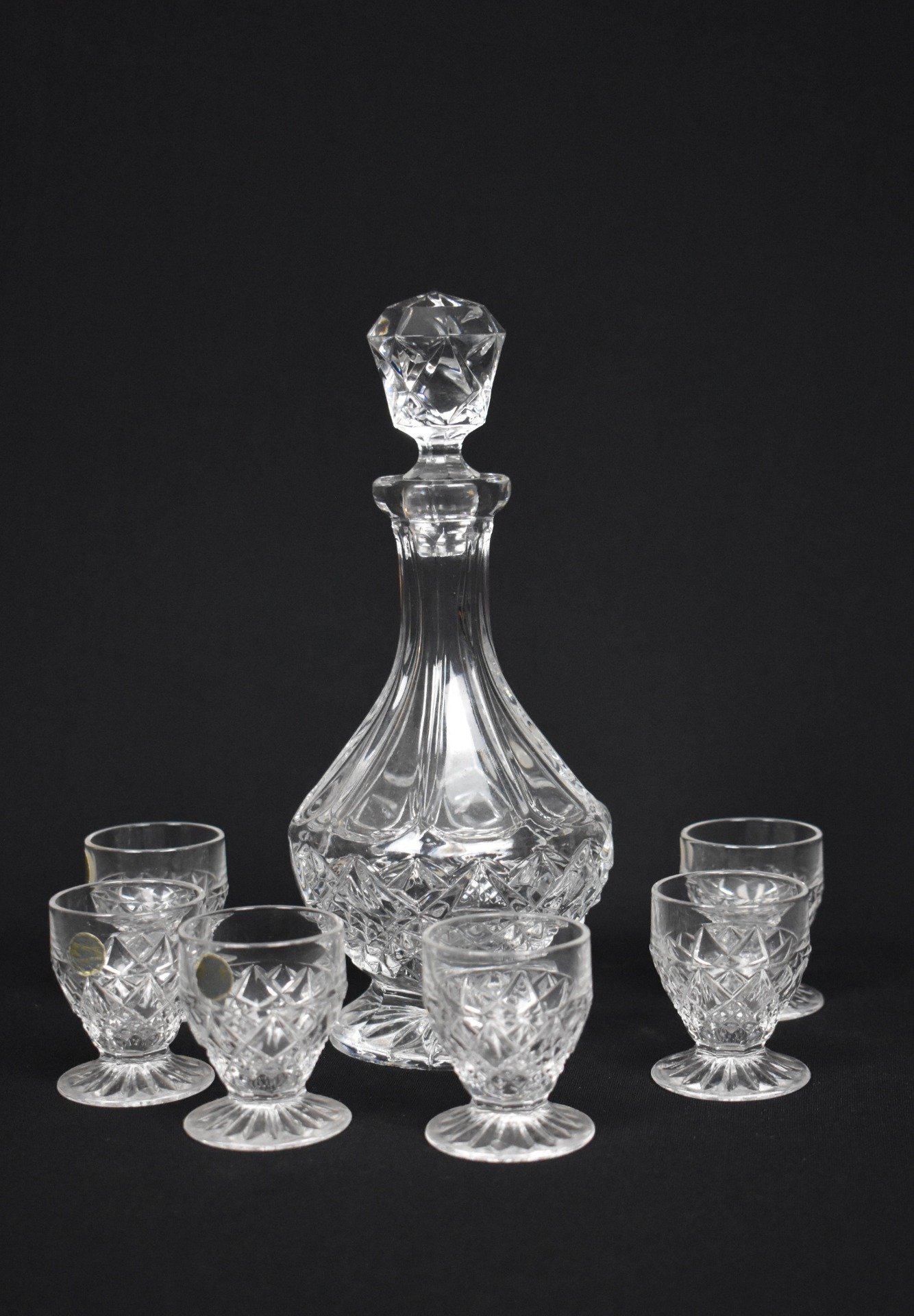 Carafa are o siluetă grațioasă, cu bază amplă, corp fațetat și dop masiv din cristal tăiat, perfect proporționat. Paharele, pe picior scurt, păstrează același tipar decorativ, formând un ansamblu coerent și rafinat, ideal pentru servirea lichiorurilor, aperitivelor sau băuturilor fine.