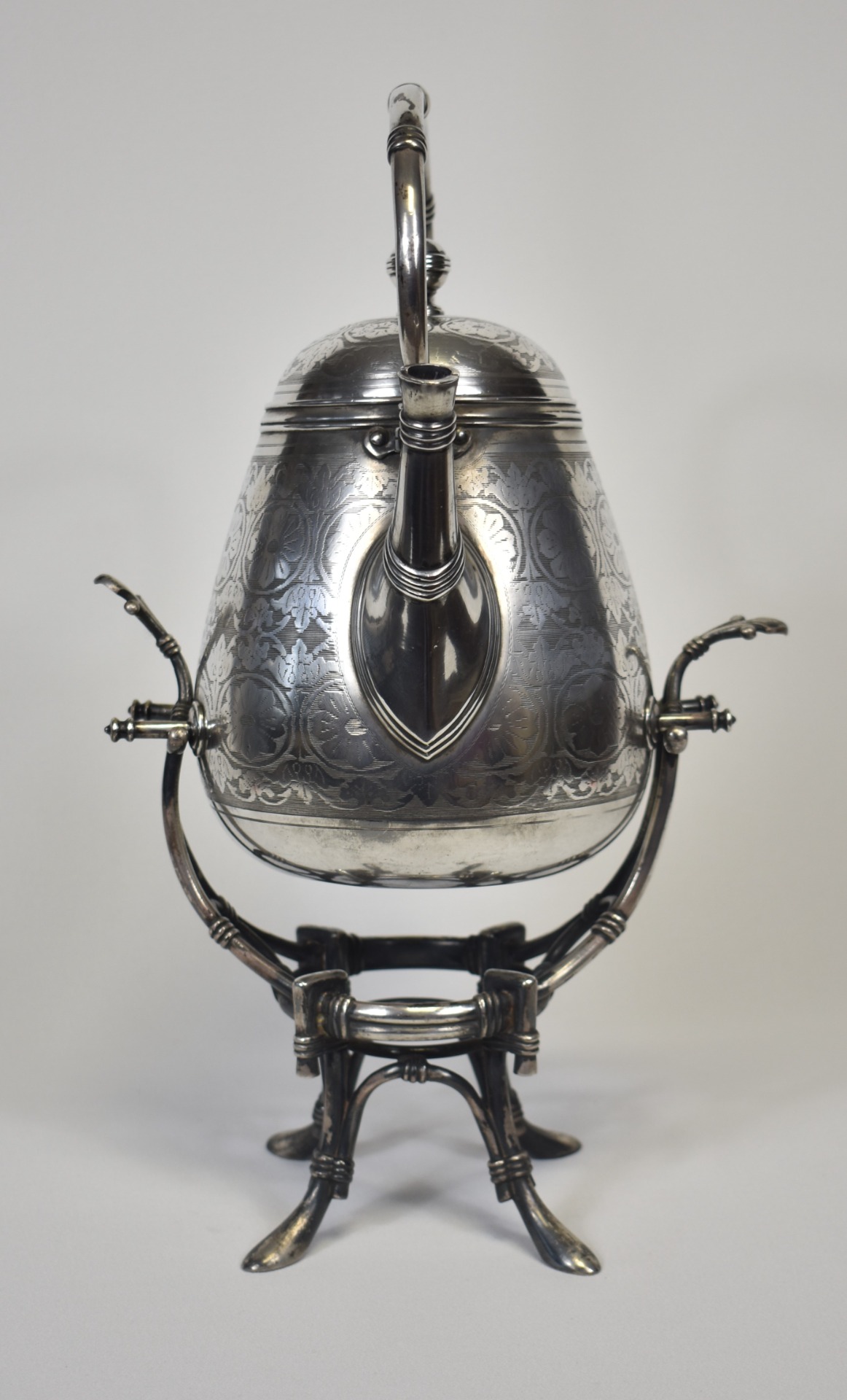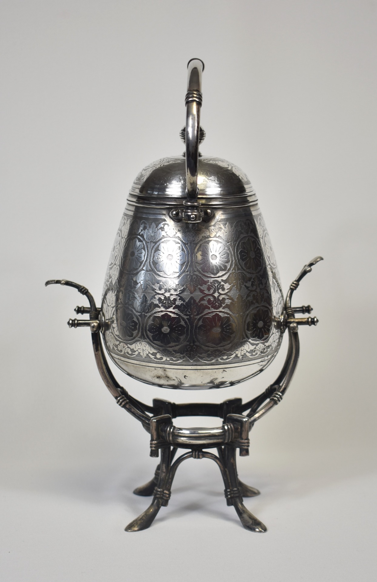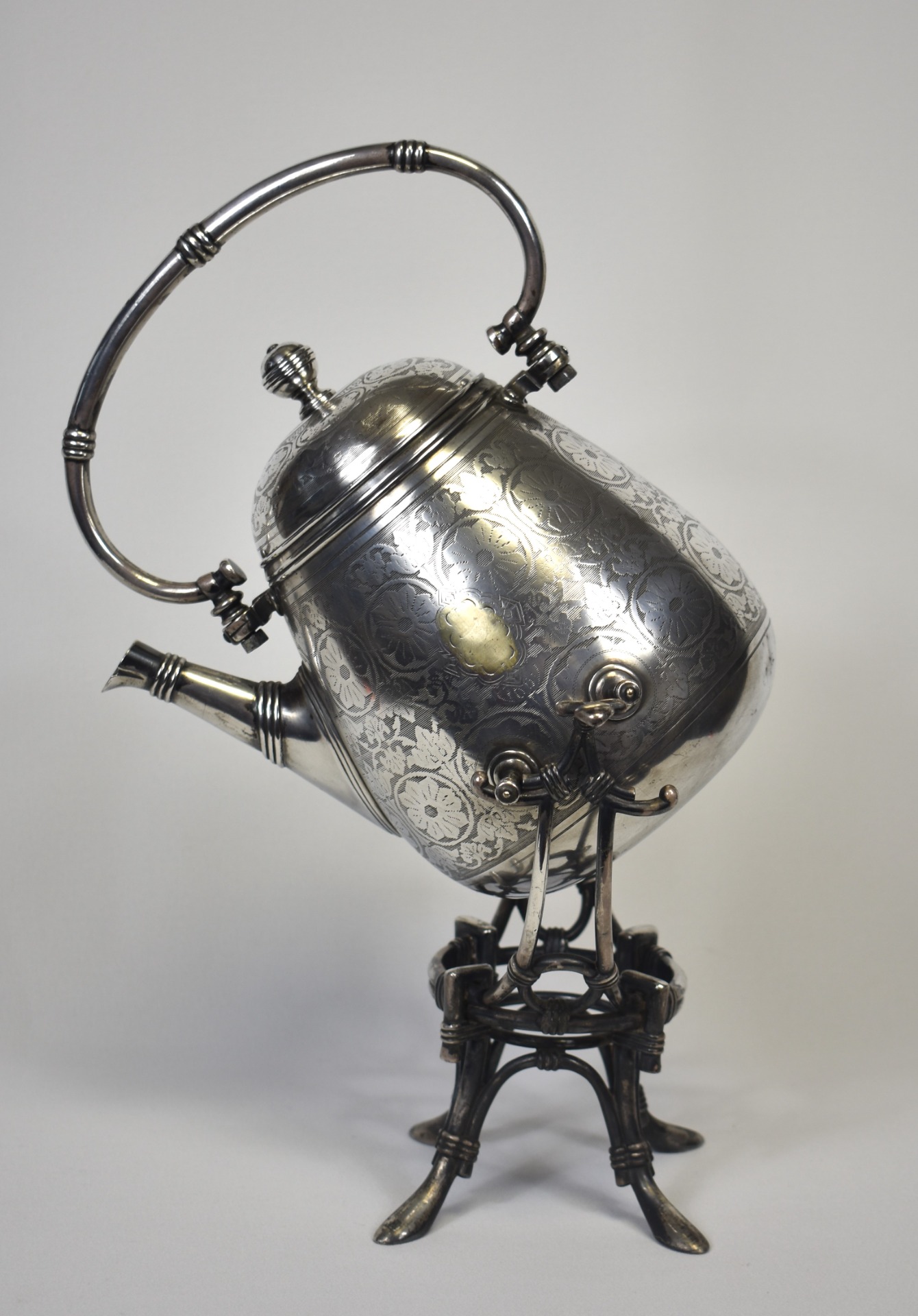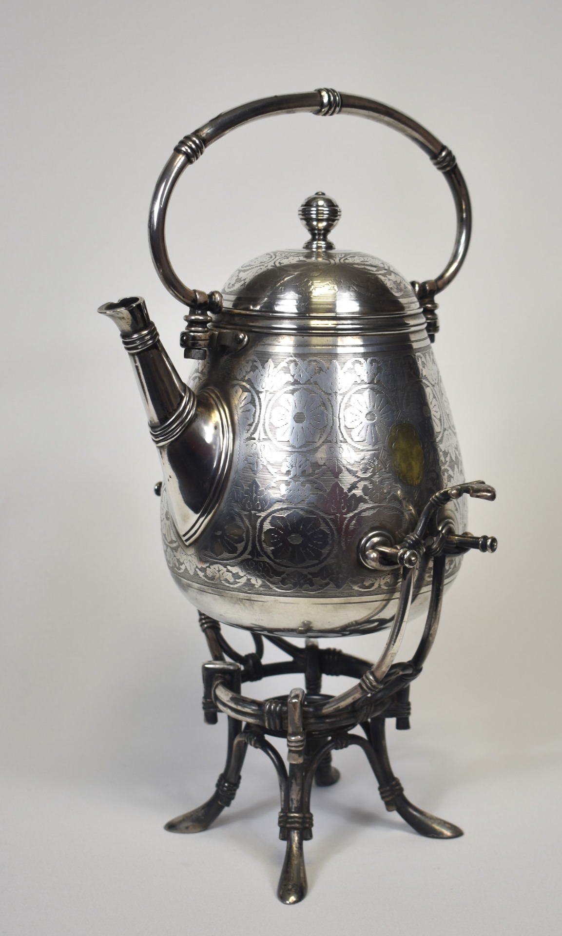 Suprafața din metal argintat este decorată cu motive florale gravate fin, dispuse într-un ritm ornamental armonios, iar în zona frontală se remarcă un cartuș oval pregătit pentru monogramă – un detaliu care sugerează destinația sa inițială ca piesă de prestigiu, posibil comandată pentru un interior nobil sau o casă burgheză înstărită. Capacul bombat, cu buton elegant, și toarta arcuită articulată completează linia curgătoare a ansamblului, adăugând atât funcționalitate, cât și rafinament vizual.