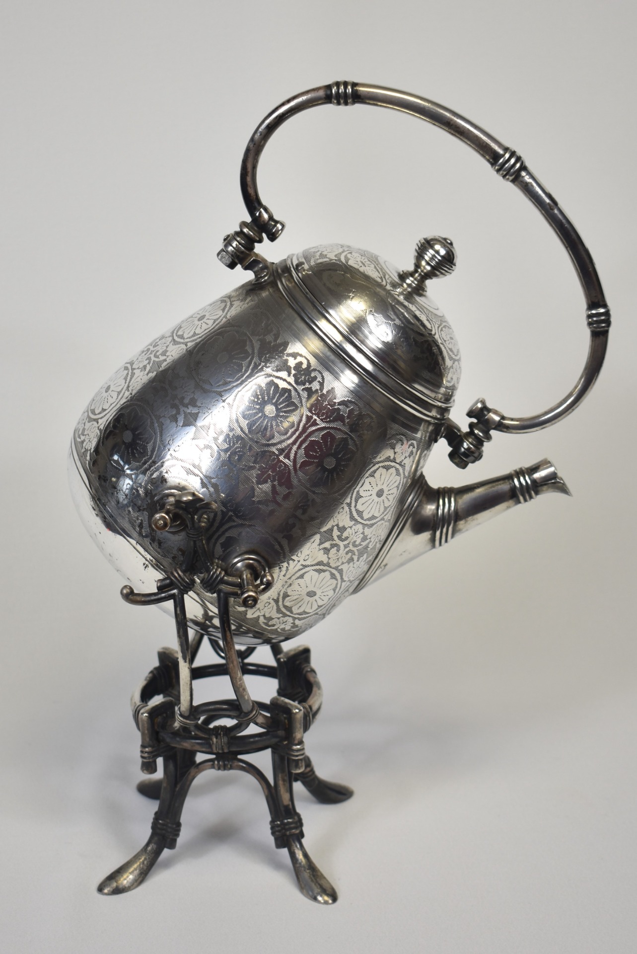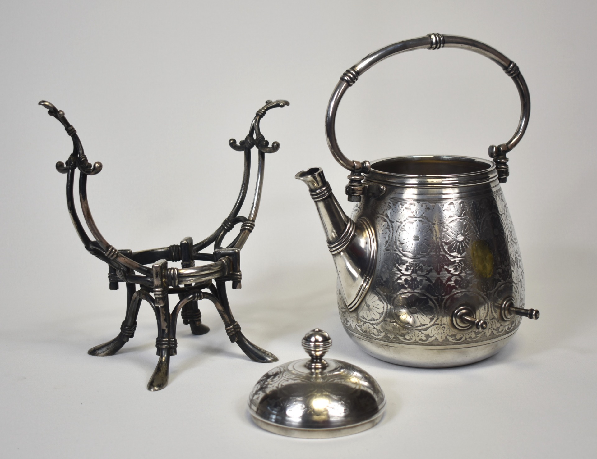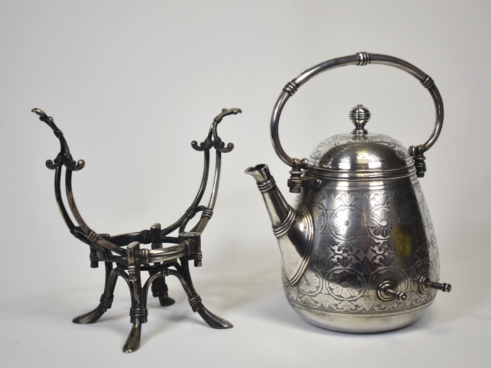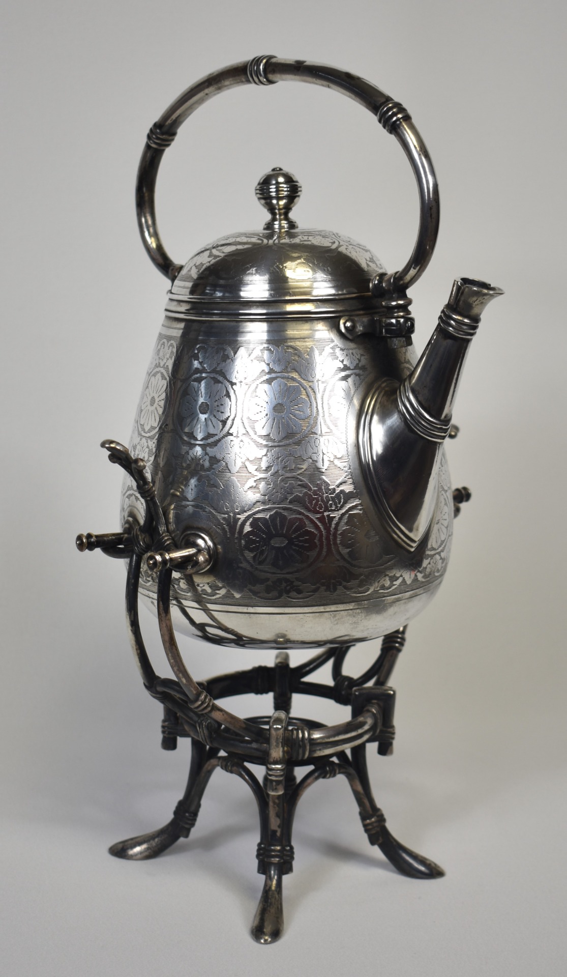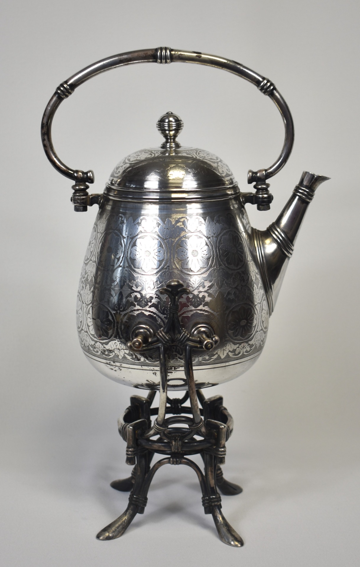Acest samovar–ceainic cu suport, realizat de renumitul atelier Fraget din Varșovia, este o piesă de o eleganță monumentală, emblematică pentru rafinamentul Europei Centrale de la sfârșitul secolului al XIX-lea. Silueta sa amplă, cu corp bombat și proporții perfect echilibrate, evocă fastul saloanelor aristocratice și ritualul solemn al ceaiului, atât de prețuit în epocă.
