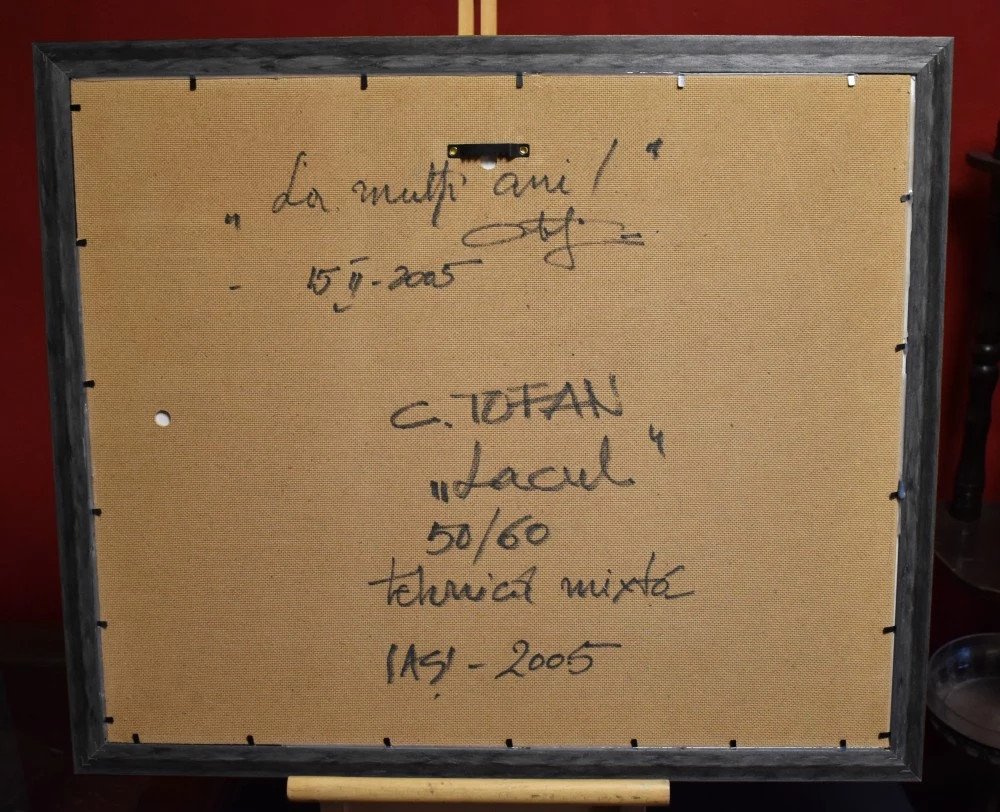 Lucrare realizată în 2005 de artistul contemporan Constantin Tofan, cunoscut pentru peisajele sale poetice și construcțiile cromatice rafinate. Lacul este o compoziție în tehnică mixtă, în care transparențele, straturile suprapuse și texturile subtile creează o atmosferă calmă și contemplativă.