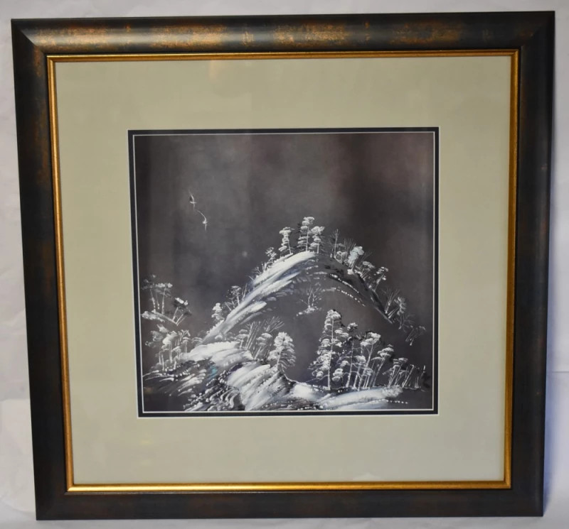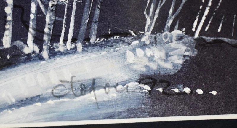Lucrare în tehnică mixtă, realizată în 1992 de artistul contemporan Constantin Tofan, cunoscut pentru peisajele sale poetice și construcția vizuală modernă. Această variantă în alb–negru pune accent pe esențial, pe linie și pe contrast, surprinzând atmosfera rece, statică și austeră a iernii.