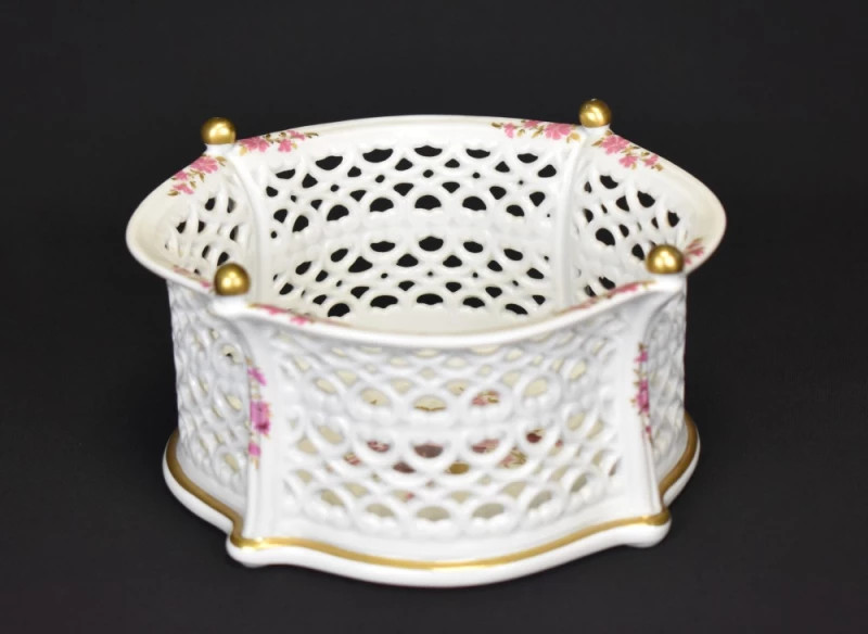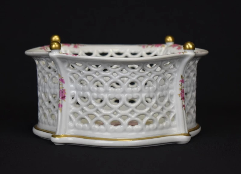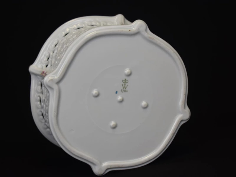 Delicat și rafinat, acest coșuleț traforat din porțelan Wallendorf este o expresie autentică a eleganței decorative germane de început de secol XX. Forma sa ondulată, cu margini fin traforate manual, creează un joc subtil de lumină și umbră, amintind de mesele elegante din saloanele burgheze ale epocii.