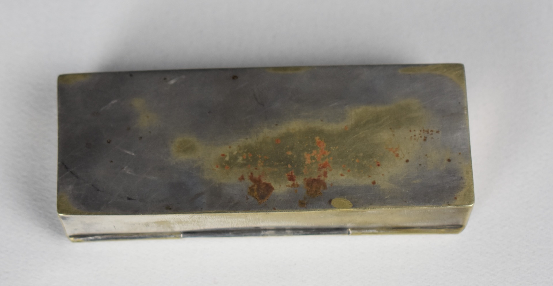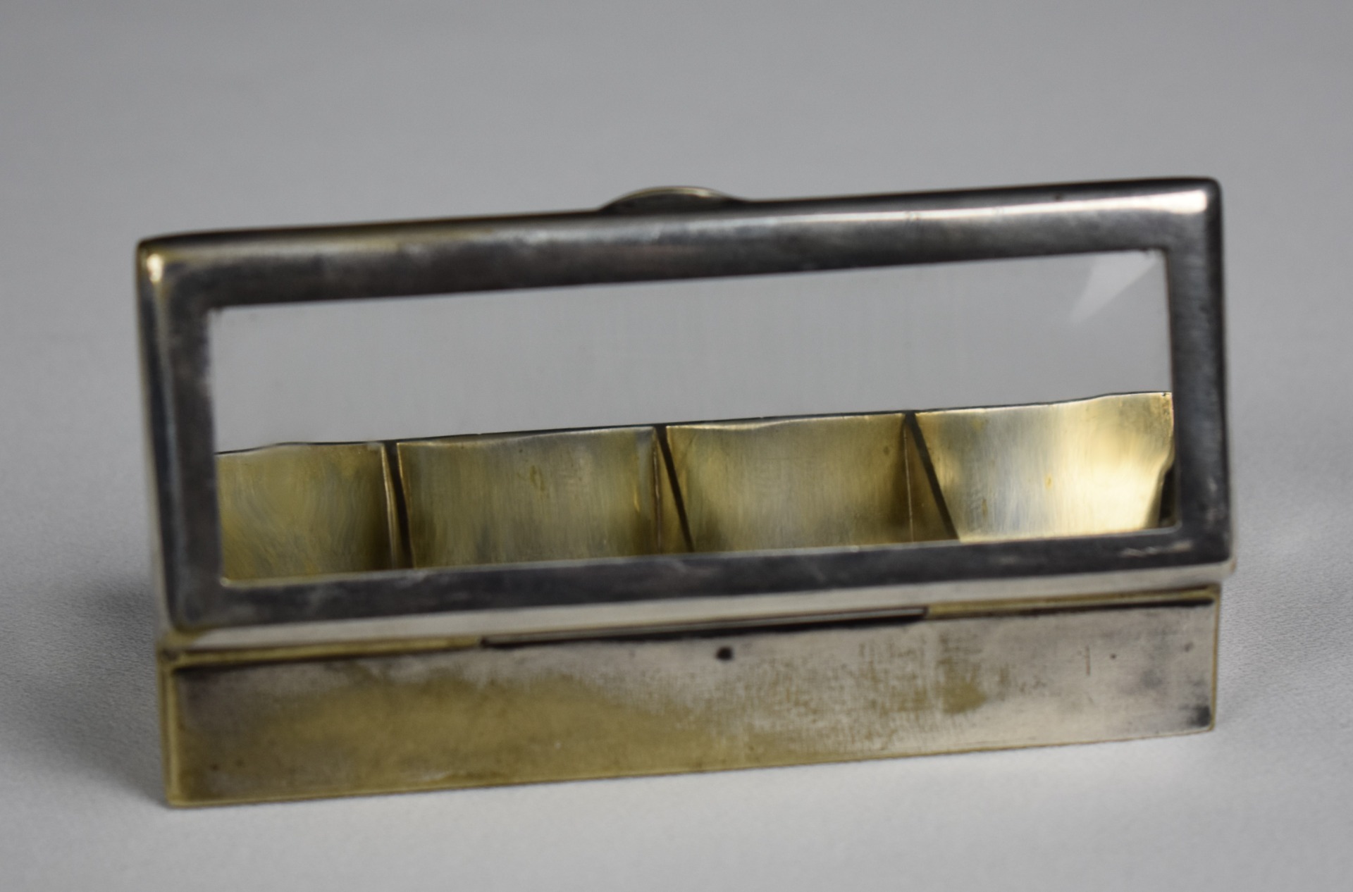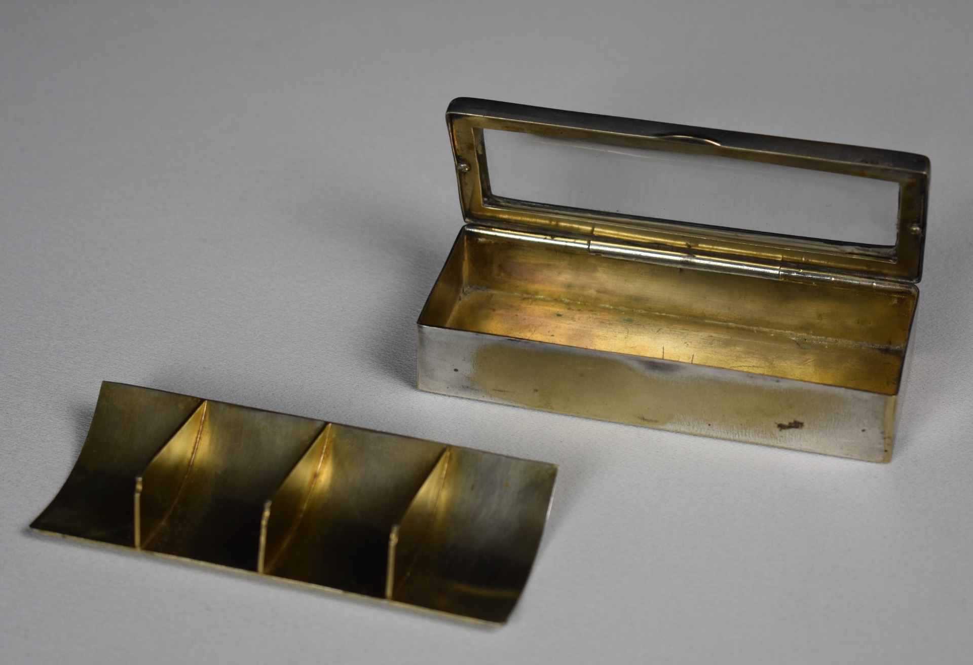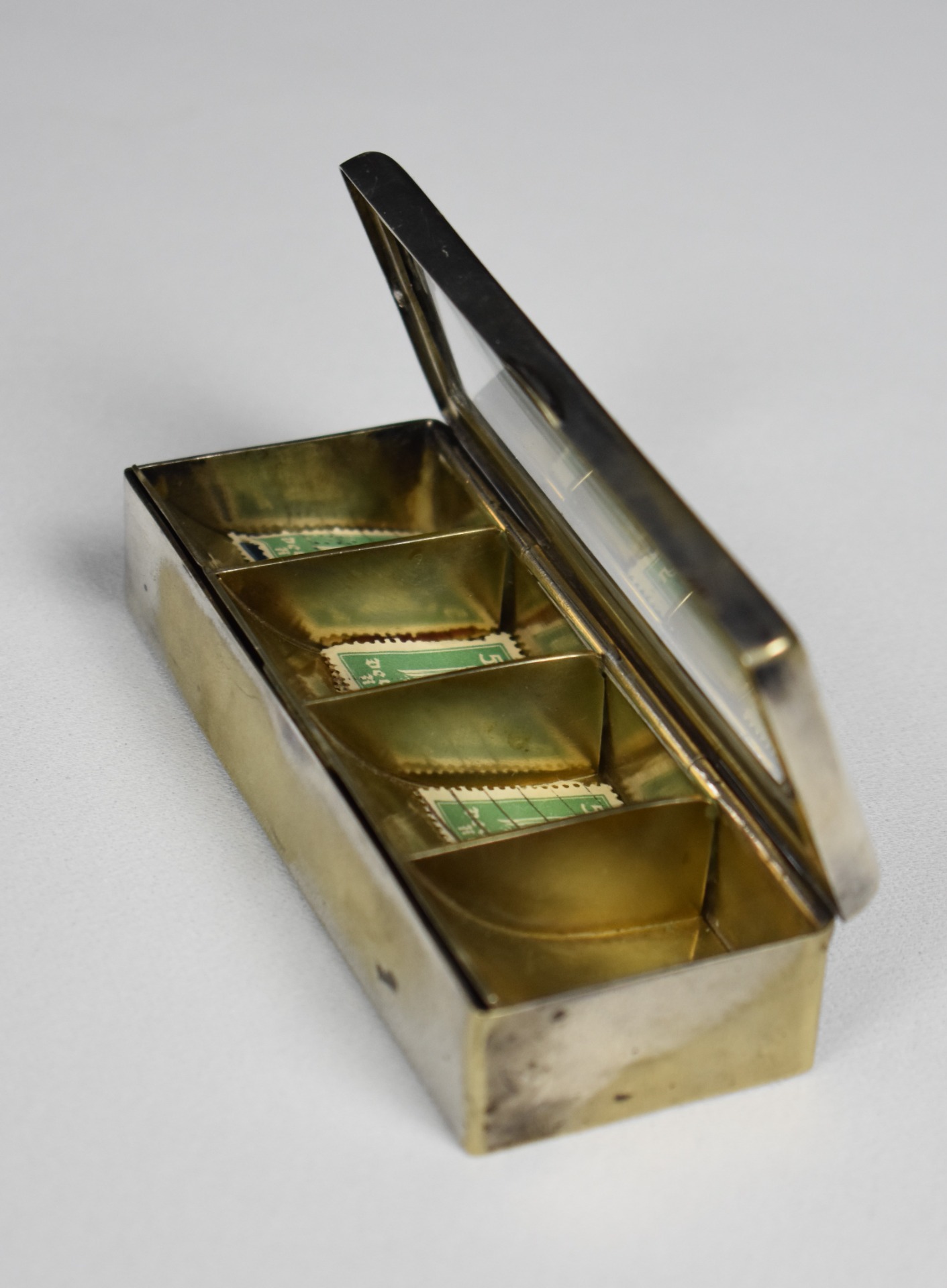 Cutie elegantă Art Deco / Bauhaus pentru timbre, realizată în anii 1920, din alamă argintată, cu interior compartimentat și tăviță aurită, concepută special pentru organizarea și protejarea timbrelor de colecție. Capacul este prevăzut cu lupă integrată, detaliu funcțional rafinat, destinat examinării pieselor filatelice fără manipulare directă.