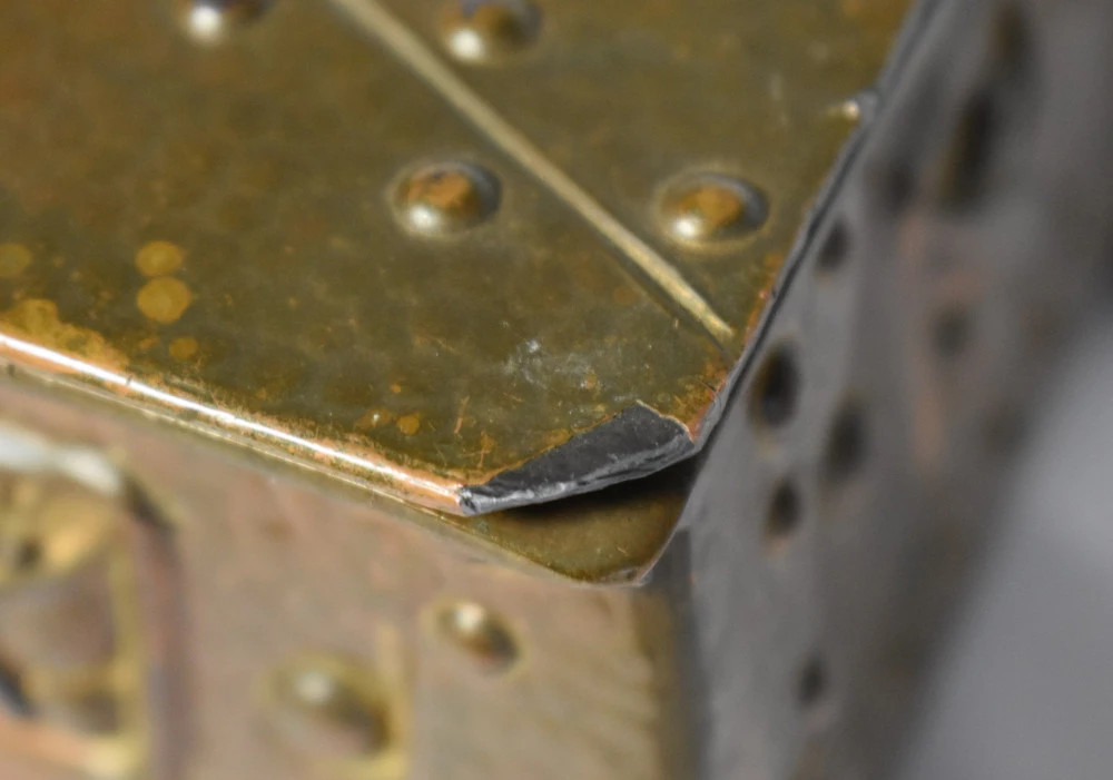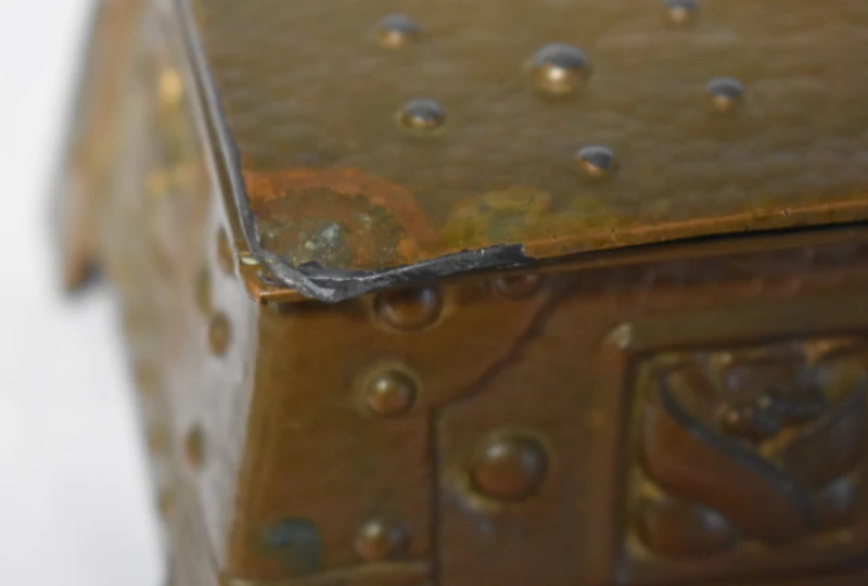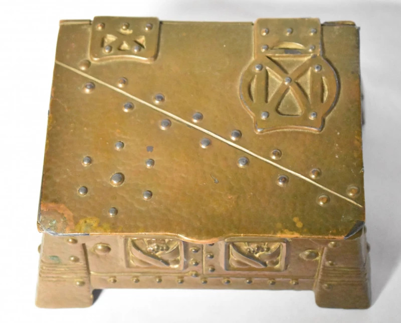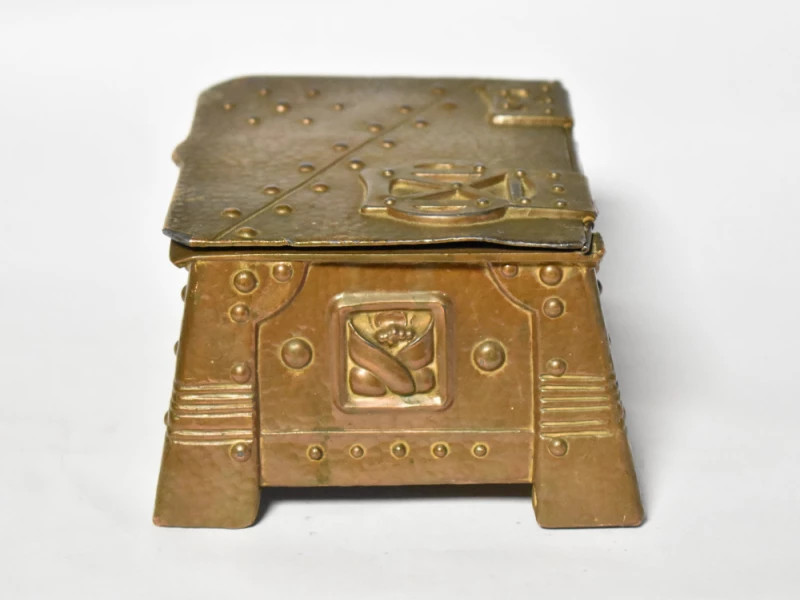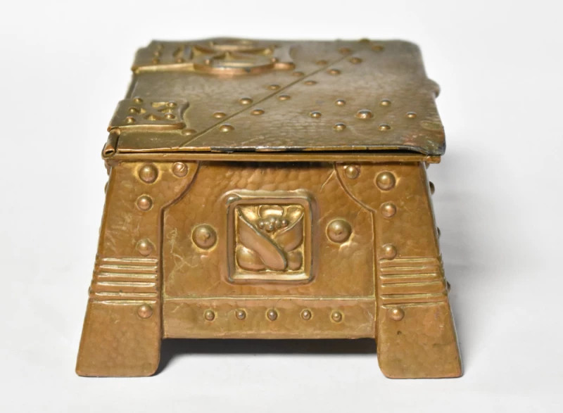 Cutia se remarcă prin reliefuri geometrice și florale stilizate, nituri decorative și suprafețe ușor ciocănite, elemente definitorii pentru filosofia Arts & Crafts, care valoriza meșteșugul autentic, materialele nobile și designul funcțional. Capacul articulat și proporțiile echilibrate conferă piesei atât utilitate practică, cât și o prezență sculpturală puternică.