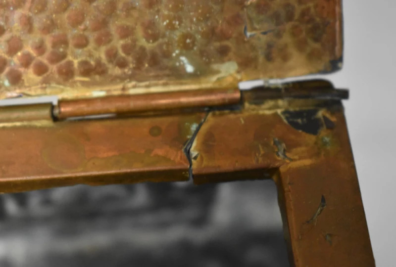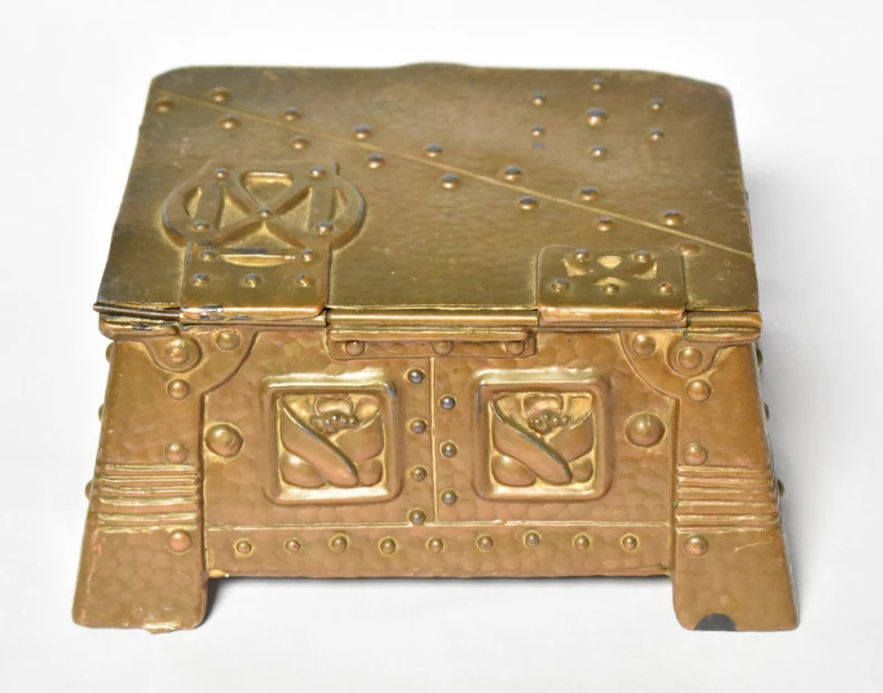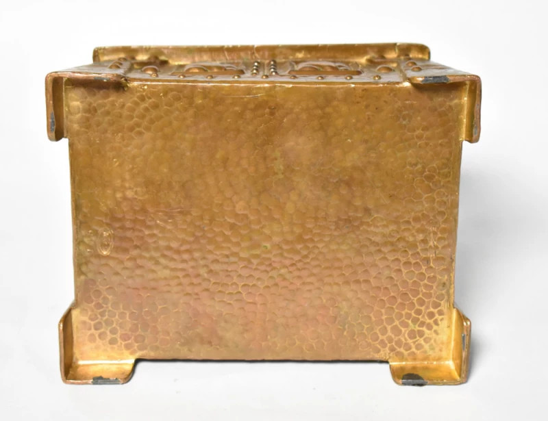 Spectaculoasă cutie pentru bijuterii realizată de celebrul atelier american Brainard & Wilson (B&W), una dintre firmele reprezentative ale mișcării Arts & Crafts, activă la sfârșitul secolului XIX și începutul secolului XX. Piesa datează din jurul anului 1910 și este executată din metal masiv (alamă / cupru), decorat prin tehnici specifice epocii.