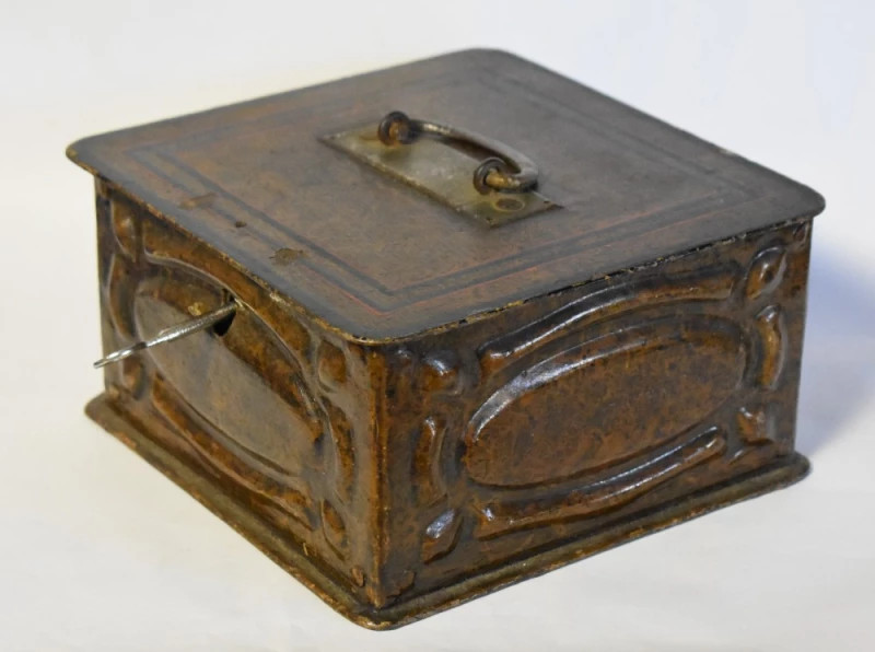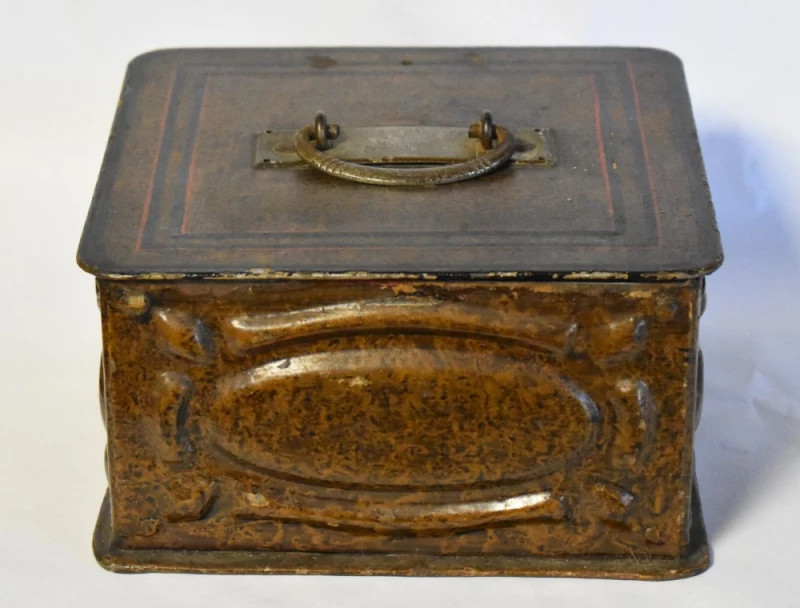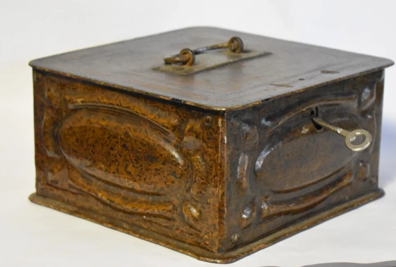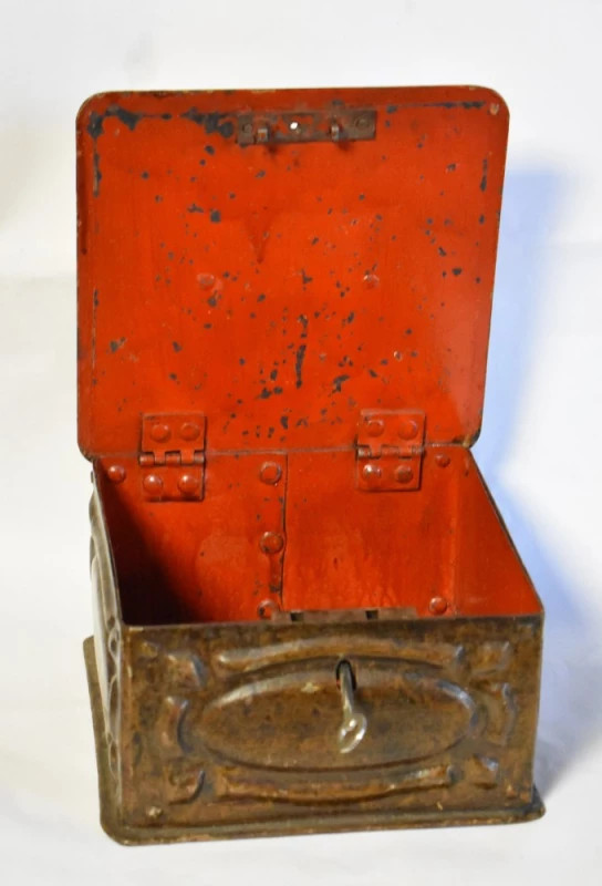 Cutie metalică veche de valori, realizată în perioada interbelică, destinată păstrării banilor, documentelor sau obiectelor importante. Construită din metal robust, cu mâner superior pentru transport, piesa este prevăzută cu sistem de închidere cu cheie, funcțional, specific cutiilor de valori și micilor seifuri comerciale ale începutului de secol XX.