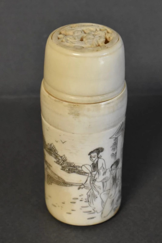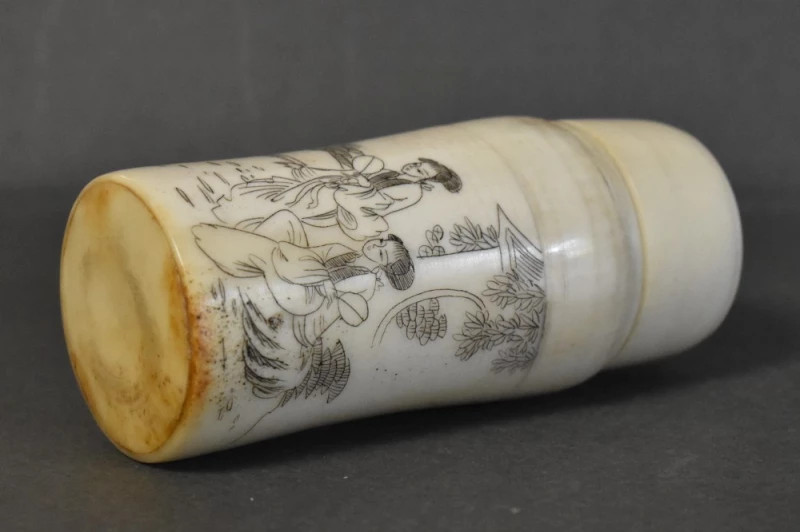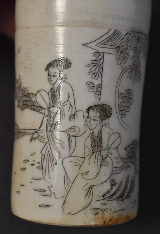 Cutia este lucrată integral manual din os fin șlefuit și decorată prin incizie cu o scenă populară: două personaje îmbrăcate în veșminte tradiționale, surprinse într-un cadru natural simplu, armonios. Desenul delicat, în linii subțiri, este caracteristic miniaturii chineze de secol XIX.