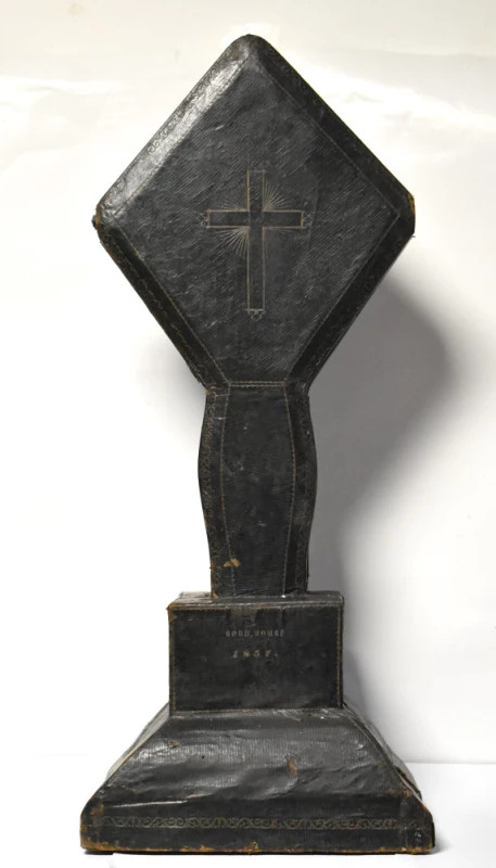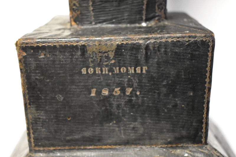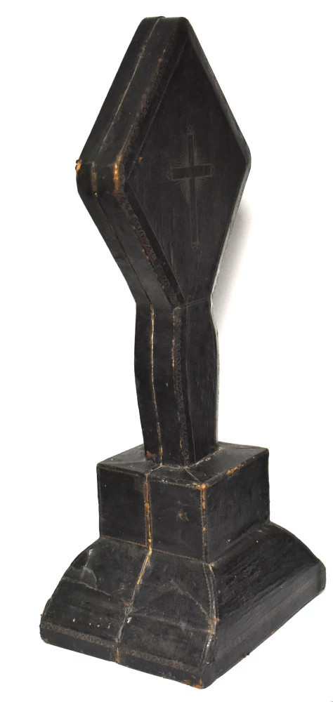 Piesă extrem de rară și spectaculoasă: cutie veche pentru transportul unei cruci, realizată în 1857 în atelierul meșterului B.F. Juster – Buchbinder in Jassy (legător de cărți, meșter specializat în obiecte de cult și ambalaje artizanale).