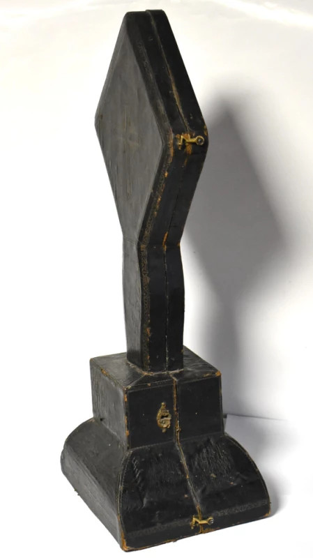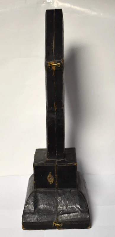 Confecționată din lemn acoperit în piele presată, cusută și finisată manual, cutia are o formă specifică de protecție pentru cruci mari și apare decorată cu o cruce în stil radiant imprimată pe fața frontală. Soclul trapezoidal și forma alungită indică faptul că era destinată transportului unei cruci ceremoniale sau liturgice, posibil din argint sau alamă aurită.