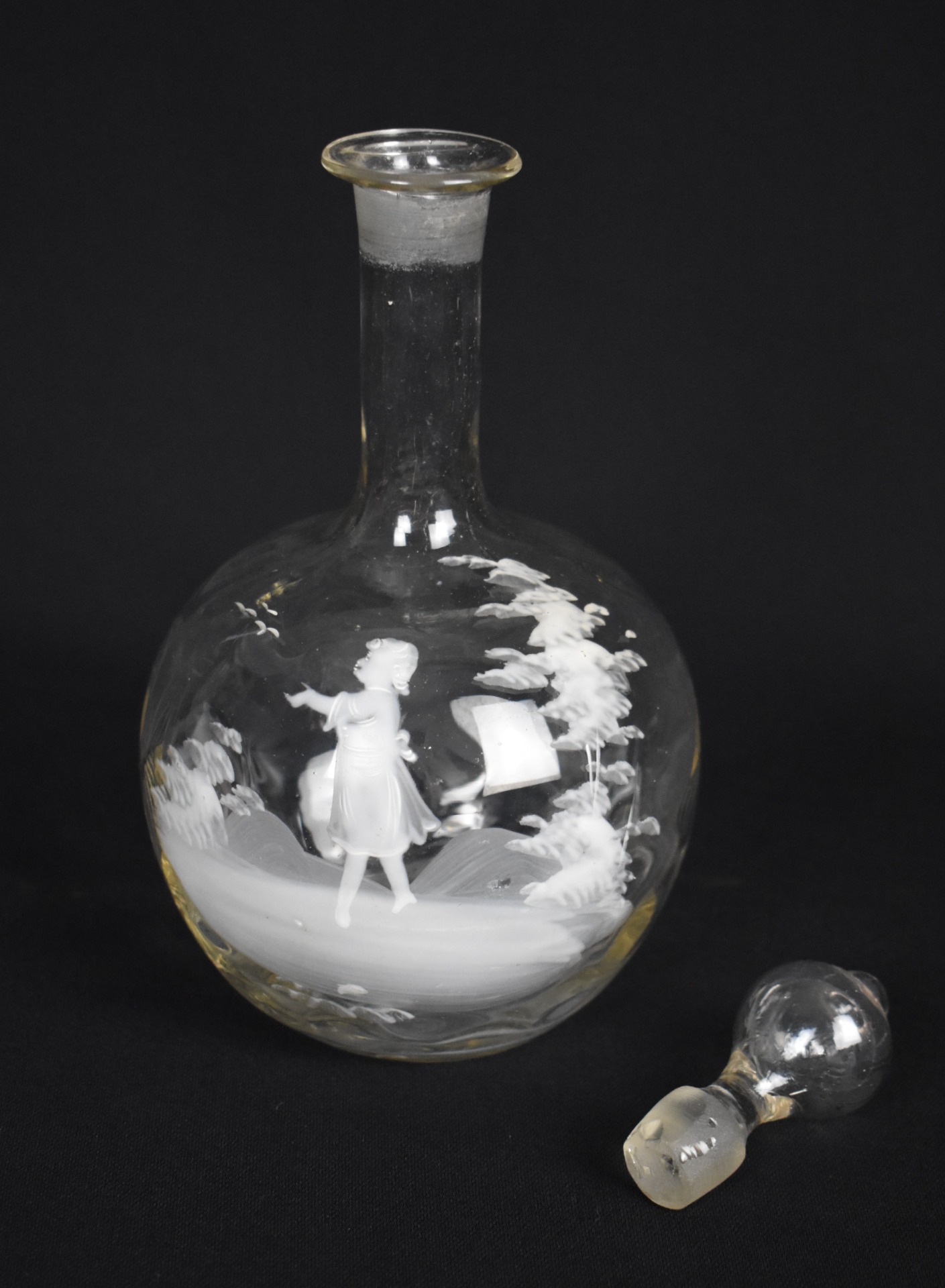 Acest decantor vechi din sticlă, realizat în Boemia în jurul anului 1900, aparține celebrului stil Mary Gregory, recunoscut internațional pentru siluetele delicate de copii, pictate sau gravate în relief alb pe fond transparent sau ușor colorat.