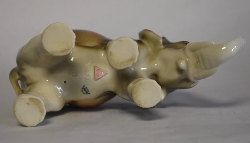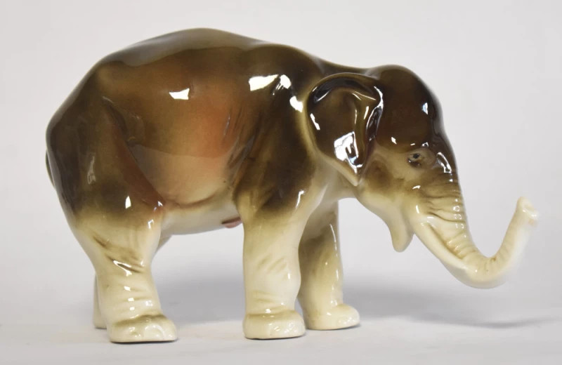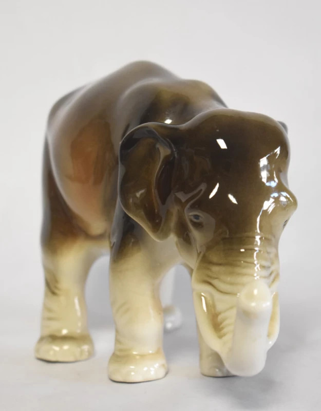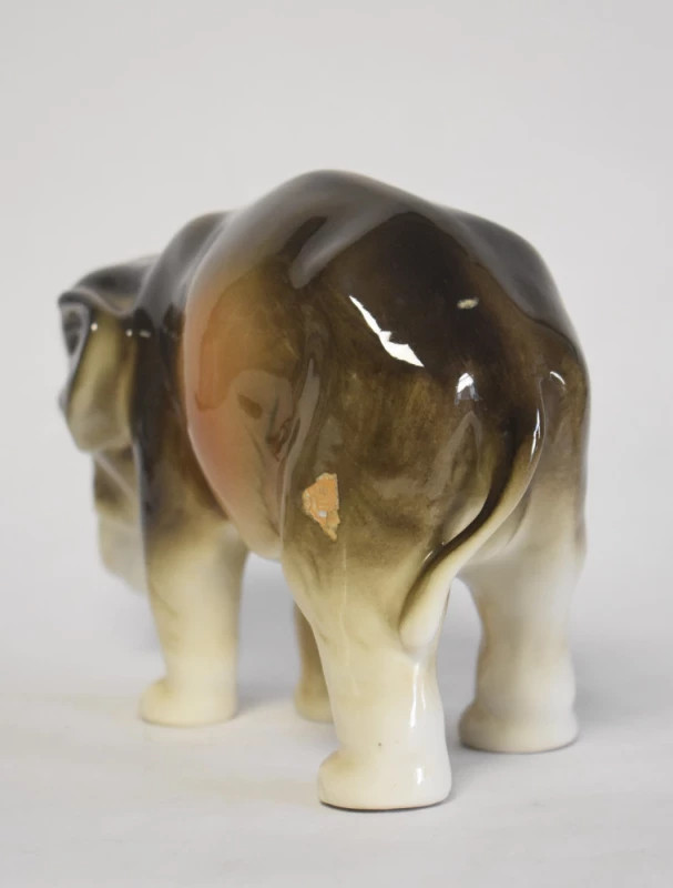 Elegantă figurină din porțelan fin, realizată de renumita manufactură Royal Dux (Cehoslovacia), în stilul specific perioadei Art Deco. Piesa redă un elefant într-o postură calmă și grațioasă, cu forme rotunjite, volumetrii fluide și glazură lucioasă în nuanțe calde de maro, crem și ocru.