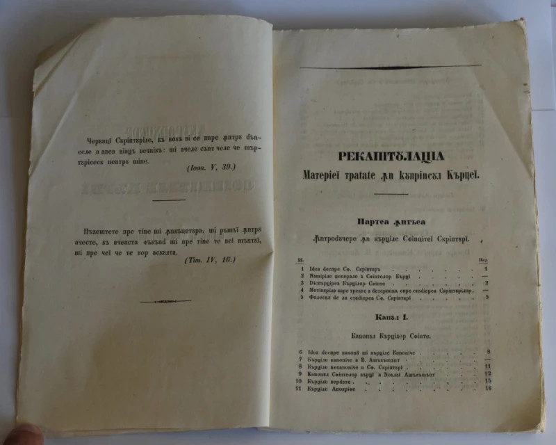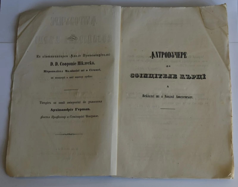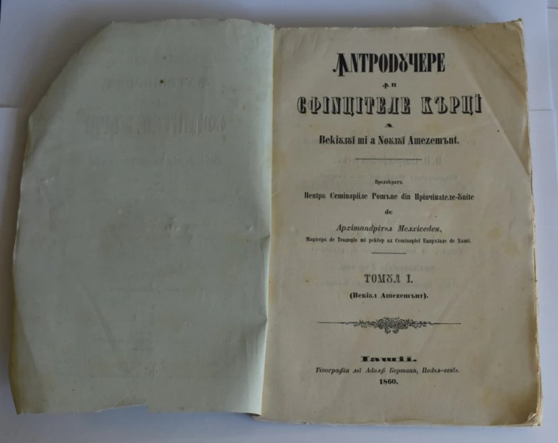 Volum valoros și rar, tipărit în Iași, în 1860, în alfabet chirilic, aparținând unuia dintre cei mai importanți ierarhi și savanți ai culturii românești: Episcopul Melchisedec Ștefănescu – istoric, teolog, pedagog și membru fondator al Academiei Române.