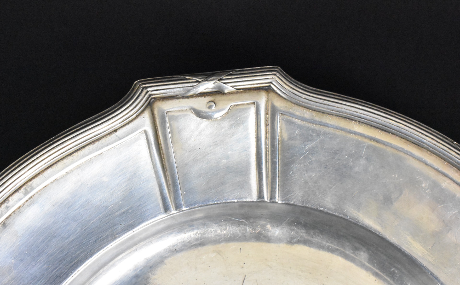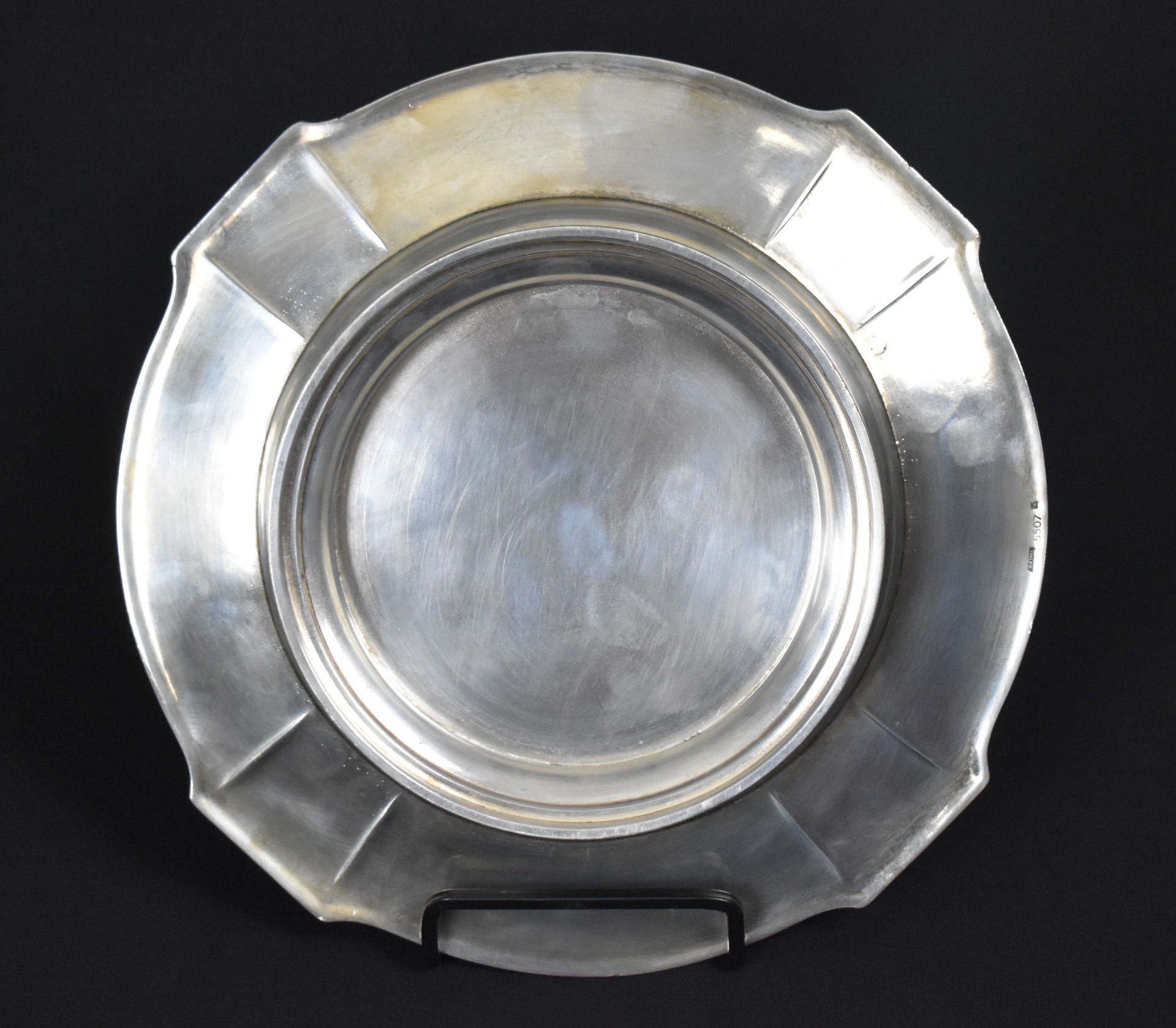 Executată din metal argintat, piesa a fost concepută ca centru de masă pentru interioare burgheze, saloane elegante și hoteluri de lux. Profilul amplu și marginea modelată conferă obiectului o prezență vizuală puternică, potrivită atât pentru utilizare funcțională, cât și pentru decor.