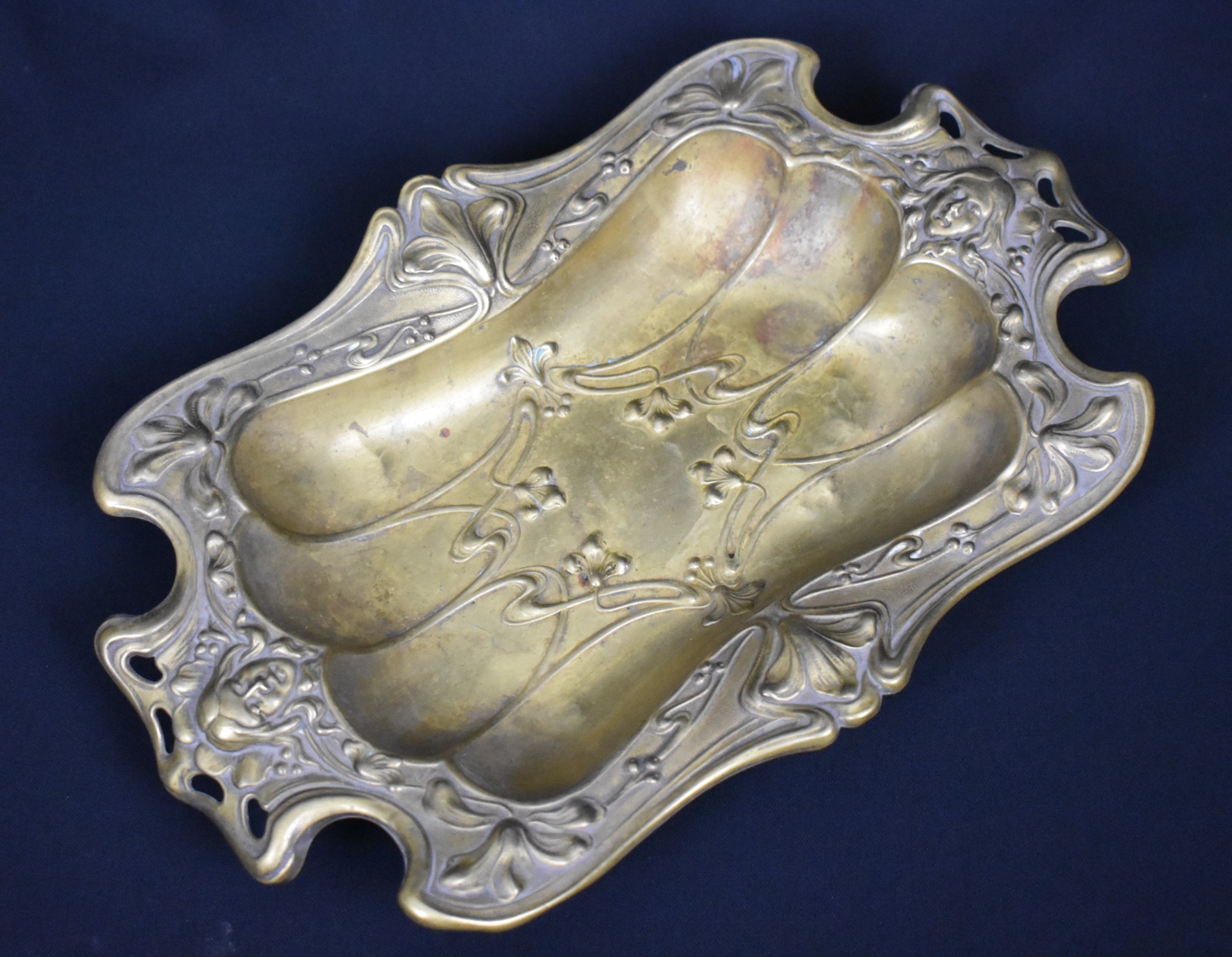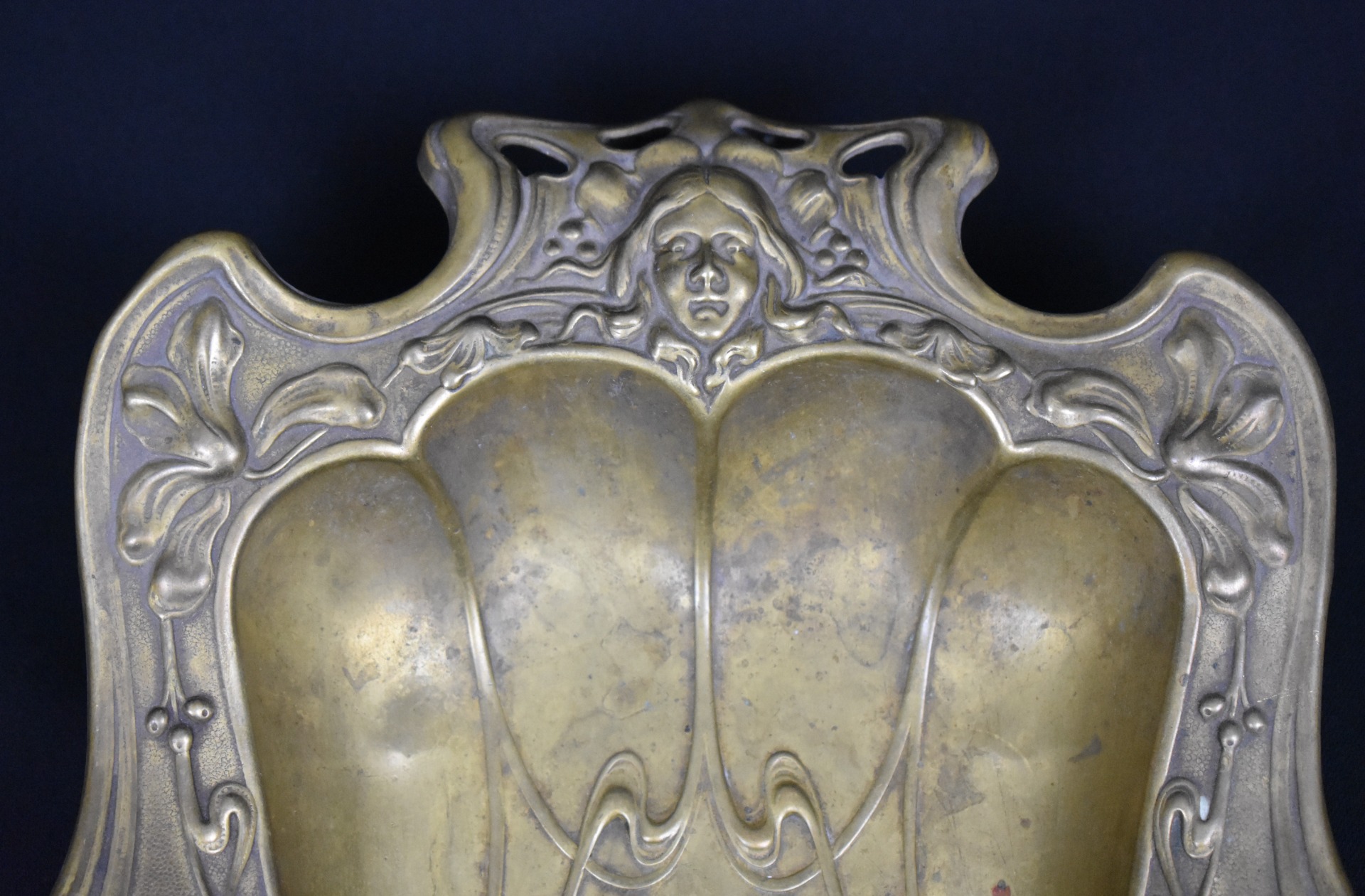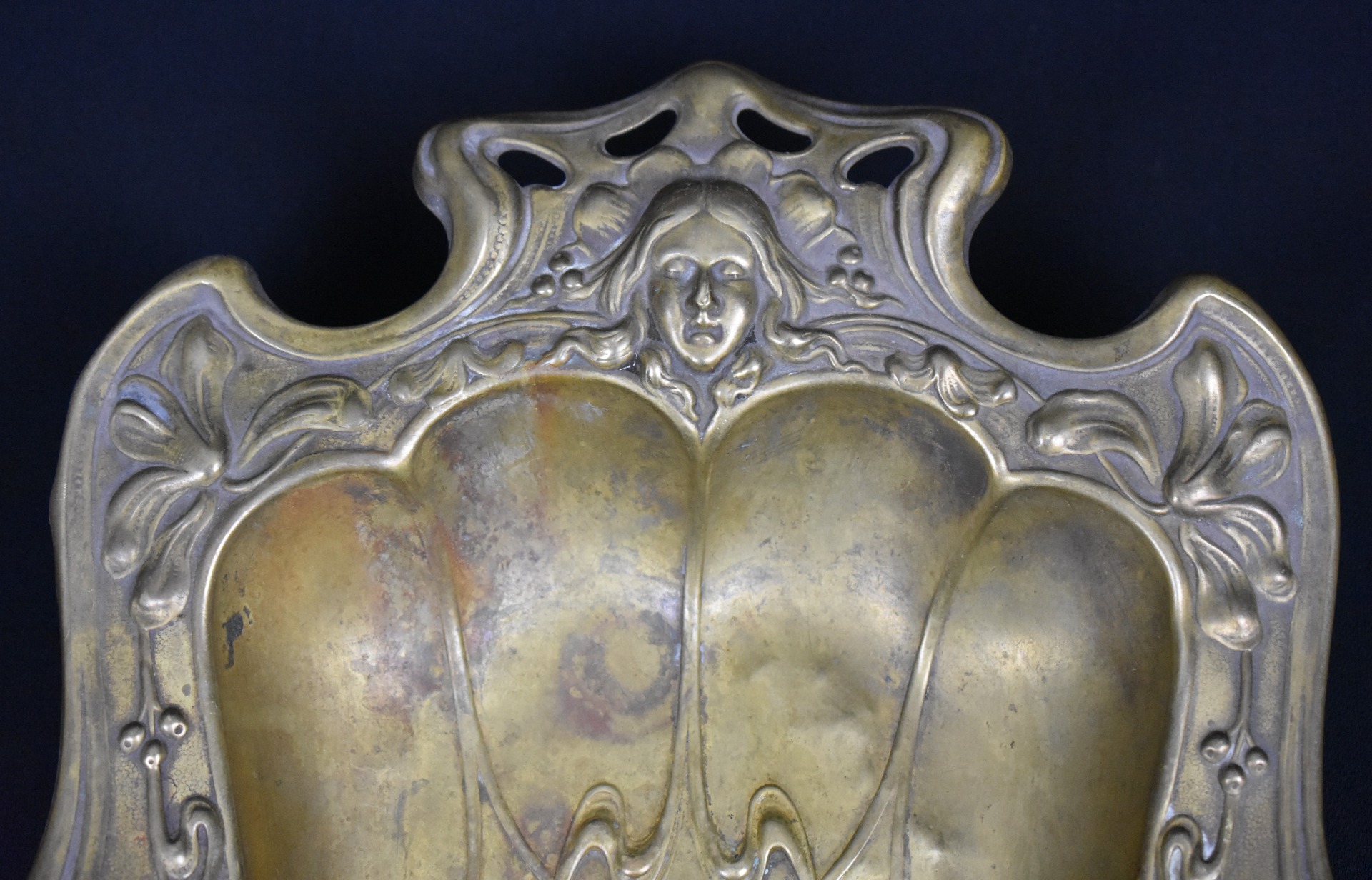 Spectaculoasă fructieră Art Nouveau, realizată în jurul anului 1900, confecționată din alamă masivă, cu un decor bogat, fluid și intens ornamental. Piesa se distinge prin prezența unui cap de femeie stilizat, integrat armonios în compoziția vegetală ondulată, motiv iconic al estetici Art Nouveau, unde figura feminină este simbol al naturii, frumuseții și vitalității.