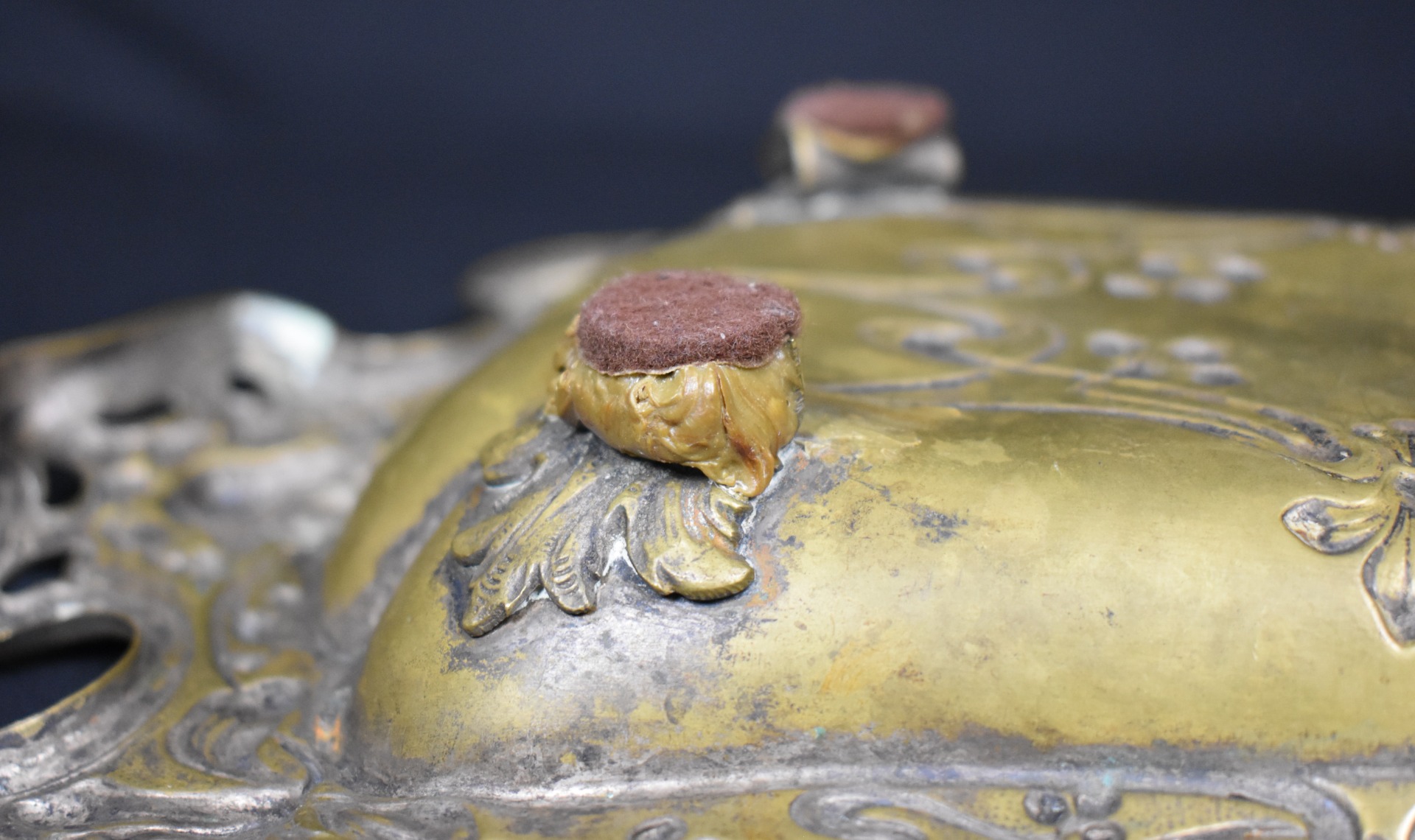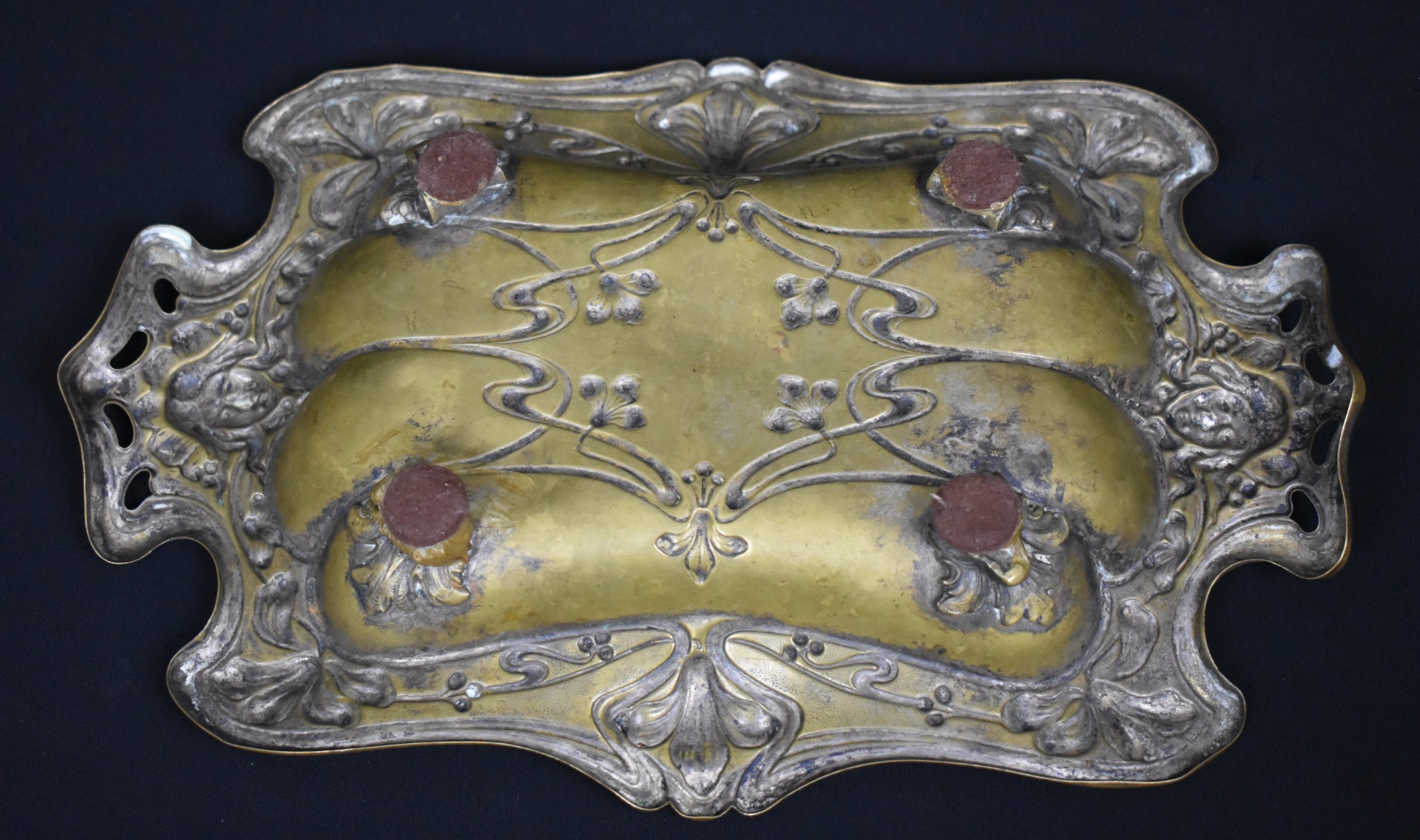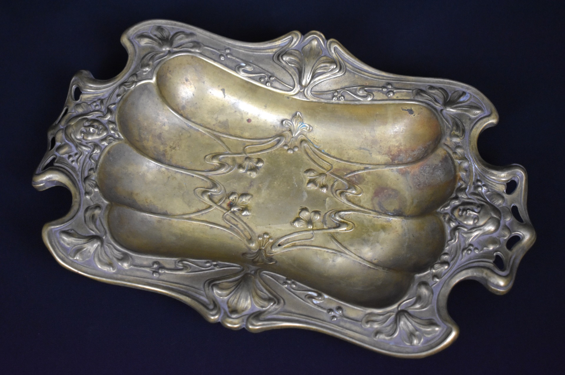 Spectaculoasă fructieră Art Nouveau, realizată în jurul anului 1900, confecționată din alamă masivă, cu un decor bogat, fluid și intens ornamental. Piesa se distinge prin prezența unui cap de femeie stilizat, integrat armonios în compoziția vegetală ondulată, motiv iconic al estetici Art Nouveau, unde figura feminină este simbol al naturii, frumuseții și vitalității.