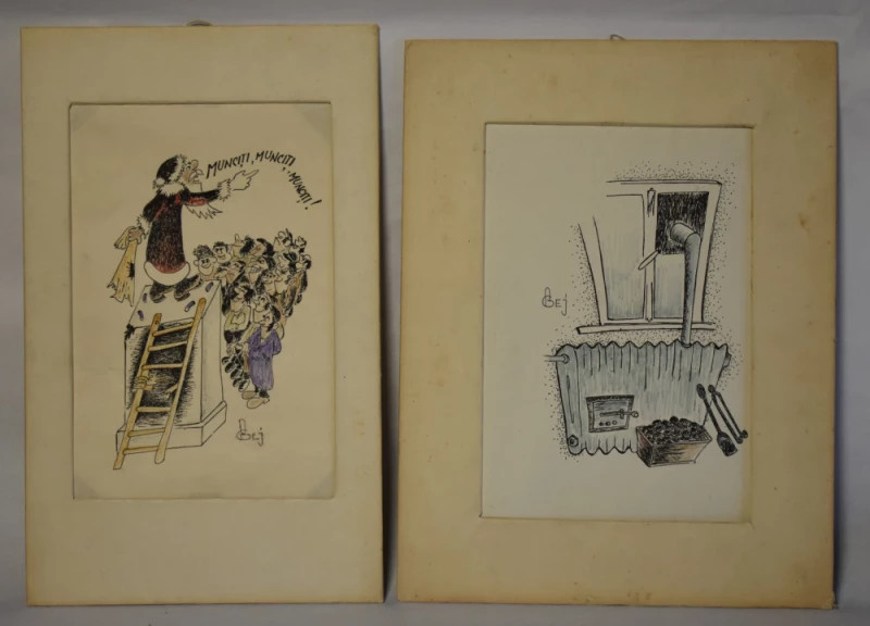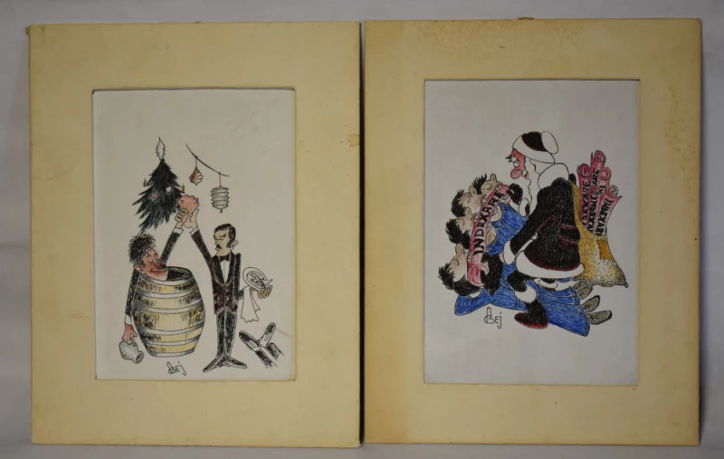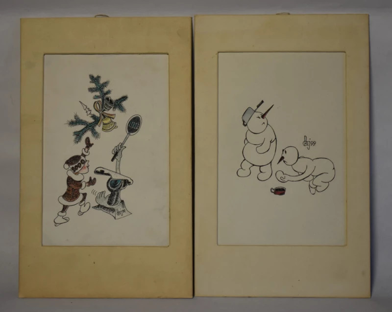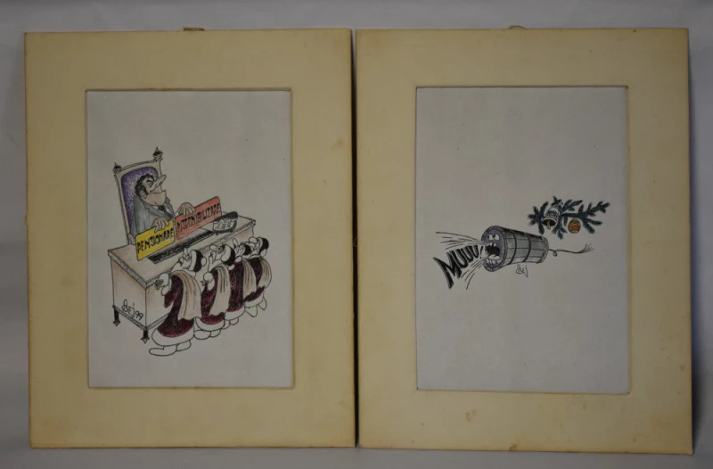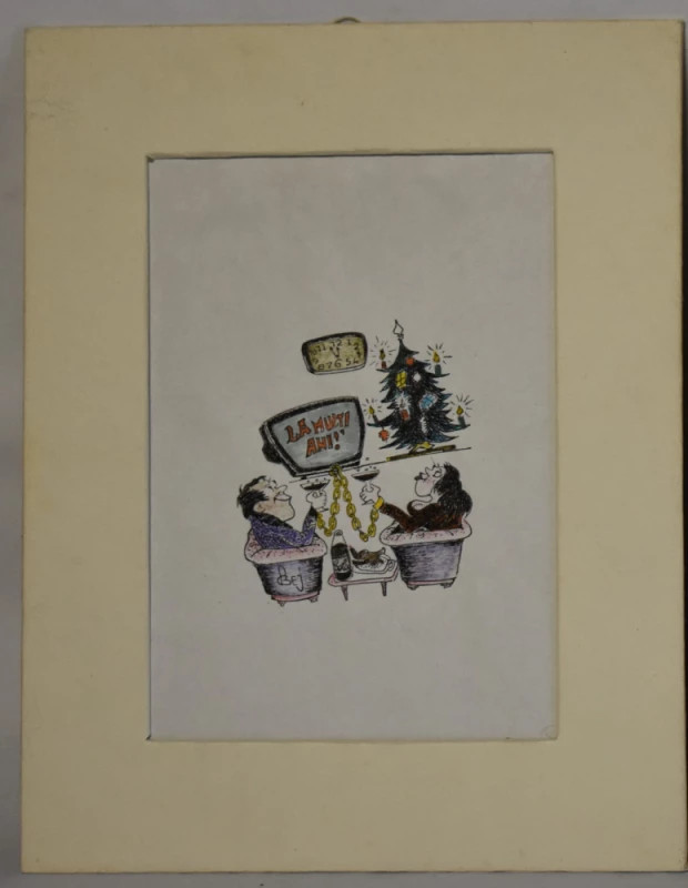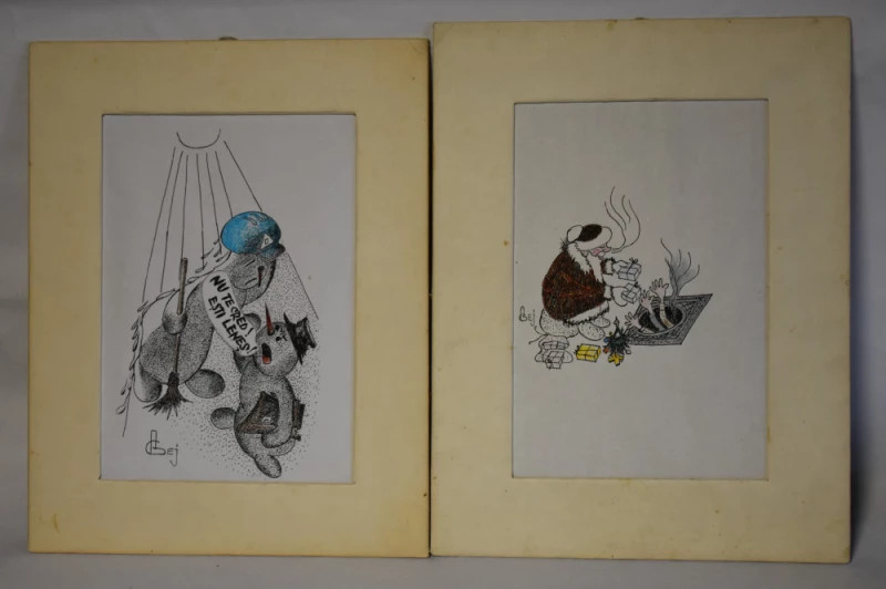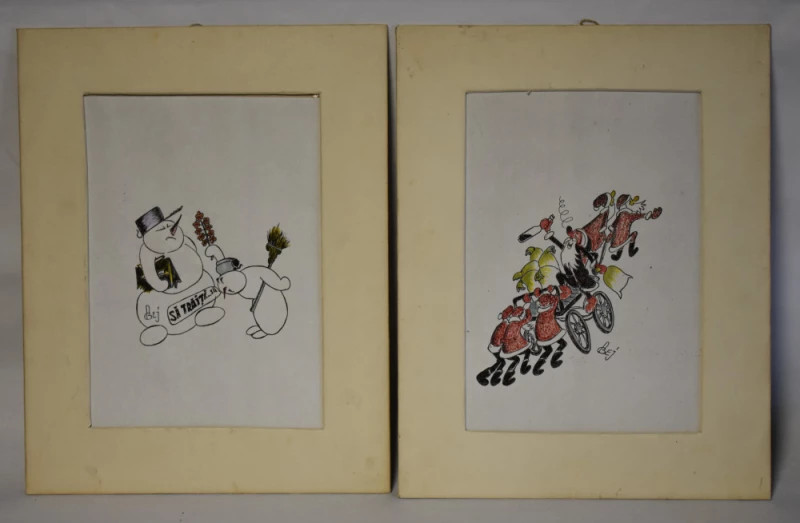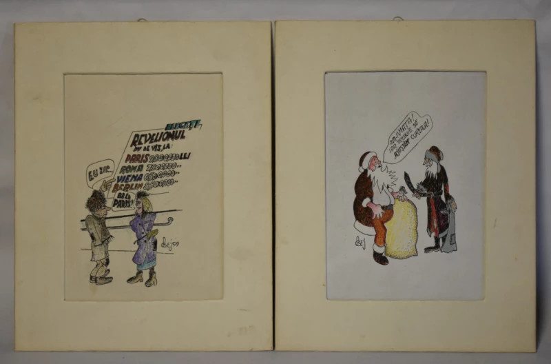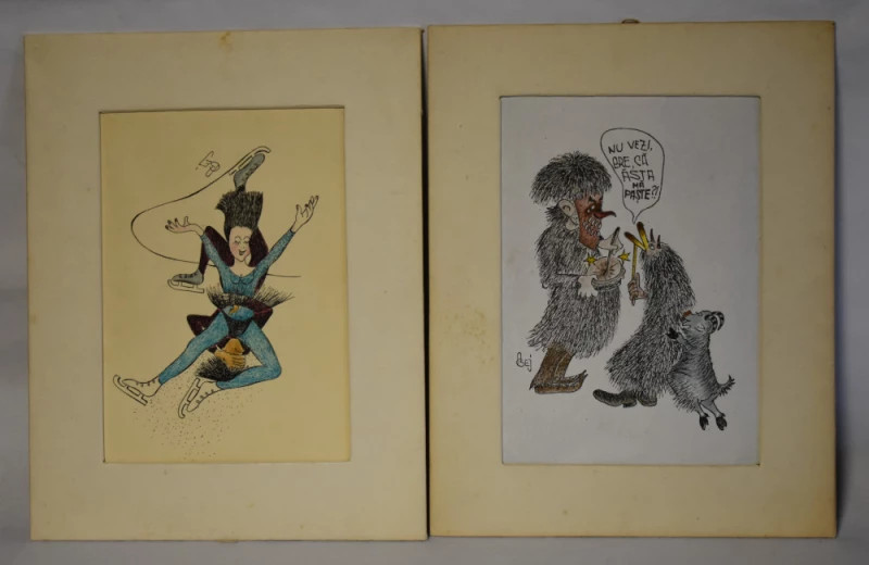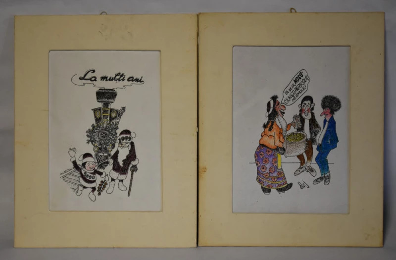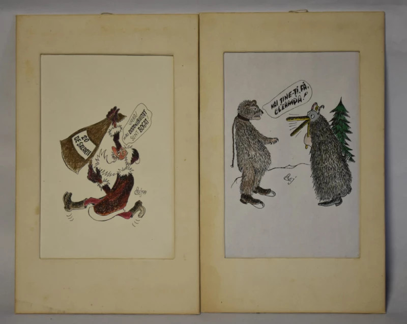 Lot de 22 caricaturi originale realizate în anii '90 de artistul ieșean Grigore "Grig" Bejenaru, membru al Uniunii Artiștilor Plastici. Lucrările abordează teme de iarna și Crăciun, în stilul satiric și expresiv caracteristic autorului.