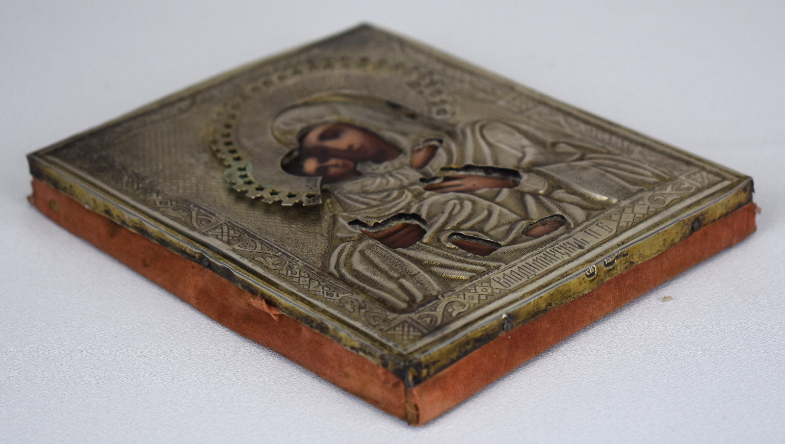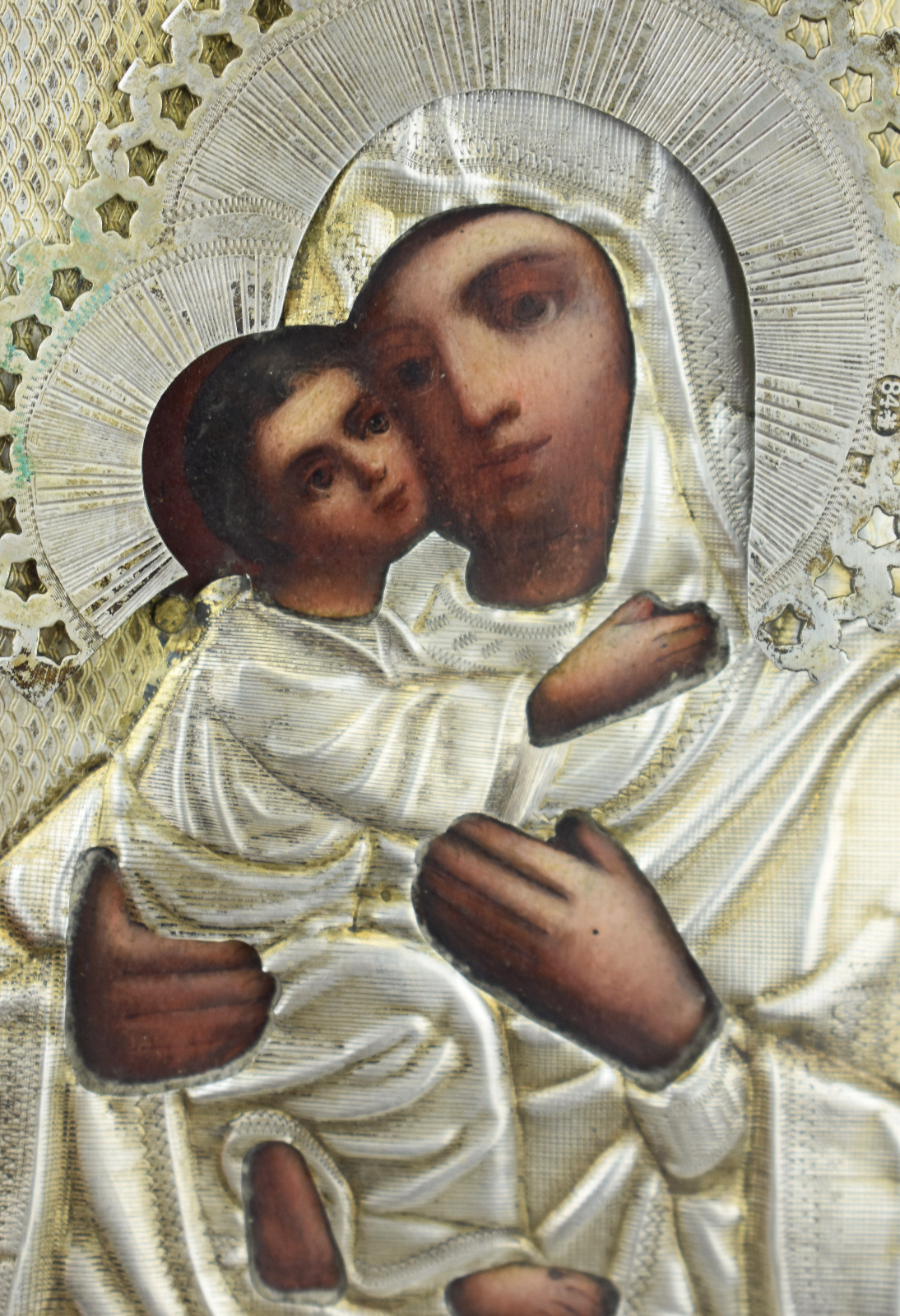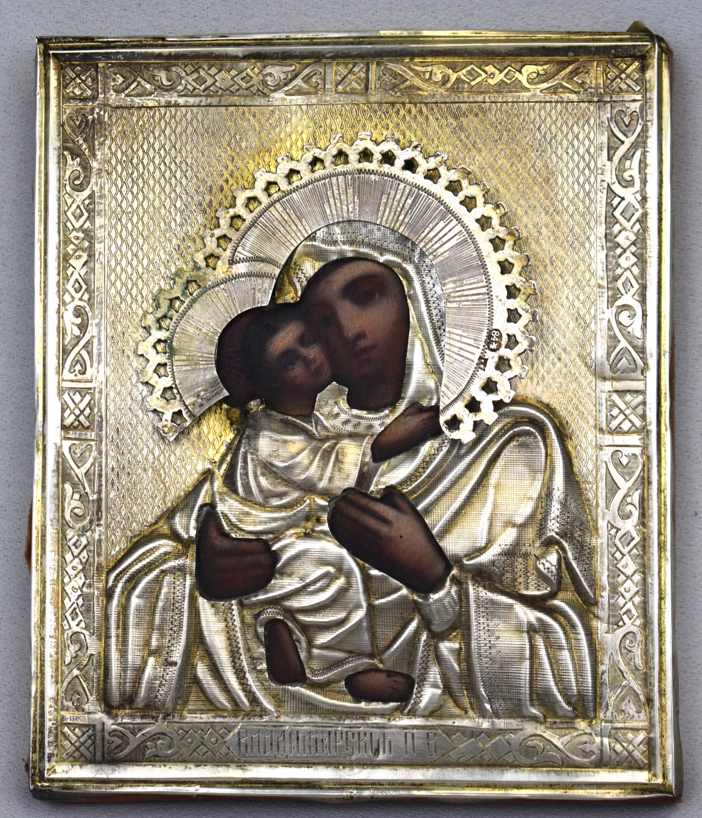 Icoana este decorată cu ferecătură (oklad / riza) din argint titlu 84, standardul de puritate utilizat în Rusia țaristă (aprox. 875‰). Marcajele vizibile includ marca kokoshnik și ștanțele atelierului, elemente specifice sistemului de control al argintului din Imperiul Rus de la sfârșitul secolului al XIX-lea.