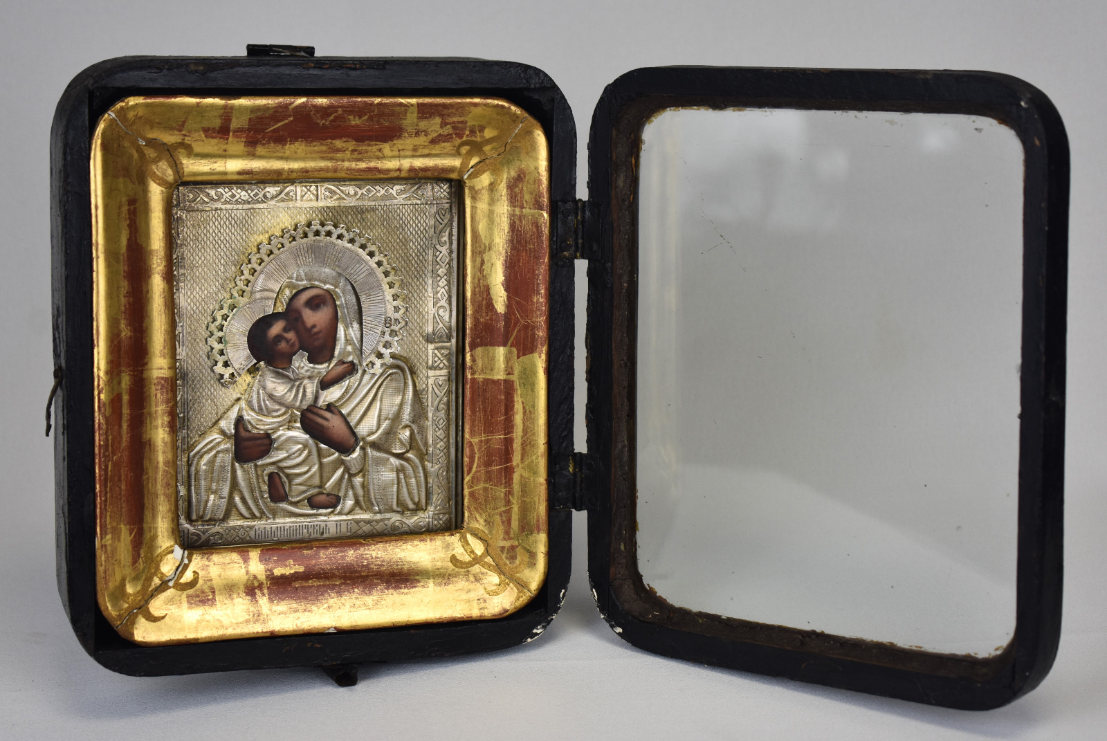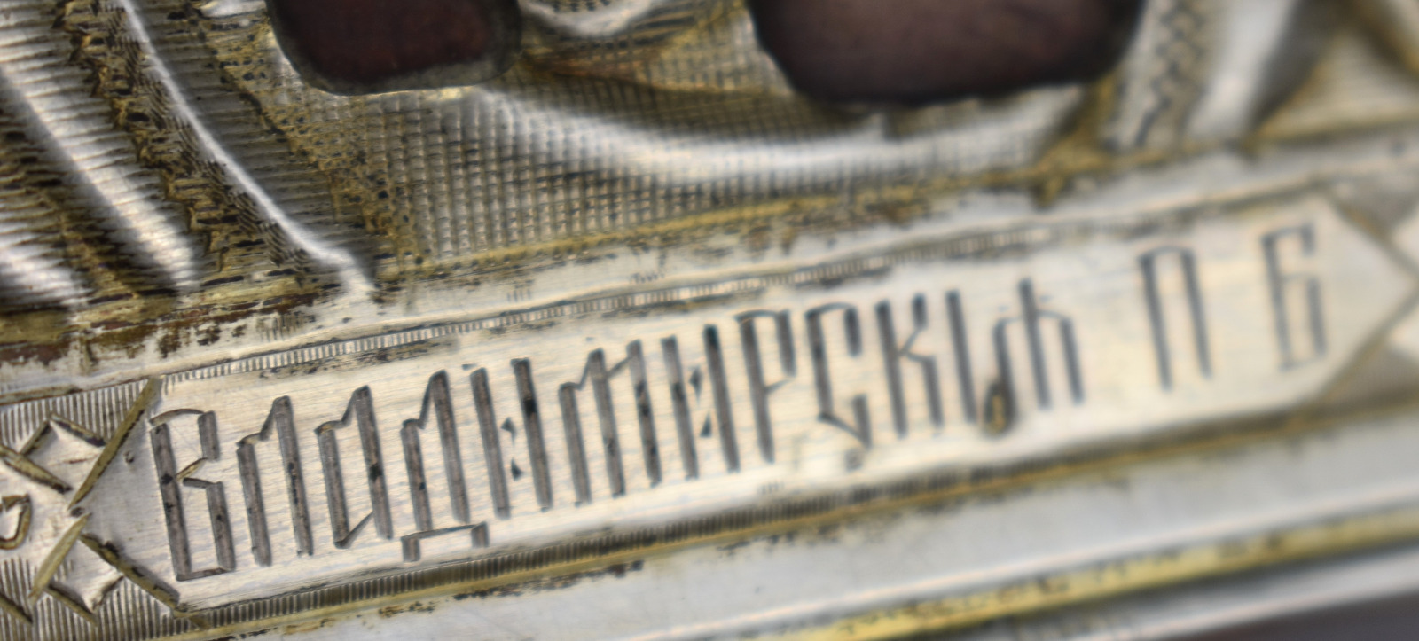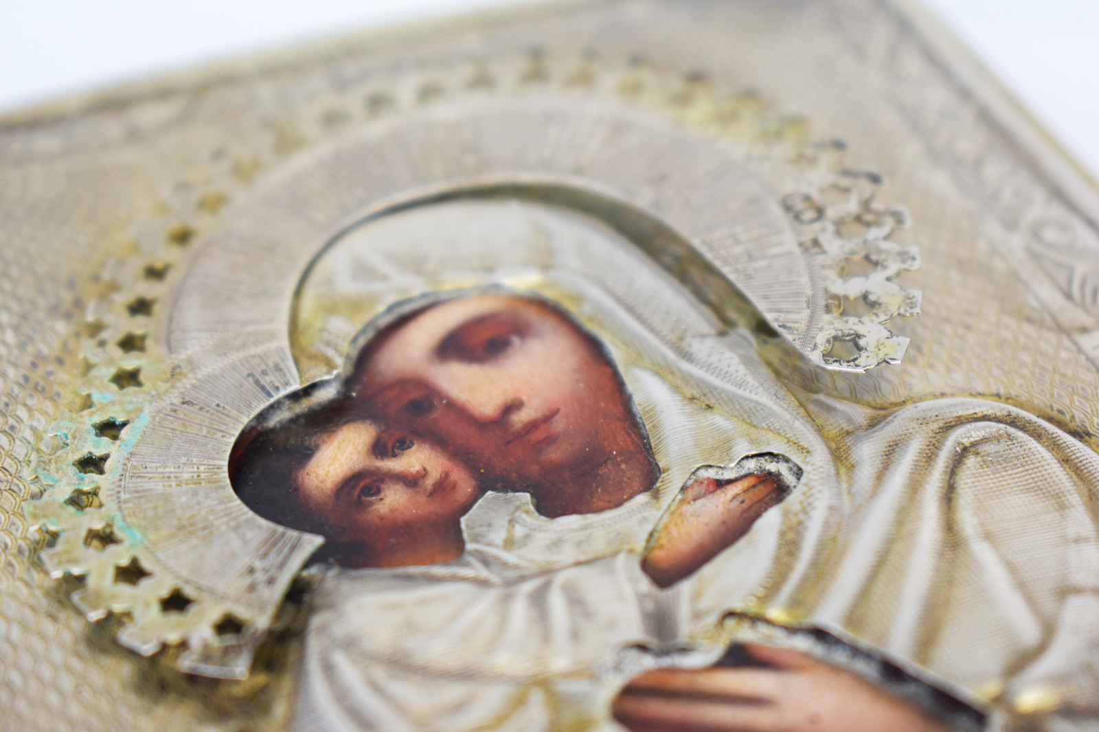 Icoana este decorată cu ferecătură (oklad / riza) din argint titlu 84, standardul de puritate utilizat în Rusia țaristă (aprox. 875‰). Marcajele vizibile includ marca kokoshnik și ștanțele atelierului, elemente specifice sistemului de control al argintului din Imperiul Rus de la sfârșitul secolului al XIX-lea.