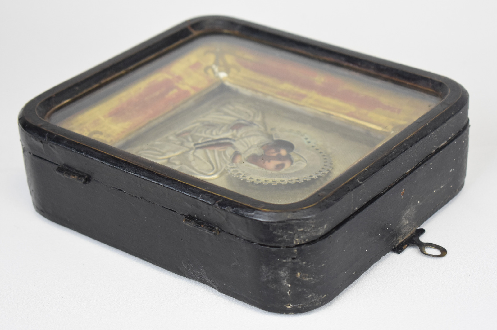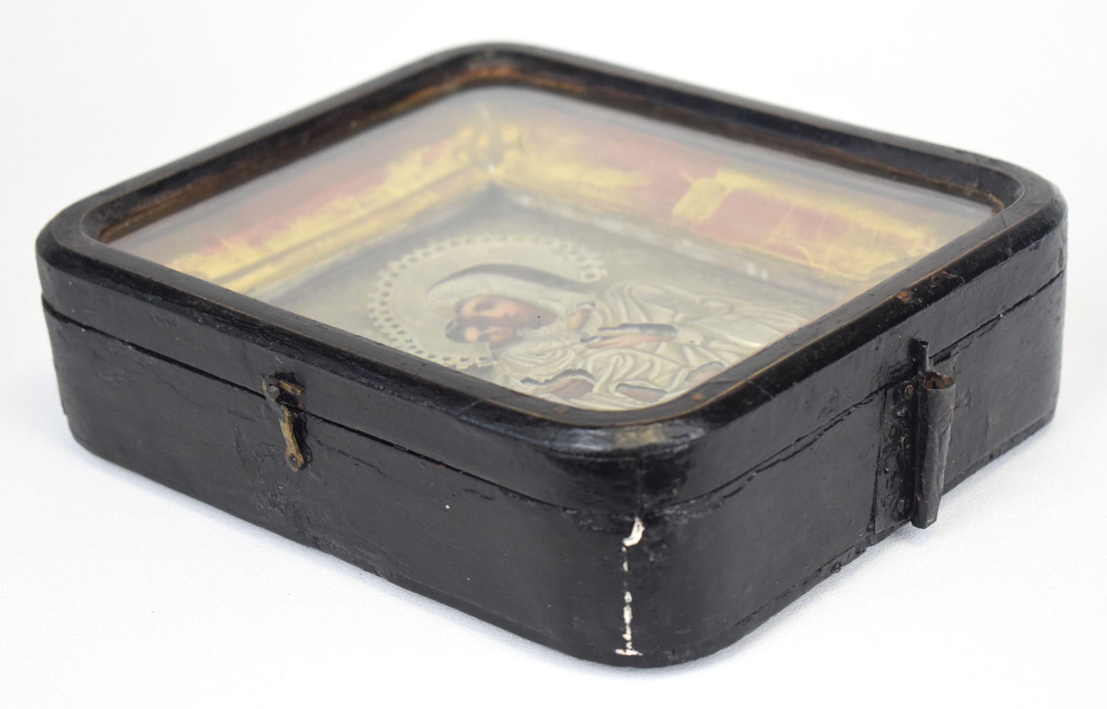 Icoana este montată într-o casetă originală din lemn cu geam, destinată protecției și expunerii piesei. Interiorul casetei este decorat cu o ramă aurită, accentuând caracterul sacru și valoarea artistică a obiectului.