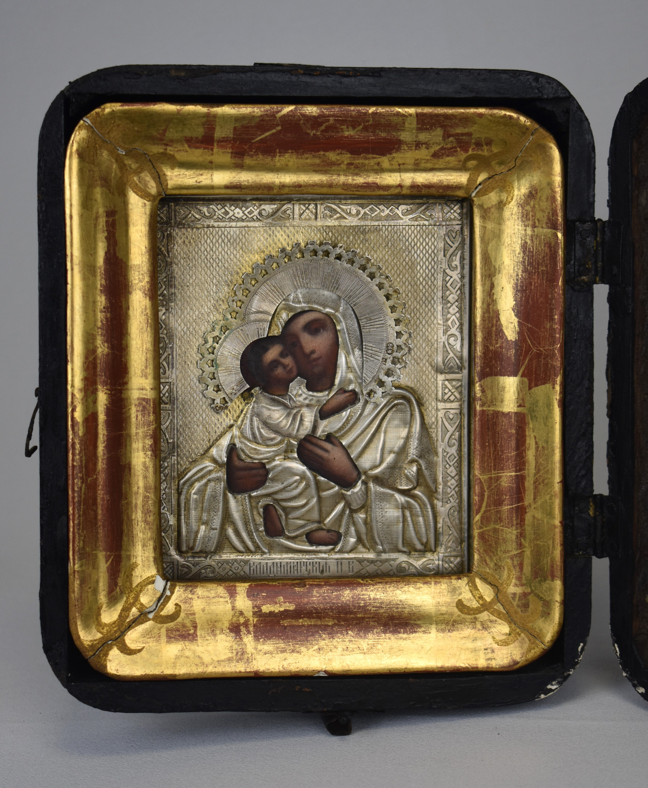 Compoziția iconografică o prezintă pe Maica Domnului din Vladimir cu Pruncul Iisus, una dintre cele mai venerate reprezentări ale Fecioarei Maria în tradiția ortodoxă. Gestul tandru dintre Maică și Prunc simbolizează iubirea maternă și protecția divină. Chipurile sunt pictate manual, în timp ce veșmintele și fundalul sunt realizate din argint embosat și gravat, cu motive decorative fine specifice atelierelor moscovite.