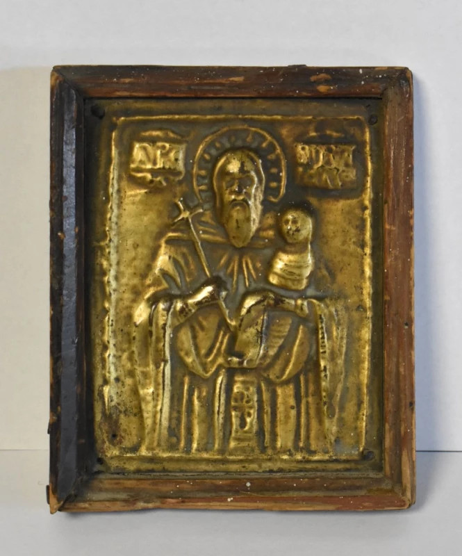 Relieful din alamă este lucrat cu finețe, prezentându-l pe Sfânt în port canonic, cu aureolă și simbolurile specifice iconografiei sale. Rama veche din lemn întărește caracterul autentic și devoțional al piesei, completând armonios compoziția.