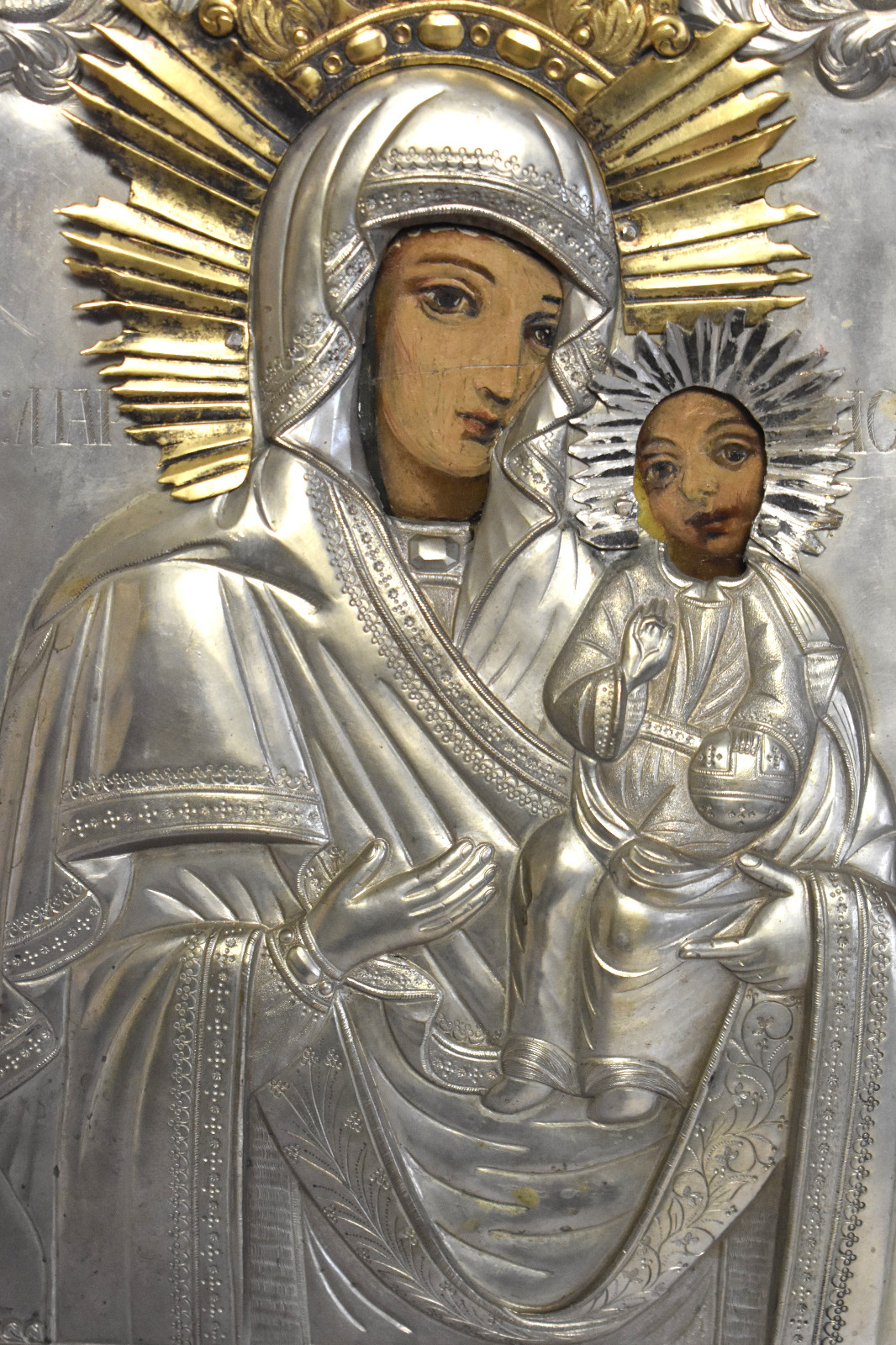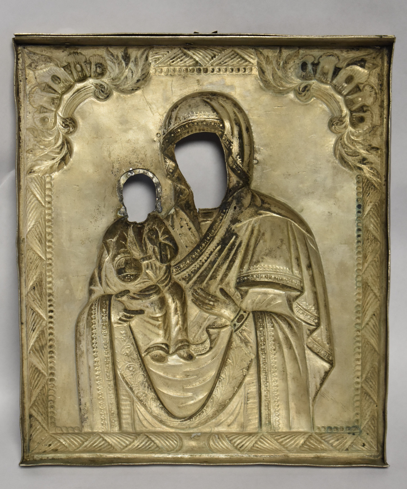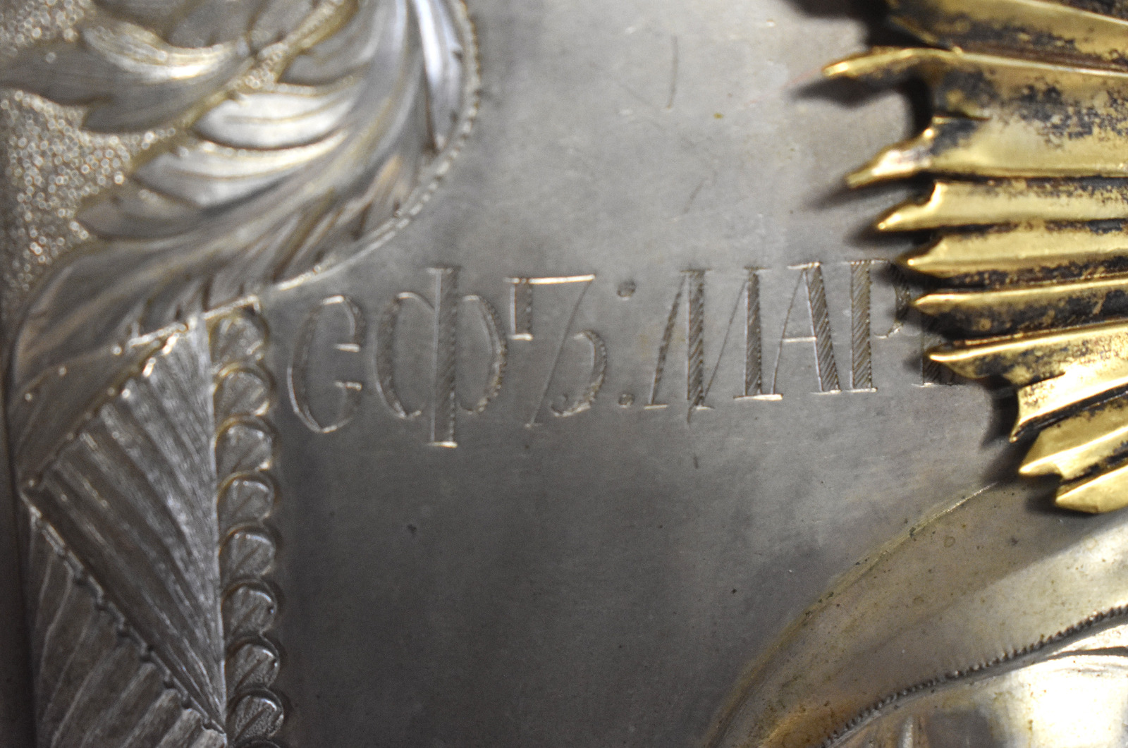 Icoana este însoțită de ferecătură (riza) metalică argintată, bogat ornamentată, cu relief puternic, aureole decorativ gravate și motive florale specifice perioadei. Riza se fixează peste icoană, lăsând vizibile chipurile Maicii și ale Pruncului, protejând în același timp pictura de dedesubt.