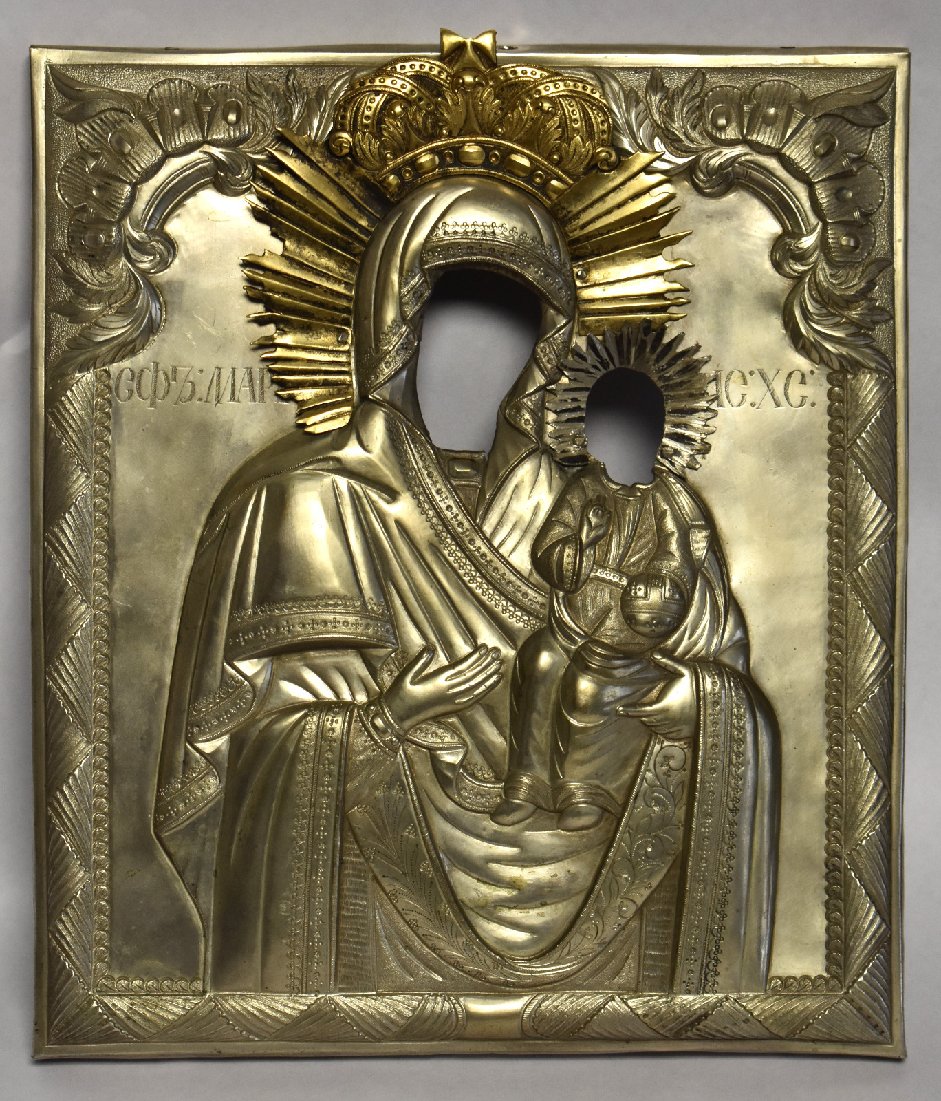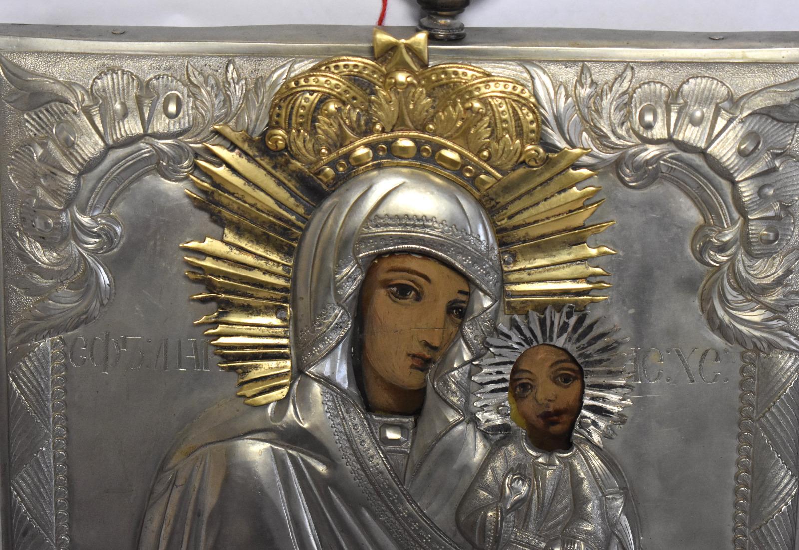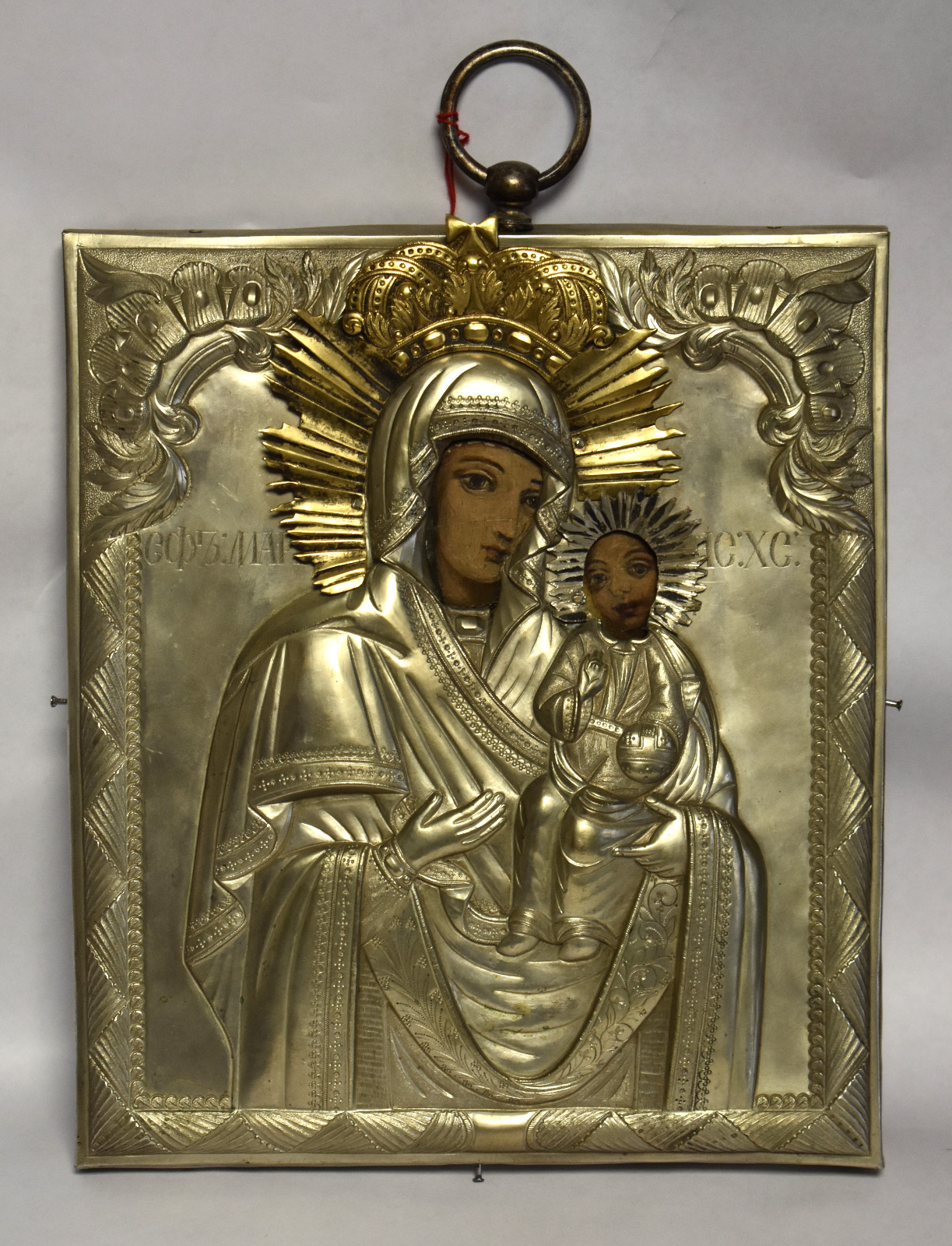 Icoana este însoțită de ferecătură (riza) metalică argintată, bogat ornamentată, cu relief puternic, aureole decorativ gravate și motive florale specifice perioadei. Riza se fixează peste icoană, lăsând vizibile chipurile Maicii și ale Pruncului, protejând în același timp pictura de dedesubt.