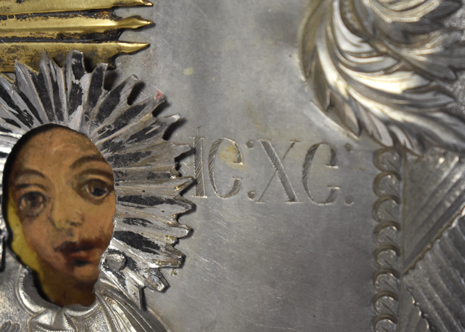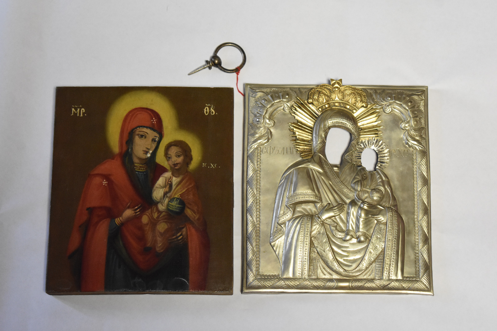 Stare de conservare conform foto. Lipsă un braț al crucii de pe coroana Maicii Domnului - vezi foto!