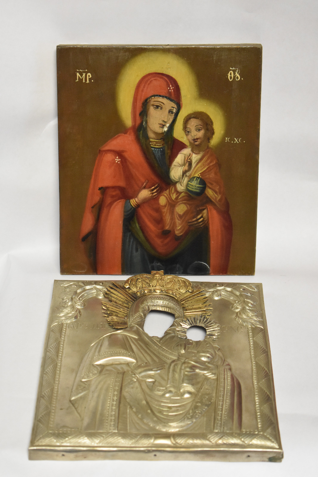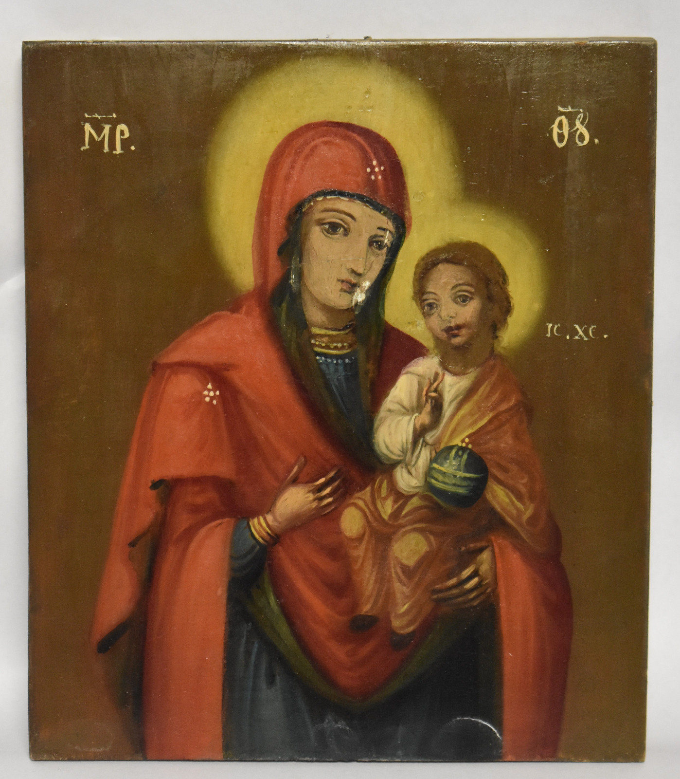 Icoană ortodoxă veche, datată aproximativ în jurul anului 1900, realizată în tehnică tradițională pe lemn, reprezentând pe Maica Domnului cu Pruncul Iisus (tipul iconografic "Hodighitria"). Lucrarea prezintă pictura originală, în stil bizantin, cu chipurile modelate în straturi fine de culoare, aureole aurite și cromatică specifică atelierelor românești și balcanice de la sfârșitul secolului XIX – începutul secolului XX.