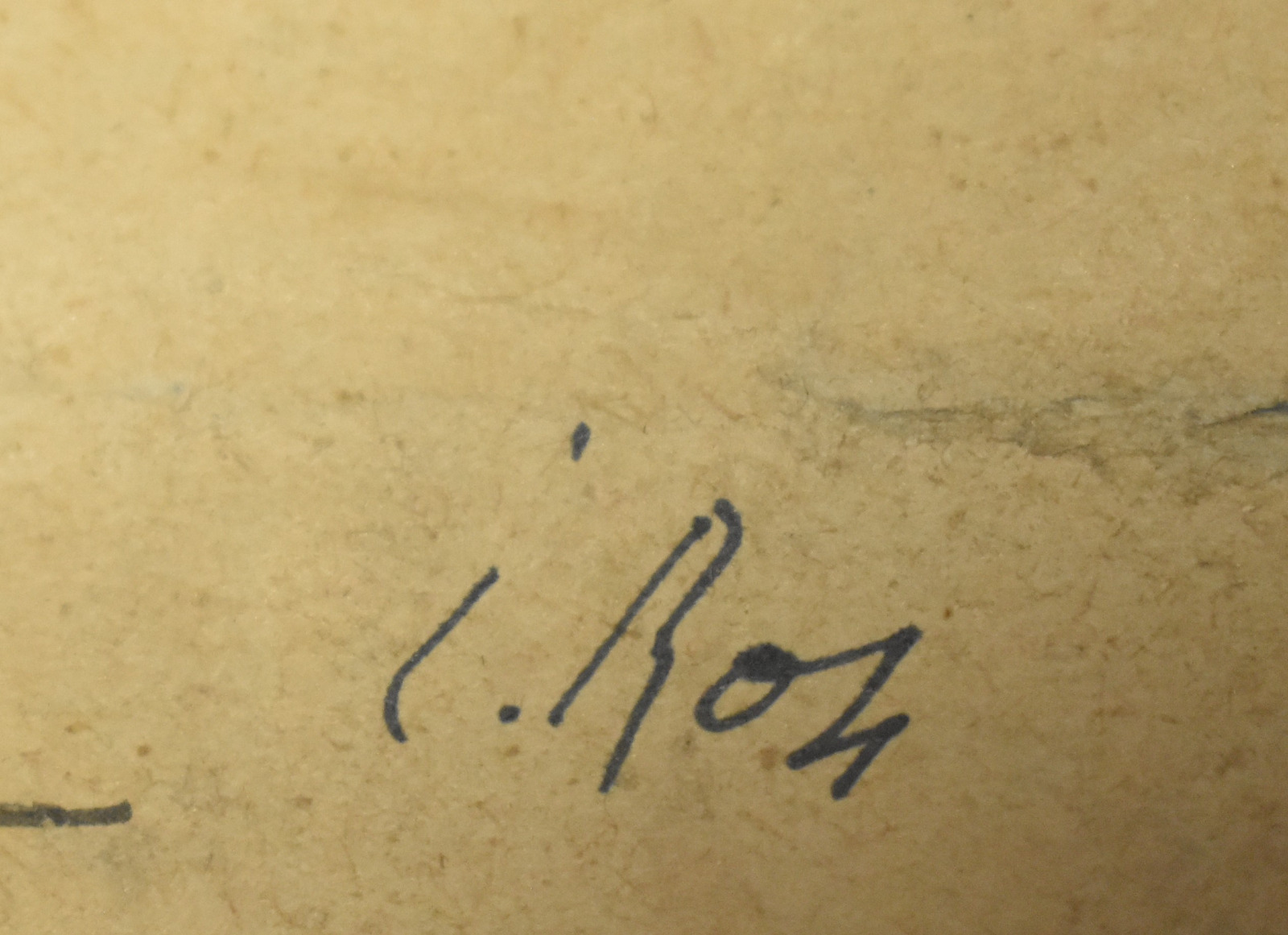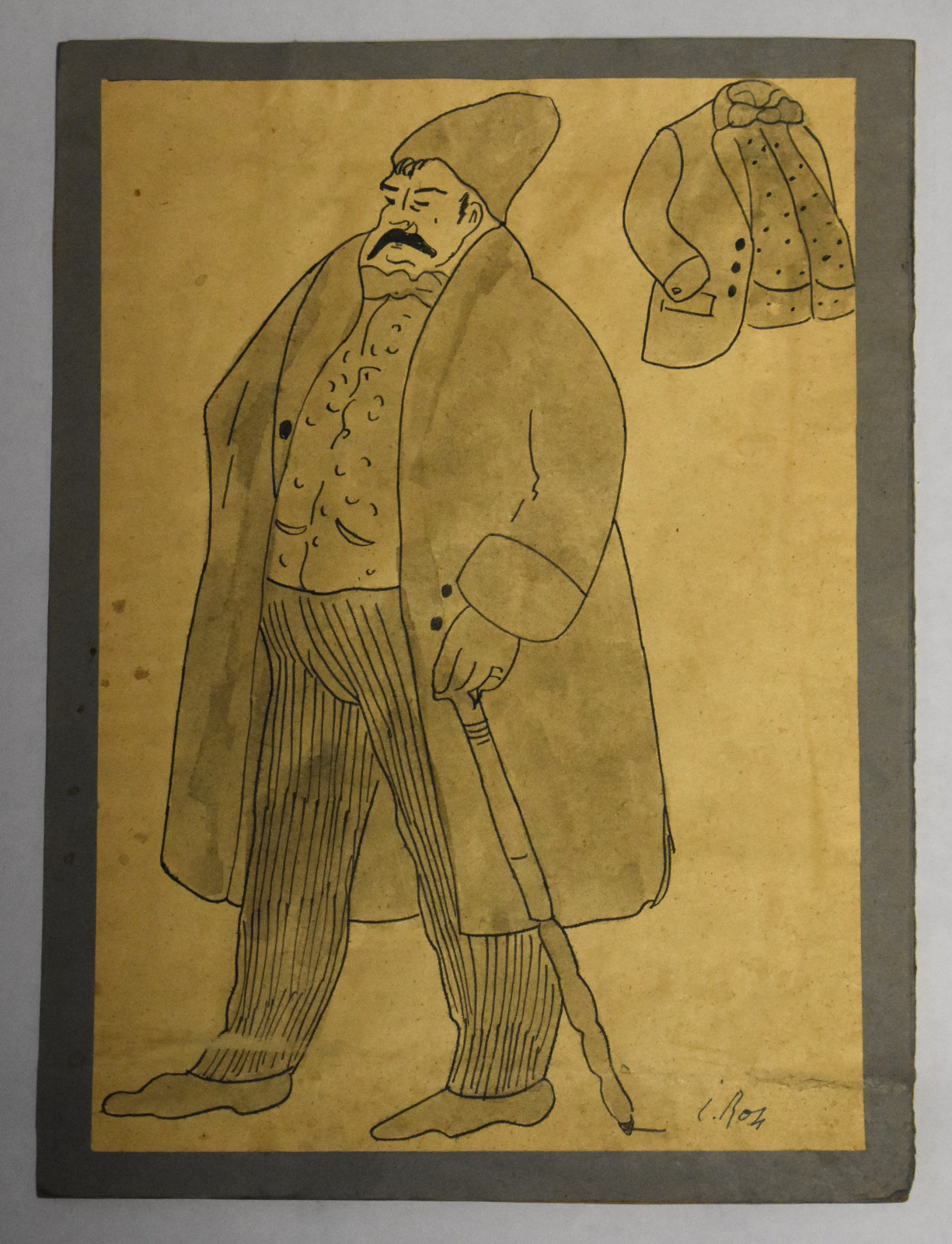 Lucrare grafică semnată de Iosif Ross, important grafician și caricaturist român al secolului XX, cunoscut pentru stilul său satiric, expresiv și pentru precizia liniei. Caricatura reprezintă un bărbat îmbrăcat cu palton, căciulă și baston, redat prin tușe sigure, contur accentuat și detalii stilizate.