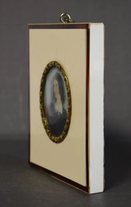 Miniatura este încadrată într-o ramă originală din fildeș, specifică epocii Biedermeier, cu passpartout deschis și montaj de epocă, păstrând sistemul original de agățare. Finețea ramei completează caracterul intim și prețios al lucrării, destinată inițial colecțiilor private sau cabinetelor burgheze.