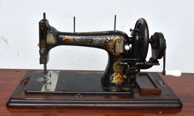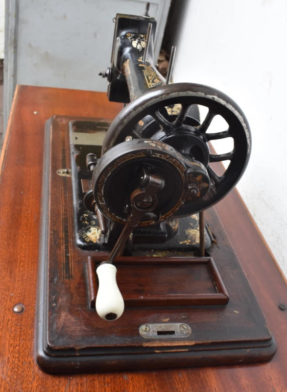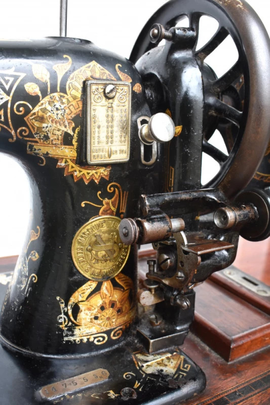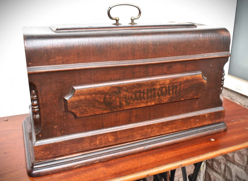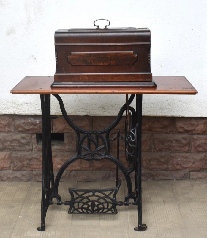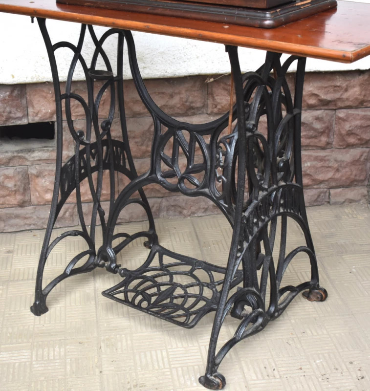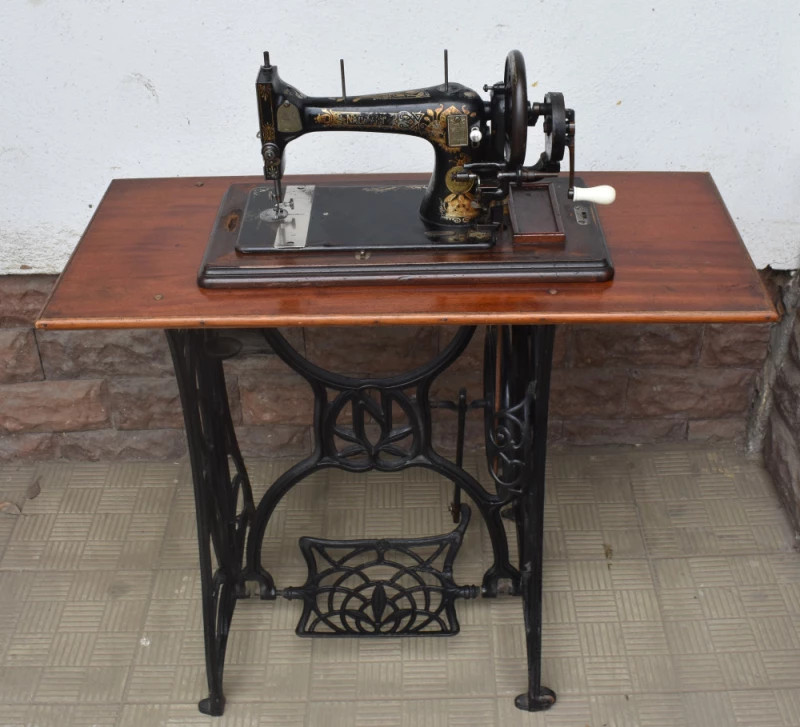 Mașină de cusut veche Naumann, piesă originală germană fabricată în Dresda, la începutul secolului XX, recunoscută pentru precizia mecanică și durabilitatea excepțională. Modelul este montat pe cadru din fontă turnată, cu pedală originală, și are blat din lemn masiv, păstrat într-o stare bună, cu patină autentică.