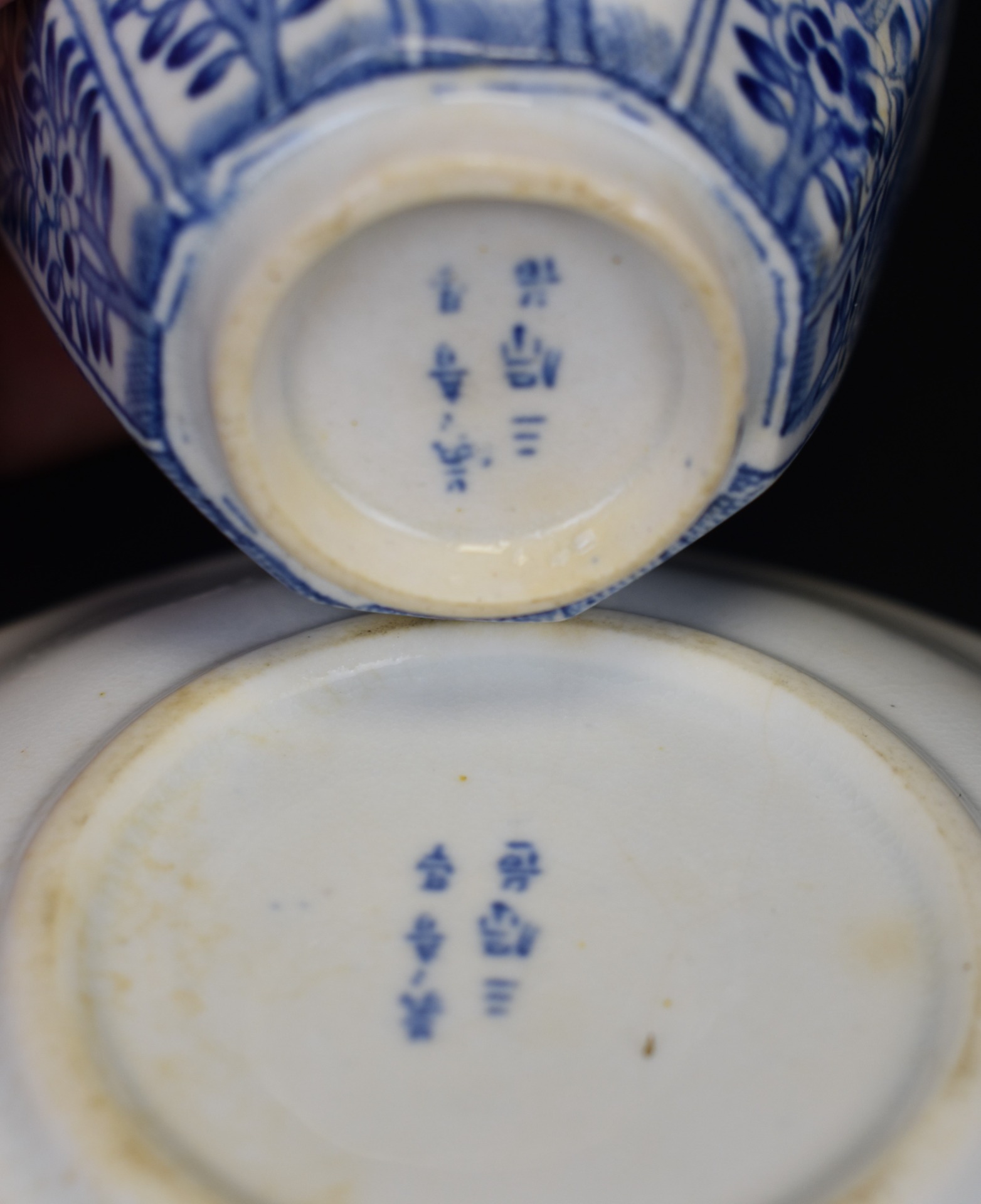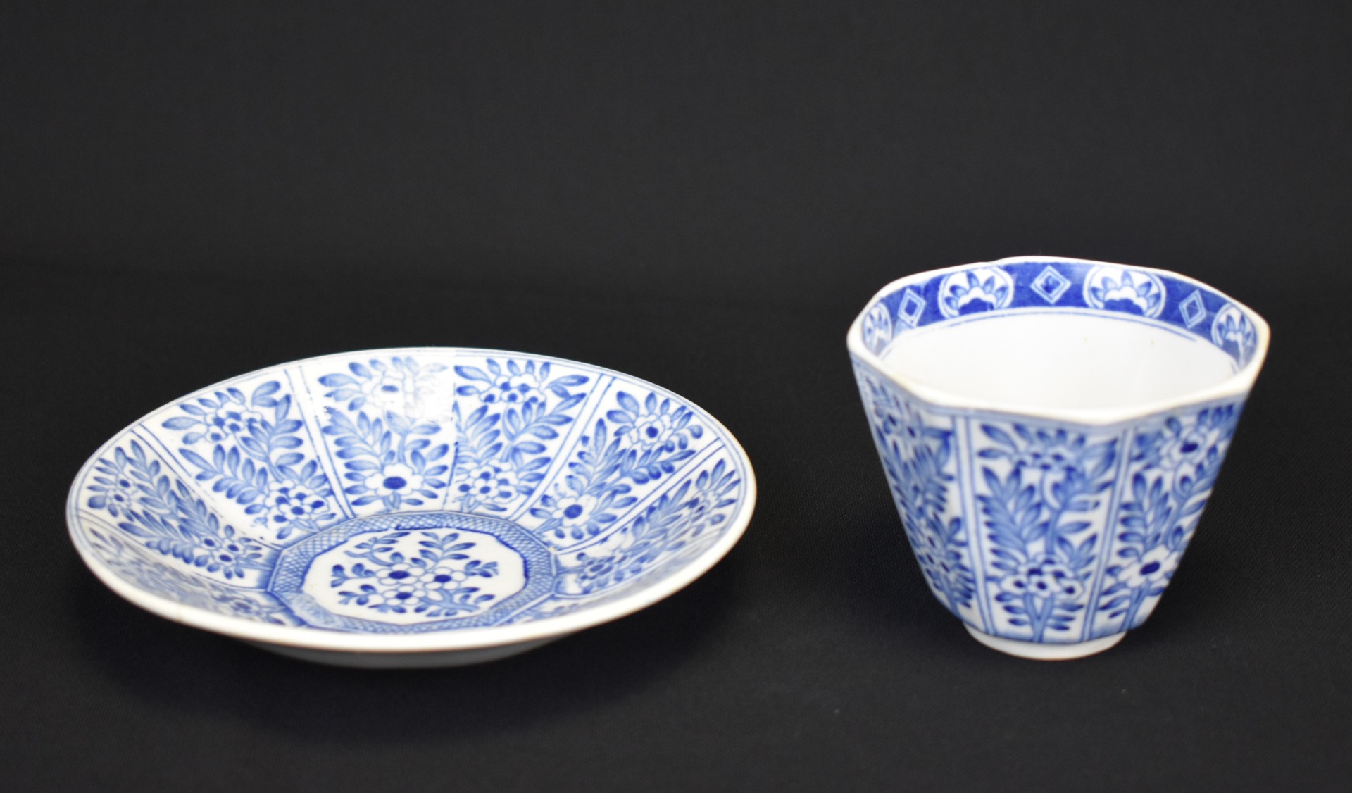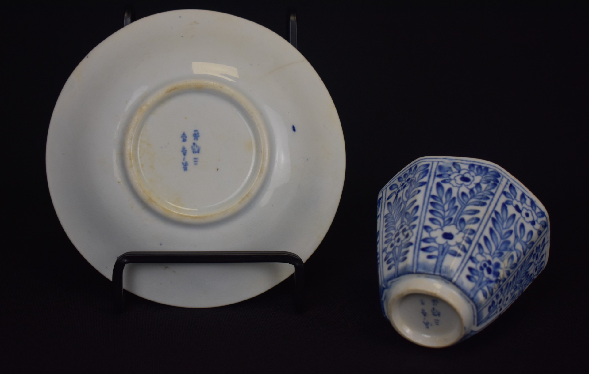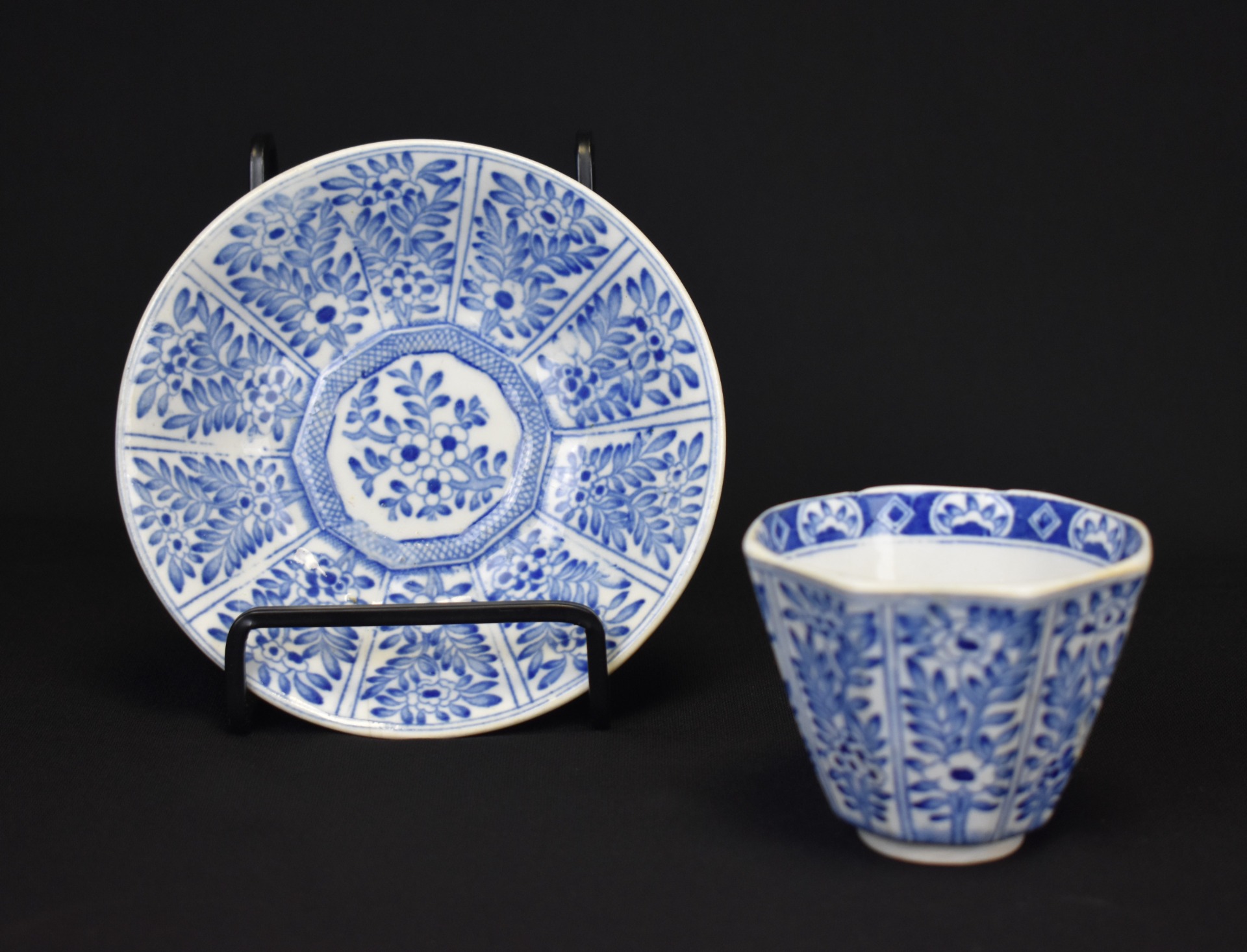 Acest ansamblu delicat din porțelan Arita, realizat în perioada Meiji (1868–1912), aparține uneia dintre cele mai respectate tradiții ceramice japoneze, apreciată în egală măsură în Japonia și în Europa fin-de-siècle. Decorul albastru subglazur, executat manual, desfășoară un motiv vegetal stilizat, ordonat radial pe farfurioară și armonizat cu decorul ceștii, într-un echilibru perfect între rigoare și poezie decorativă.