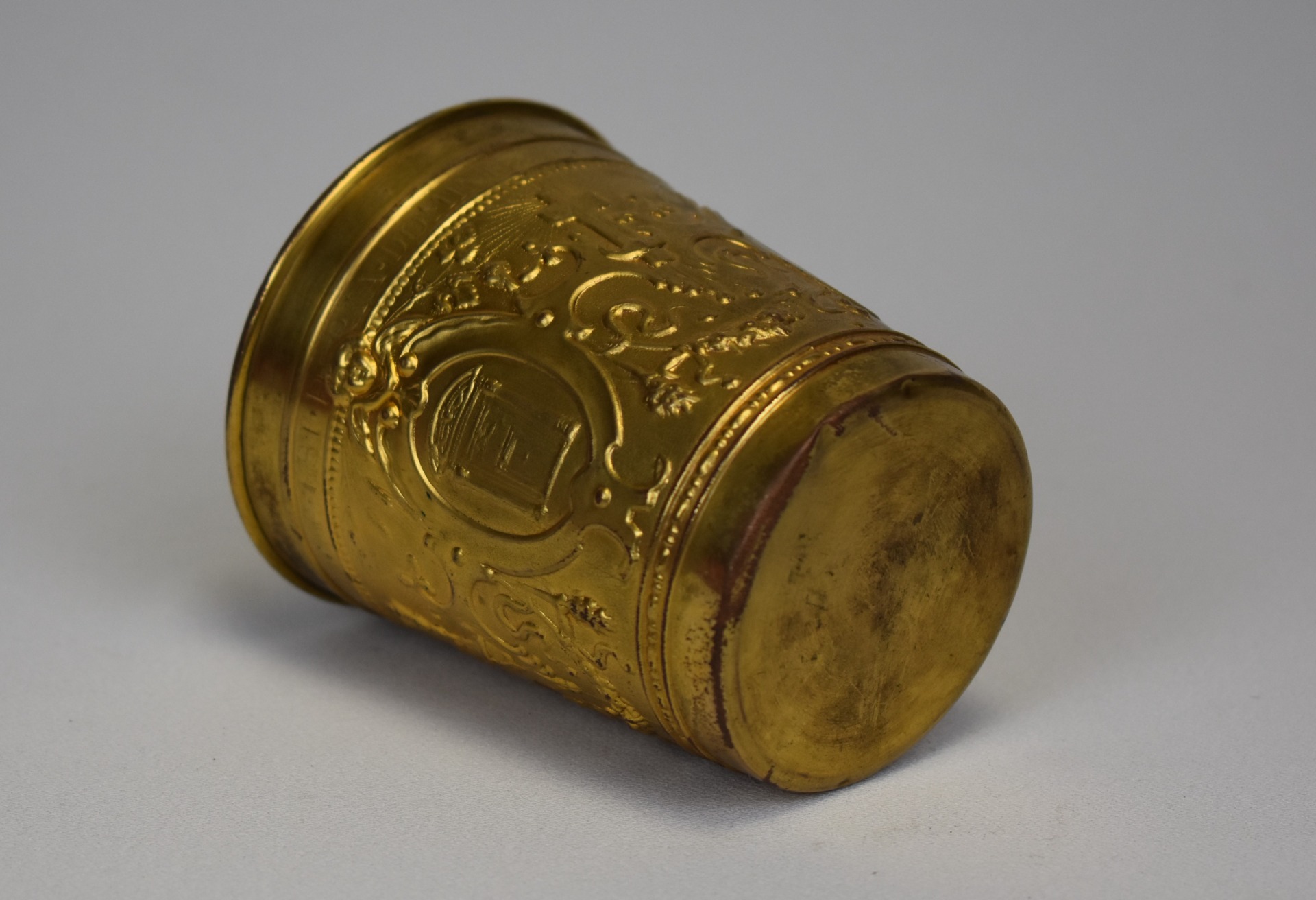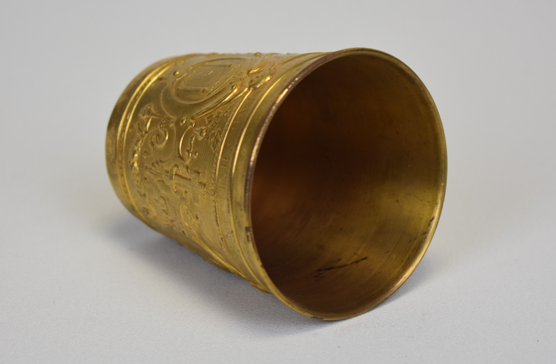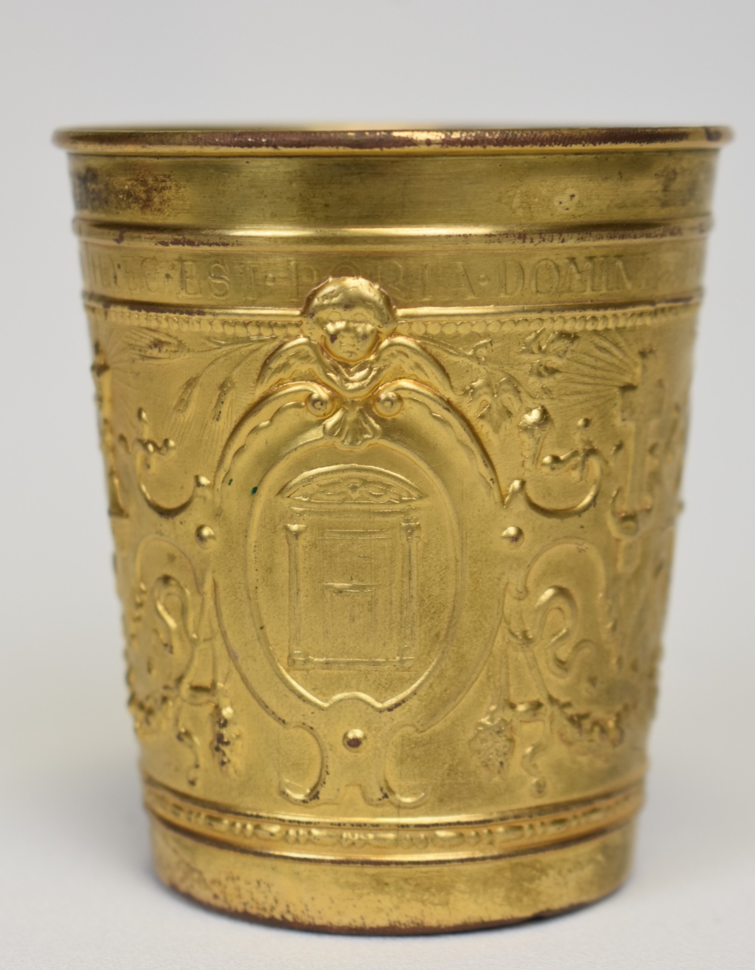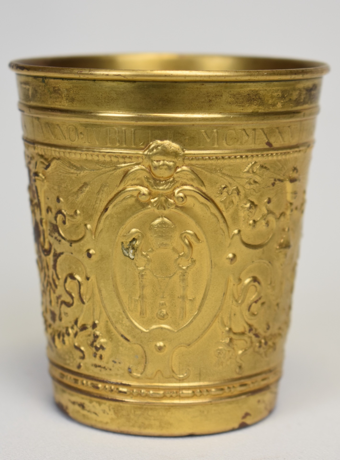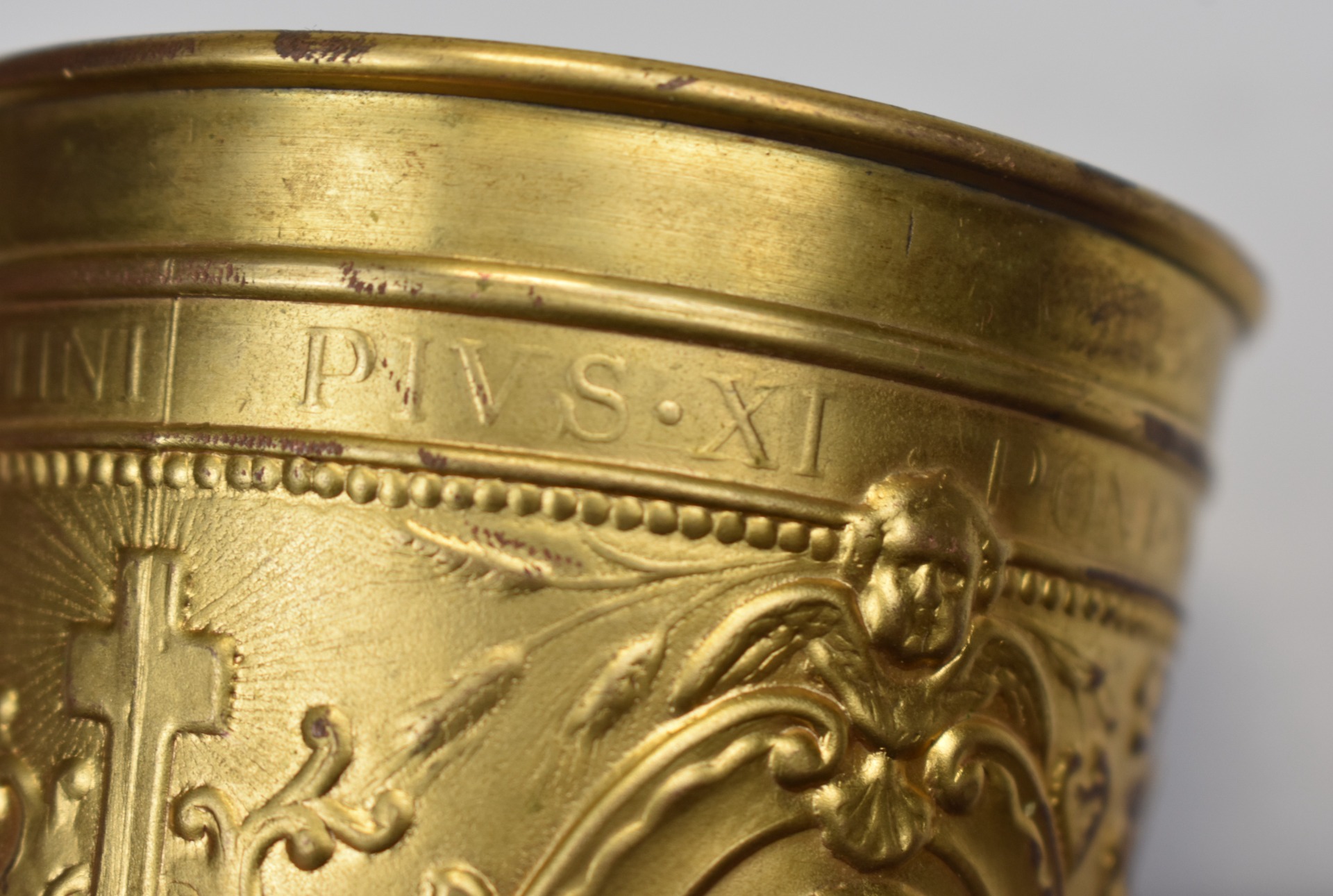 Acest pahar suvenir catolic din anul 1925 este o mărturie materială a devoțiunii și a artei decorative religioase din prima jumătate a secolului XX. Realizat din metal galben (alamă / aliaj cu aspect aurit), paharul este bogat reliefat cu ornamente baroce și simboluri ecleziastice, având în centru medalionul cu portretul Papei Pius al XI-lea, redat în profil, latinizat și solemn.