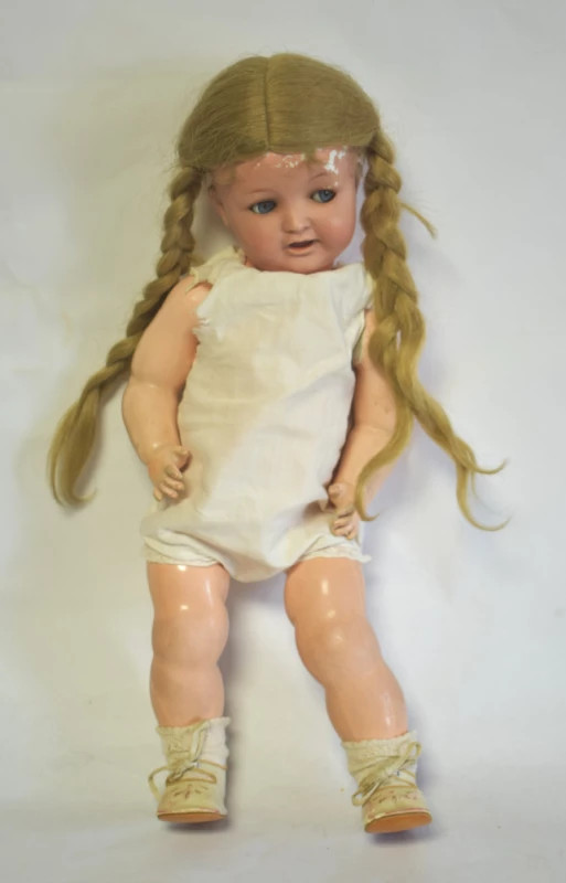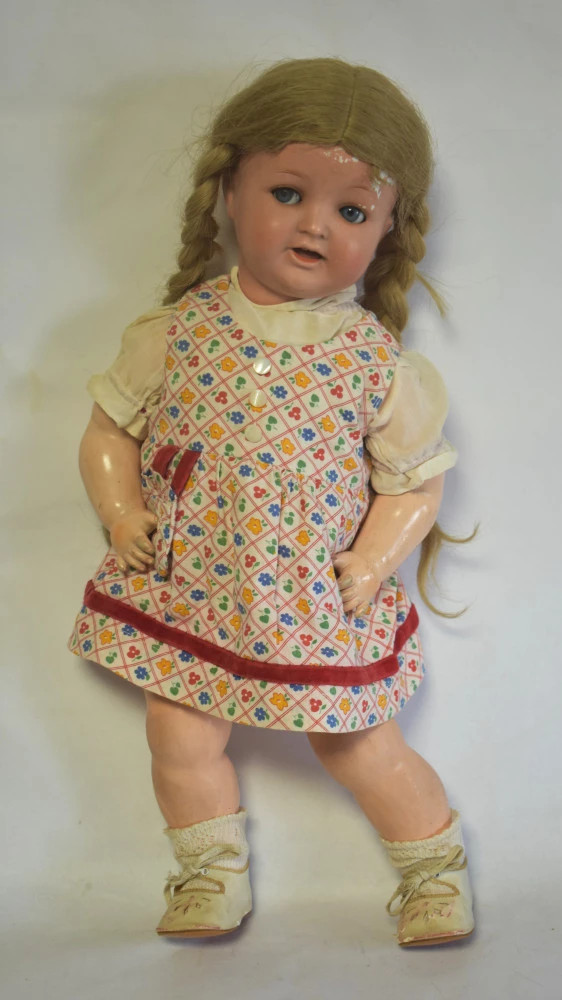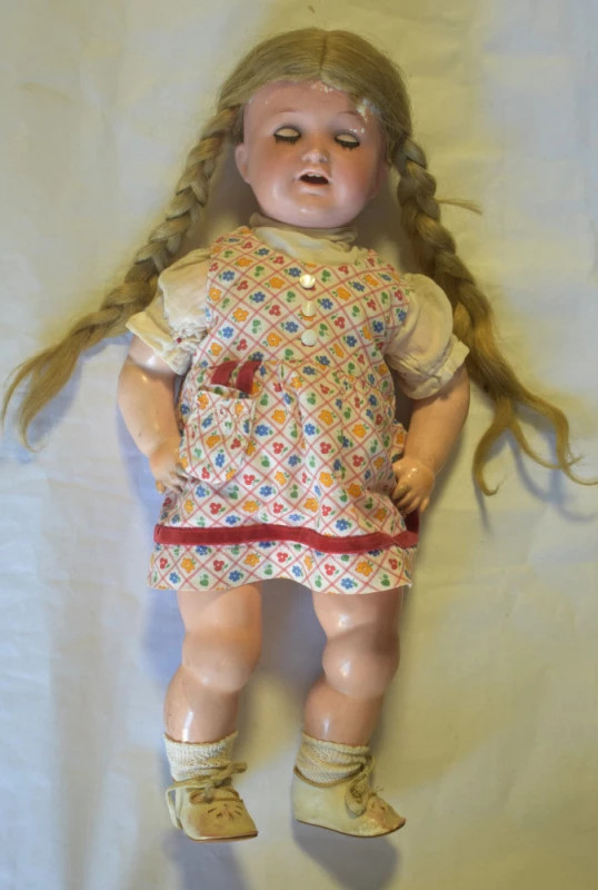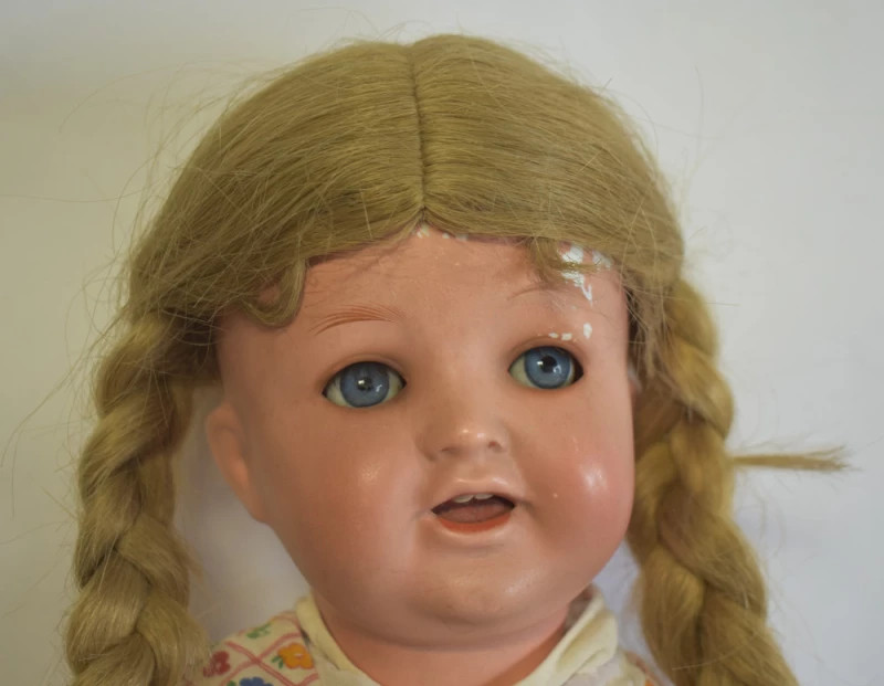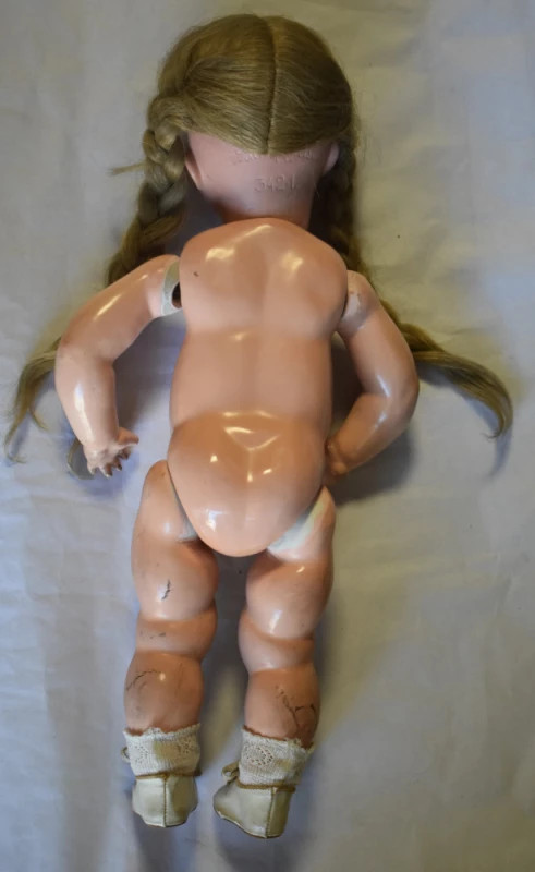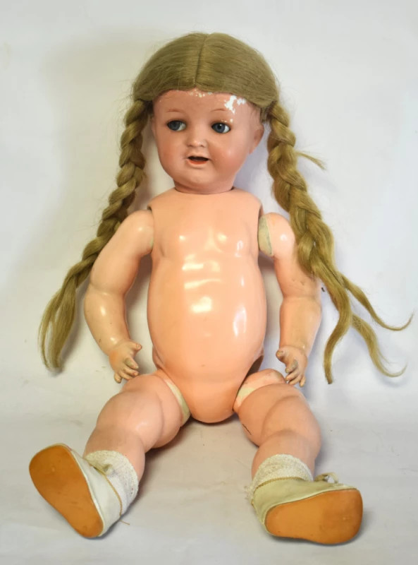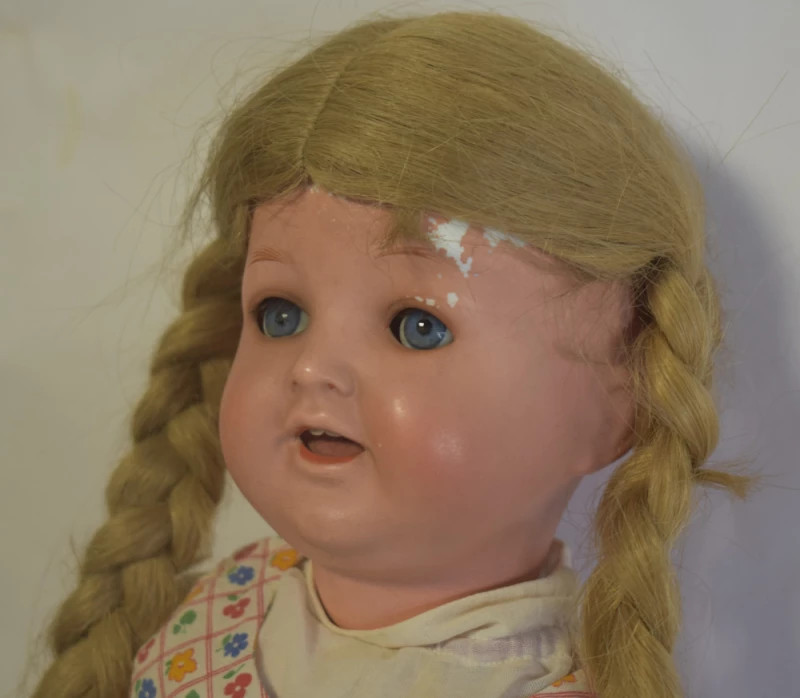 Capul din porțelan este montat pe corp articulat, iar părul natural împletit completează aspectul delicat al păpușii. Îmbrăcămintea originală sau de epocă adaugă farmec și autenticitate ansamblului. Piesa este destinată colecționarilor și iubitorilor de jucării vechi, fiind o prezență caldă și nostalgică într-o vitrină de colecție.