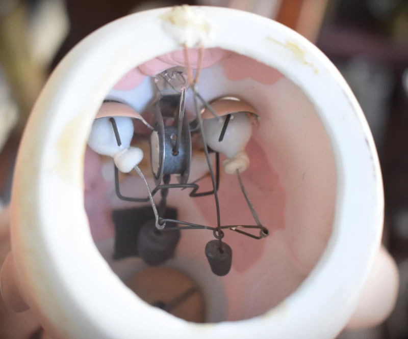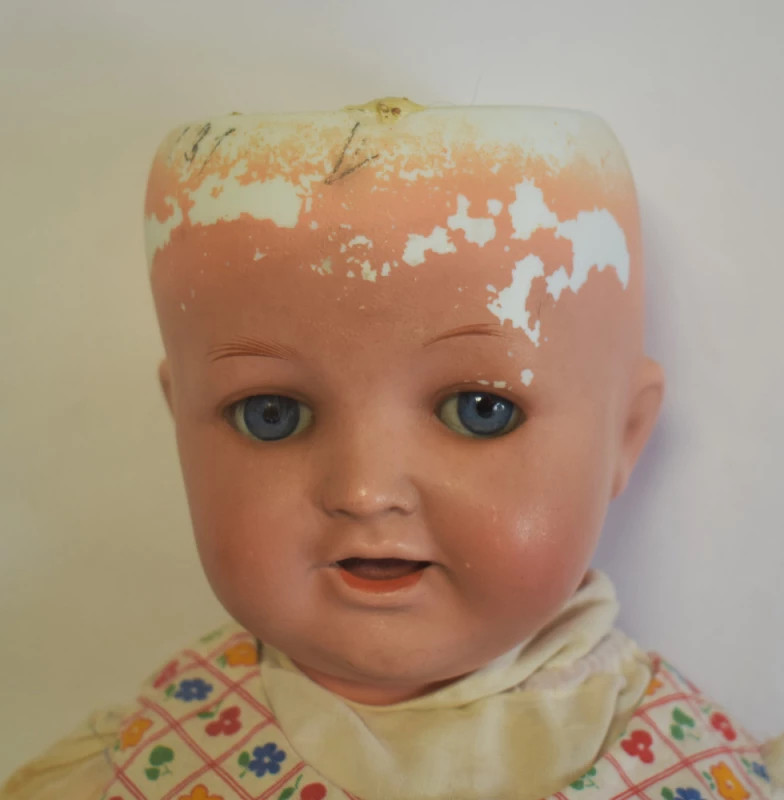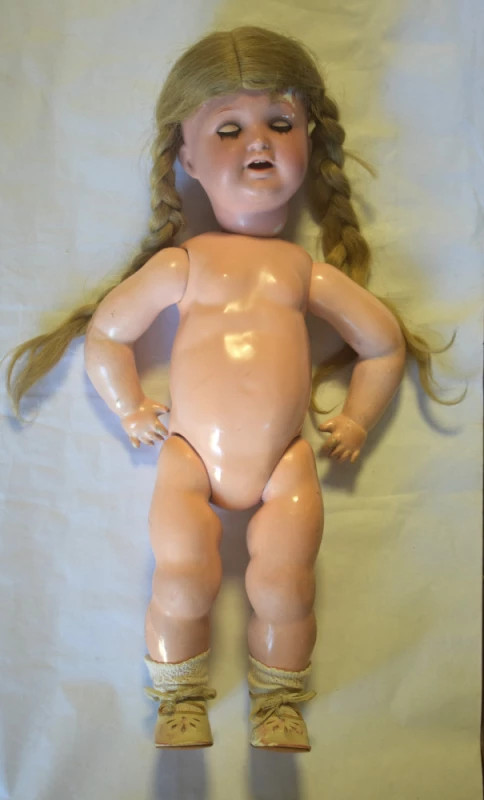 Păpușă germană autentică, realizată de renumitul atelier Heubach Koppelsdorf, model 342-1, recunoscut pentru calitatea portretistică a capetelor din porțelan. Chipul expresiv, cu ochi albaștri și buze ușor întredeschise, este modelat fin și glazurat, reflectând standardele înalte ale producției germane de păpuși de la începutul secolului XX.