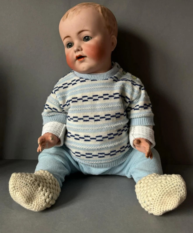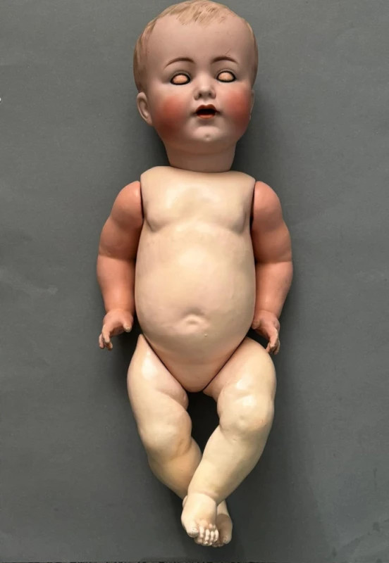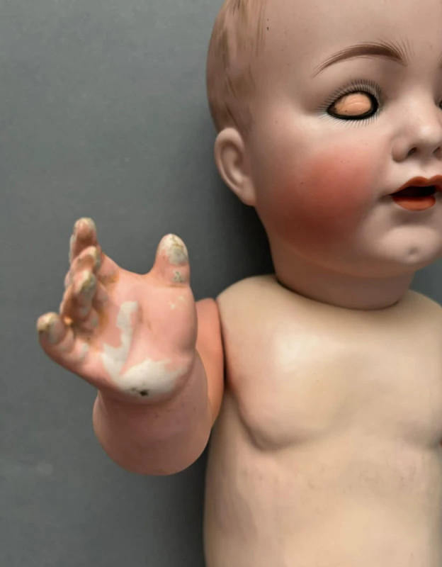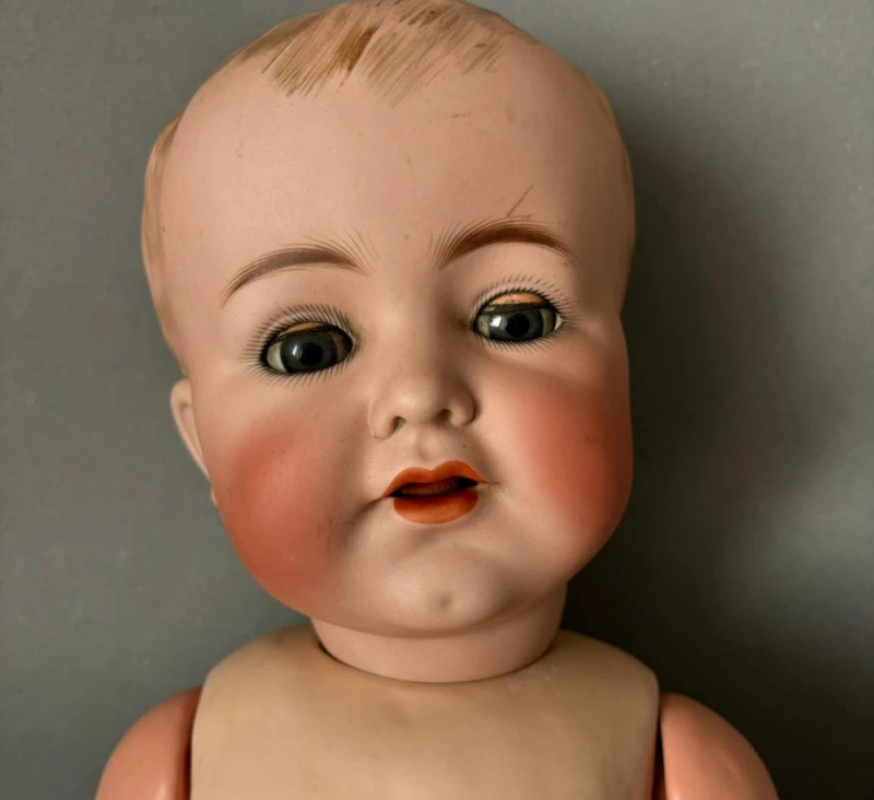 Păpușă veche de colecție, realizată între 1902–1920 de renumitele manufacturi germane Simon & Halbig și Kämmer & Reinhardt, două dintre cele mai apreciate case de producție din epoca de aur a păpușilor din porțelan.
