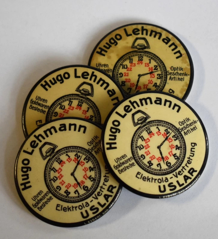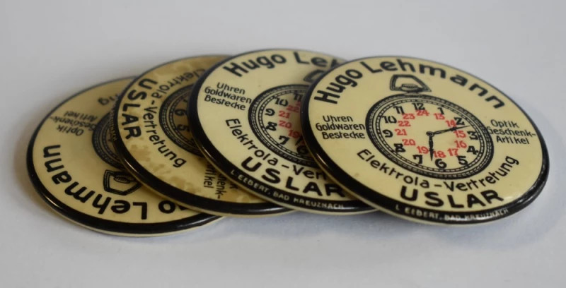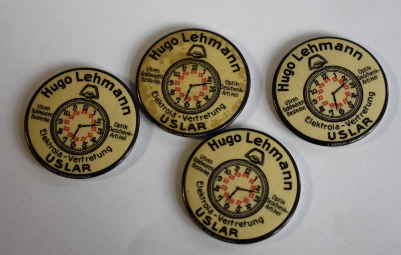 Acest set rar de patru oglinzi publicitare originale păstrează farmecul autentic al vitrinelor de ceasornicărie din Germania interbelică. Inscripționate cu numele Hugo Lehmann – Uhren & Optik, Uslar, oglinzile sunt martori discreți ai unei epoci în care publicitatea însemna eleganță tipografică, claritate și încredere în meșteșug.