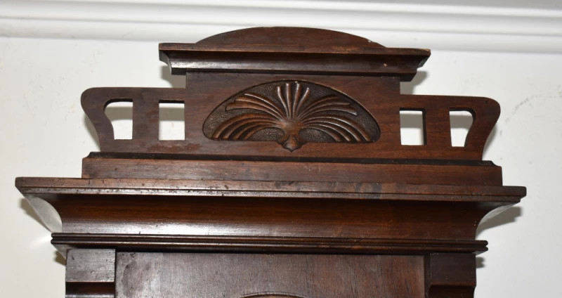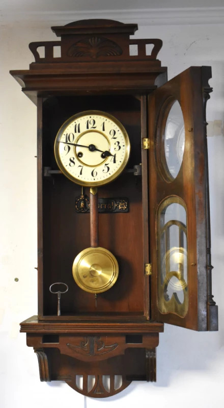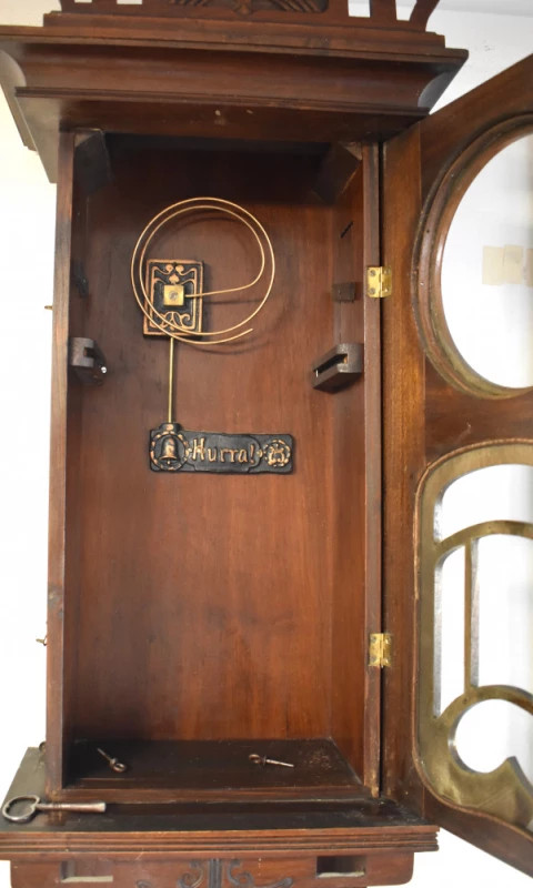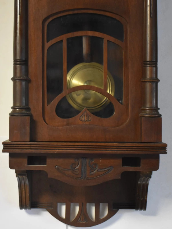 Pendulă elegantă produsă de prestigioasa firmă germană Kienzle, realizată în jurul anului 1900, într-o carcasă rafinată din lemn masiv sculptat în stil Art Nouveau / Jugendstil. Piesa se remarcă prin liniile fluide, elementele decorative curbilinii și motivele inspirate din natură, specifice esteticii Belle Époque.