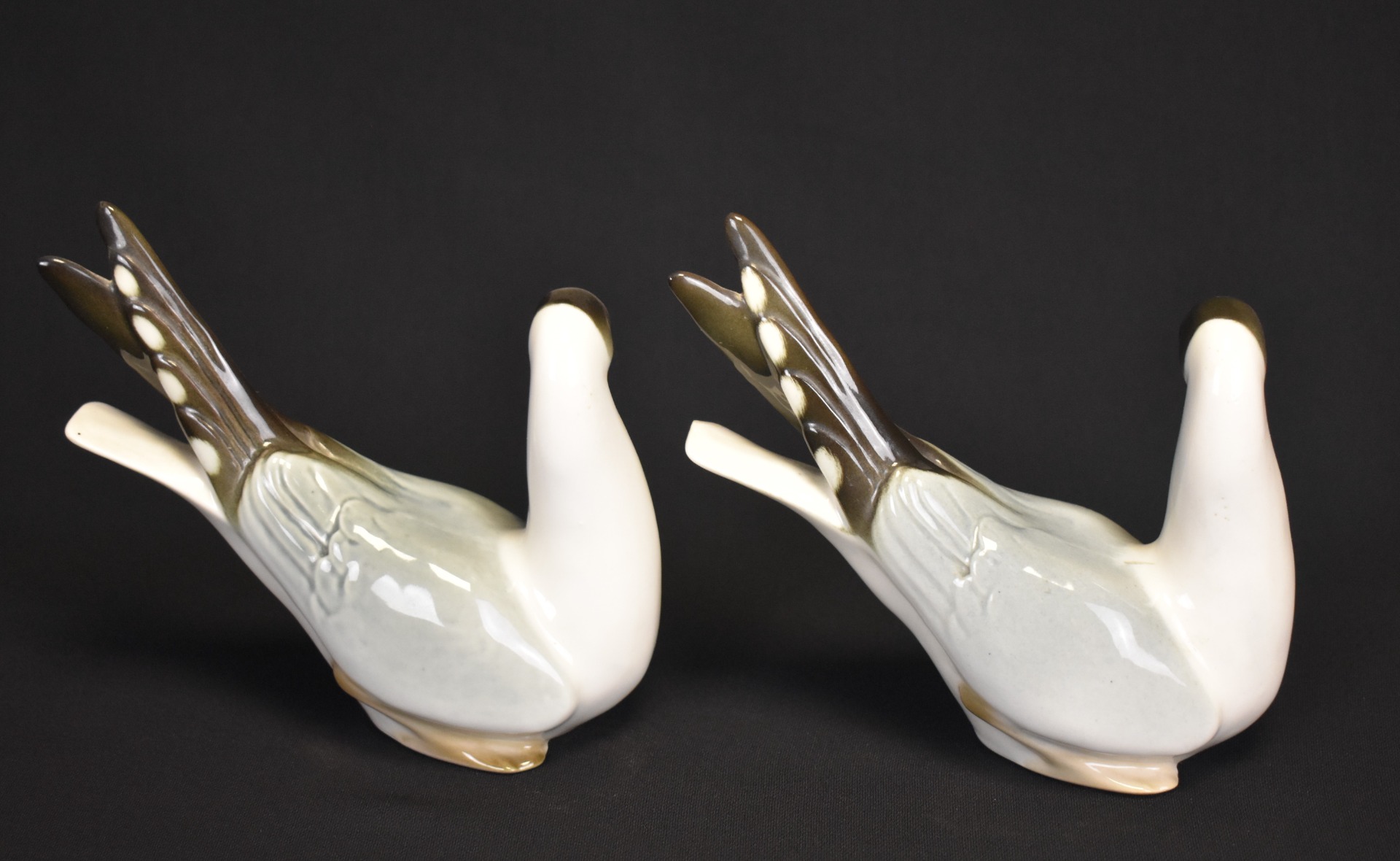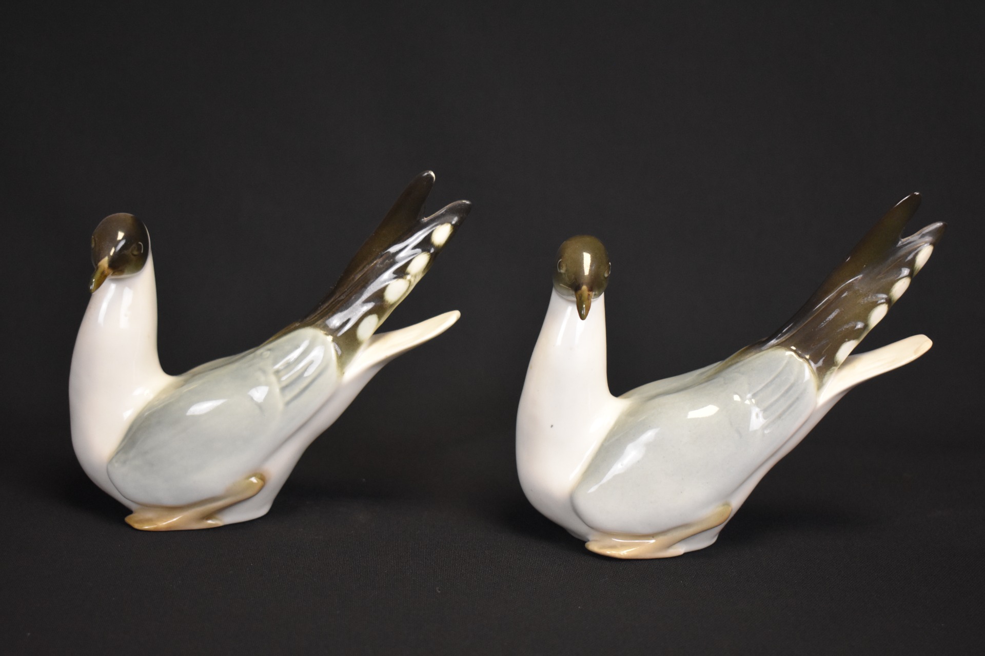 Figurinele reprezintă pescăruși stilizați, redați într-o poziție naturalistă, cu corpul alb-ivoriu, aripi nuanțate în tonuri de gri și negru lucios și detalii fine ale capului și ciocului. Glazura este bine aplicată, cu un luciu uniform, specific porțelanului sovietic de calitate din secolul XX.