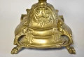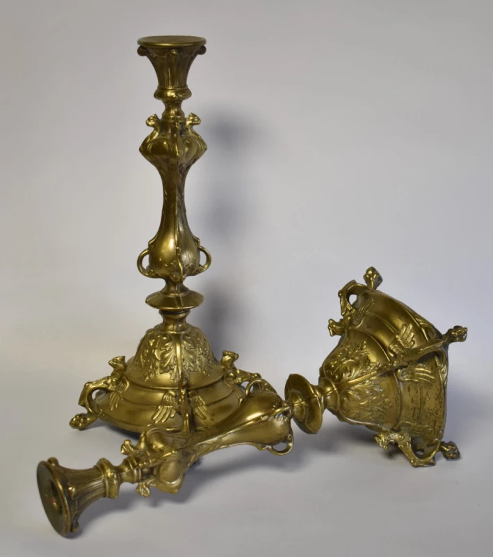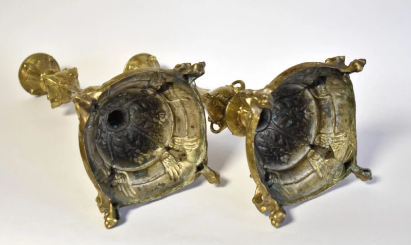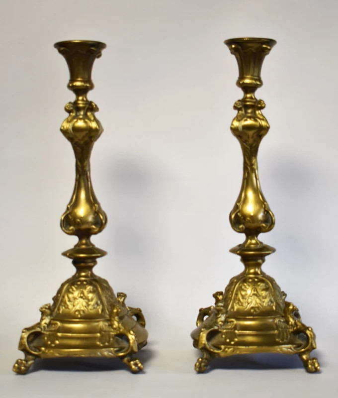 Pereche impresionantă de sfeșnice din alamă ambutisată, databile în secolul al XIX-lea, decorate cu un motiv rar și spectaculos: grifoni / vulturi stilizați, integrați atât în baza sculpturală, cât și în linia fluidă a corpului central.