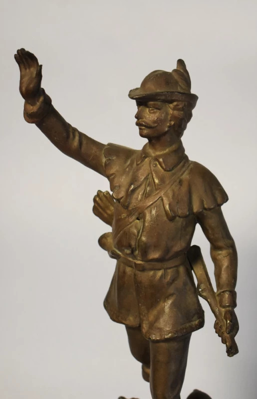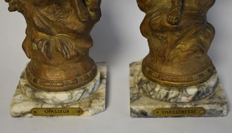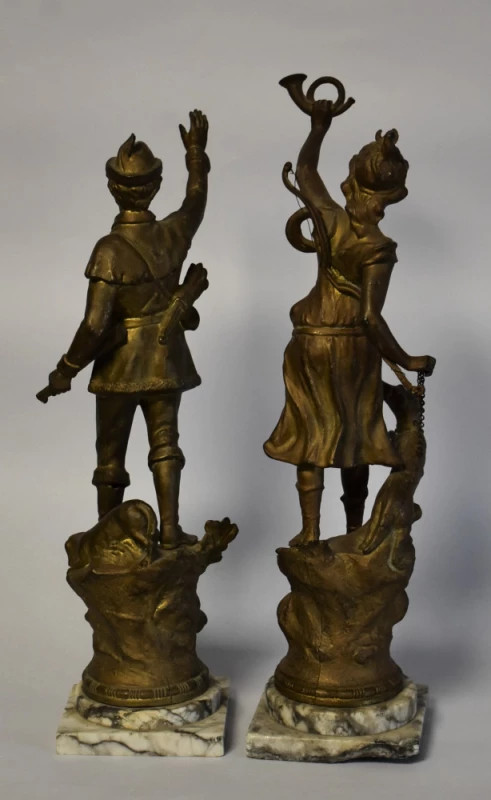 Set elegant de două statuete franțuzești, realizate în antimoniu patinat, datând din jurul anului 1900, reprezentând un vânător (Chasseur) și o vânătoriță (Chasseresse). Piesele sunt lucrate în stil Art Nouveau timpuriu, cu o atenție deosebită pentru detaliile costumelor, atitudinea personajelor și dinamica compoziției.